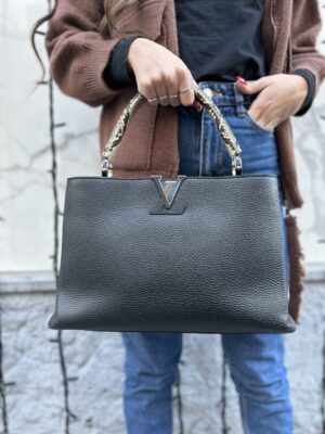 Borsa firmata Jacquemus, modello Le Bambino Mini, realizzata in pelle liscia nera e hardware dorato. Dotata di una patta frontale con chiusura a bottone calamitato, internamente rivestita in tela beige, capiente per l’essenziale. Munita di un manico rigido centrale per portata a mano e di una tracolla rimovibile e regolabile per una portata a spalla. Completa di dustbag, l’articolo si presenta in condizioni pari al nuovo.