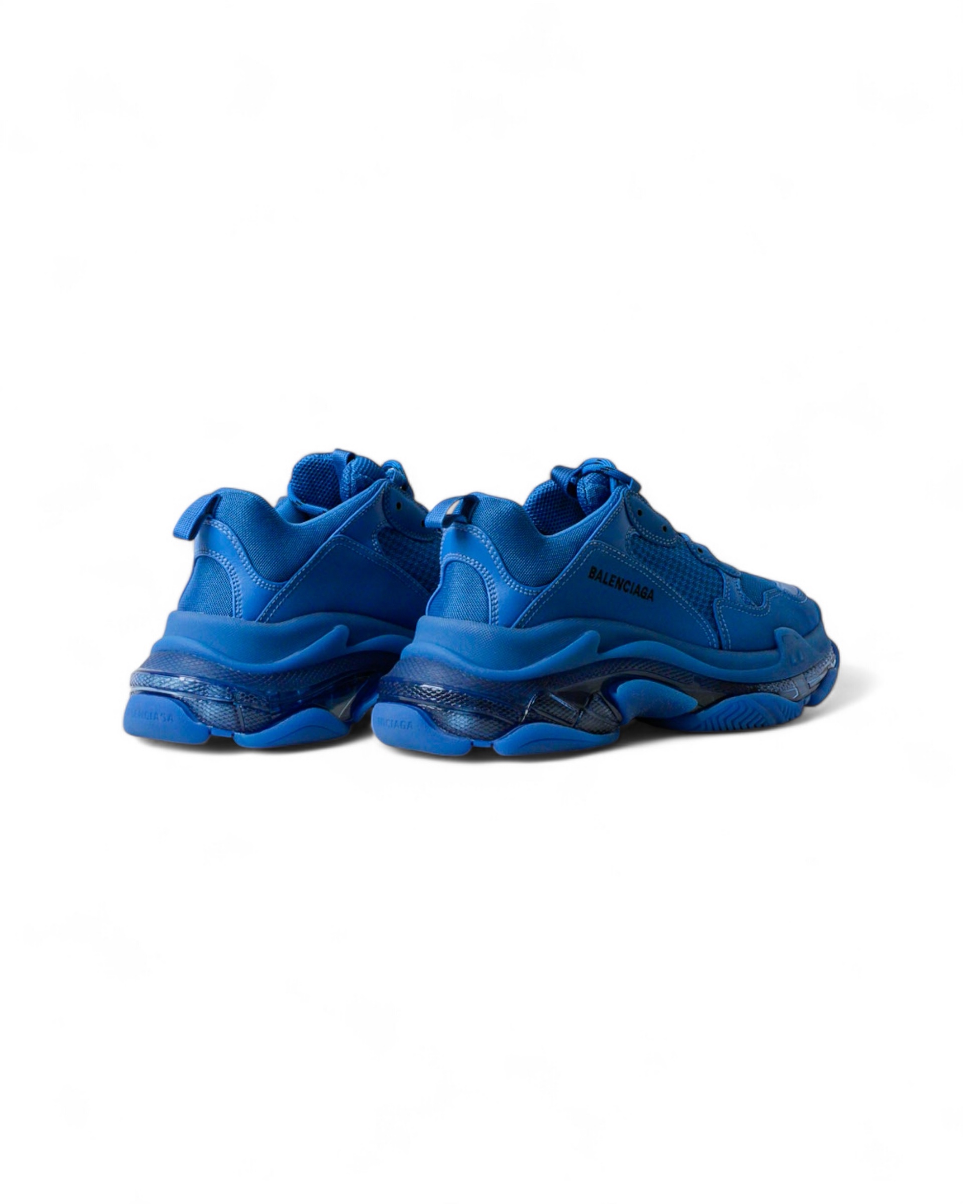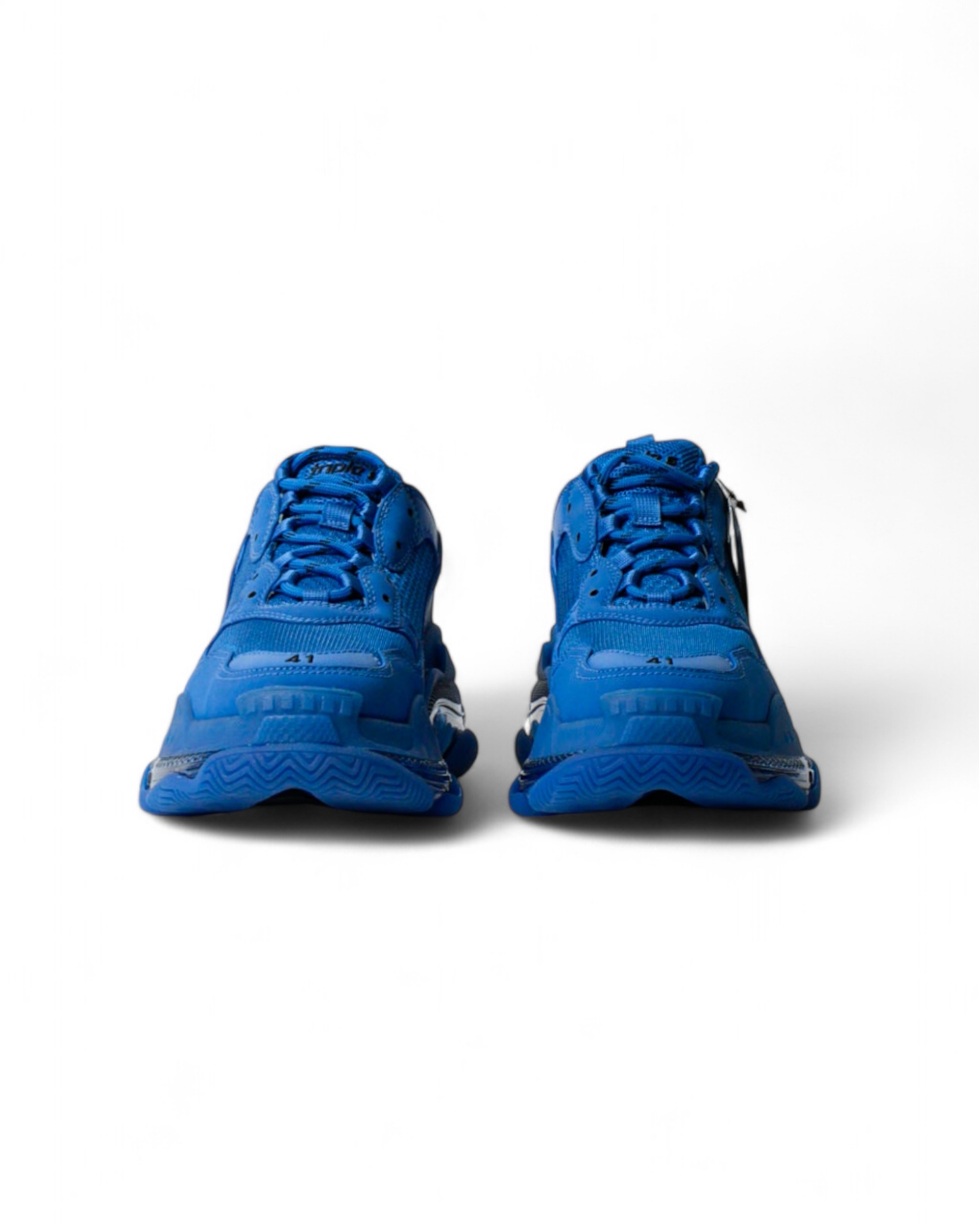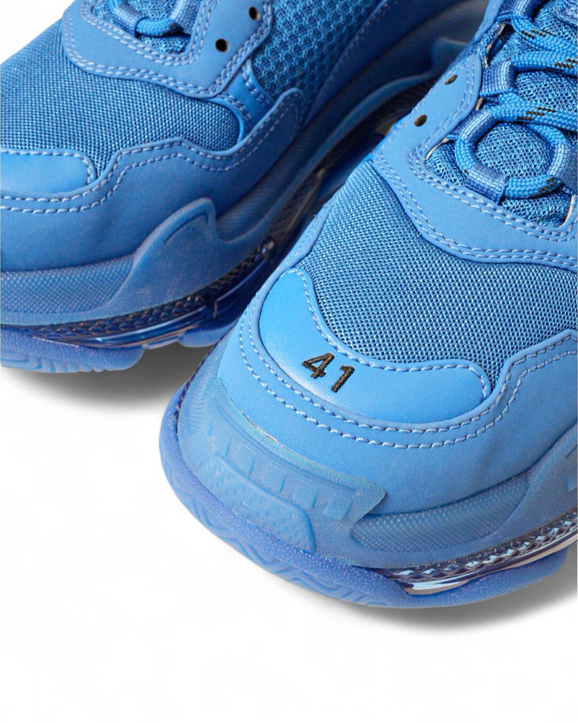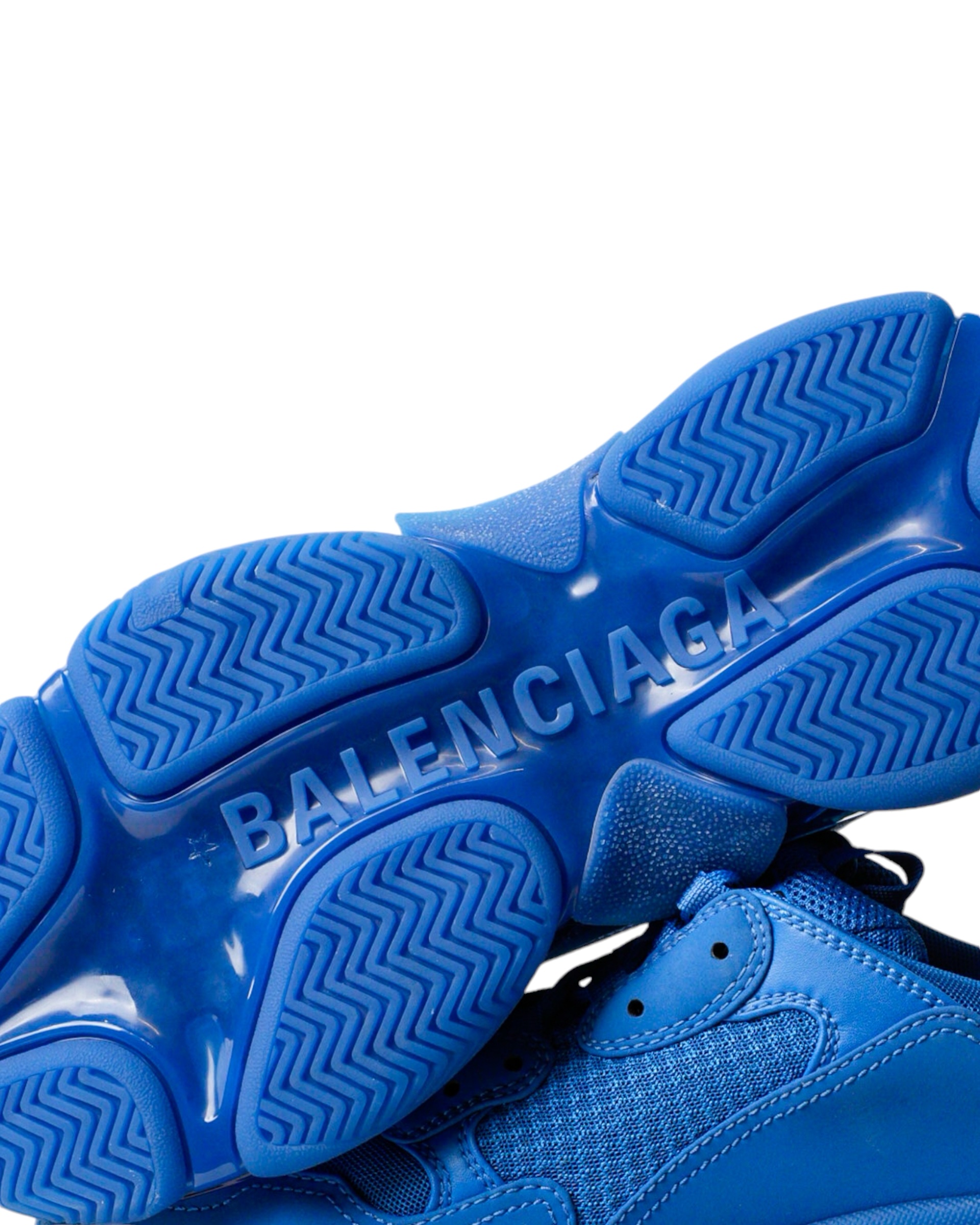 Sneakers firmate Balenciaga, modello Triple S, realizzate in tela e pelle nella colorazione blu acido. Dotate di una suola complessa a tre strati e sulla linguetta e impresso il logo “TripleS” in gomma. Munite di due passanti per lacci di cui uno funzionale. Complete di scatola, dustbag, misura 41IT. L’articolo si presenta in condizioni pari al nuovo.