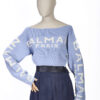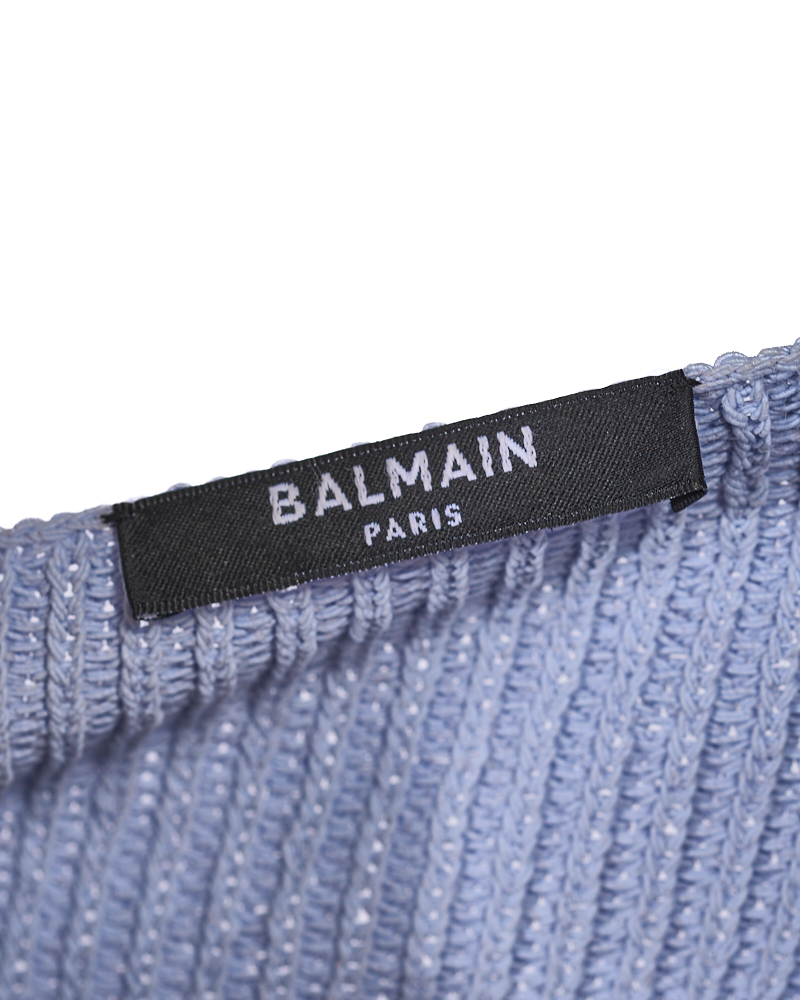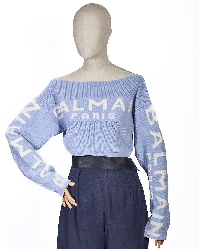 Pullover firmato Balmain, modello Crop, realizzato in Poliamide Azzurro con la classica stampa del brand bianca. Taglia 38/S IT. L’articolo si presenta in ottime condizioni.