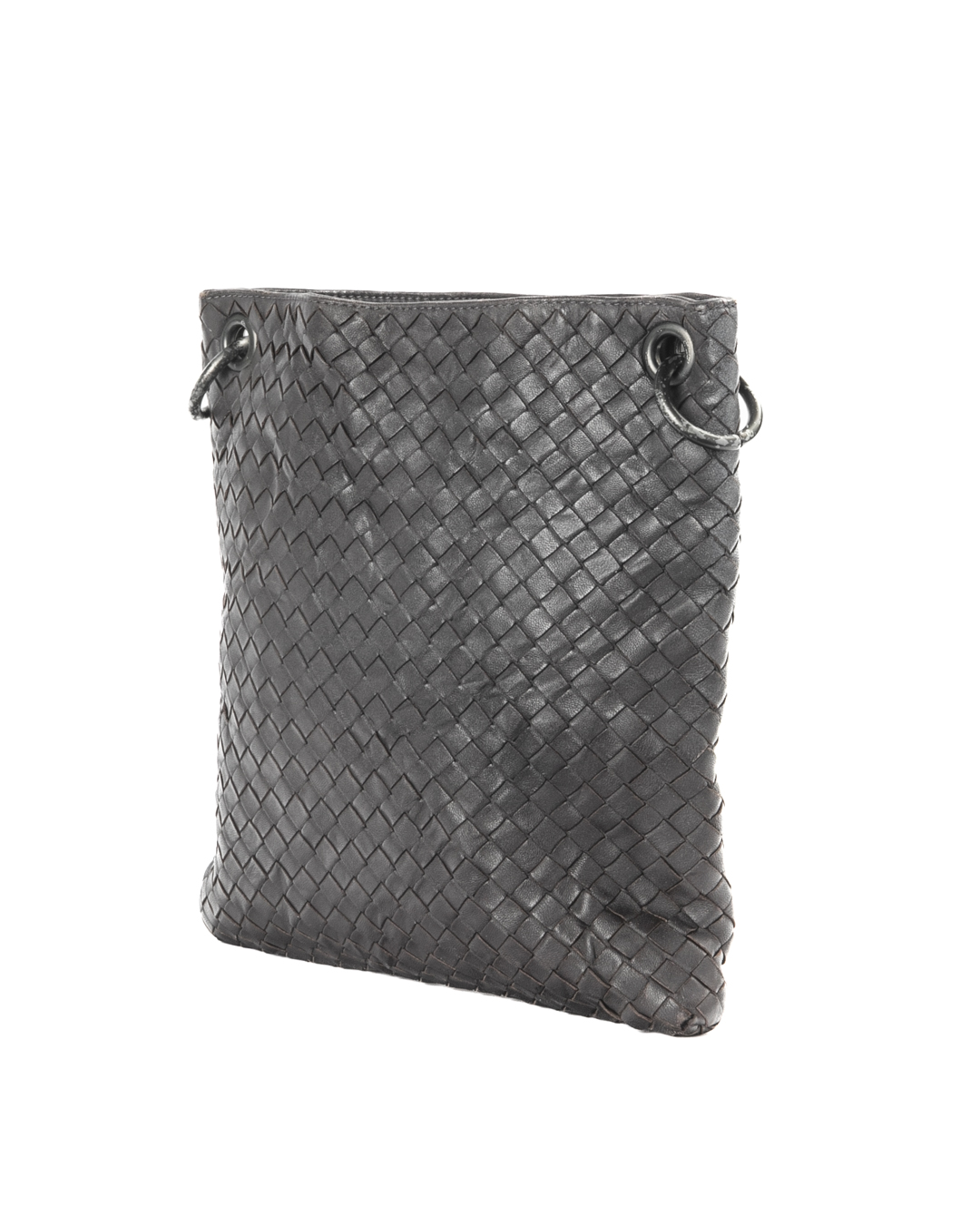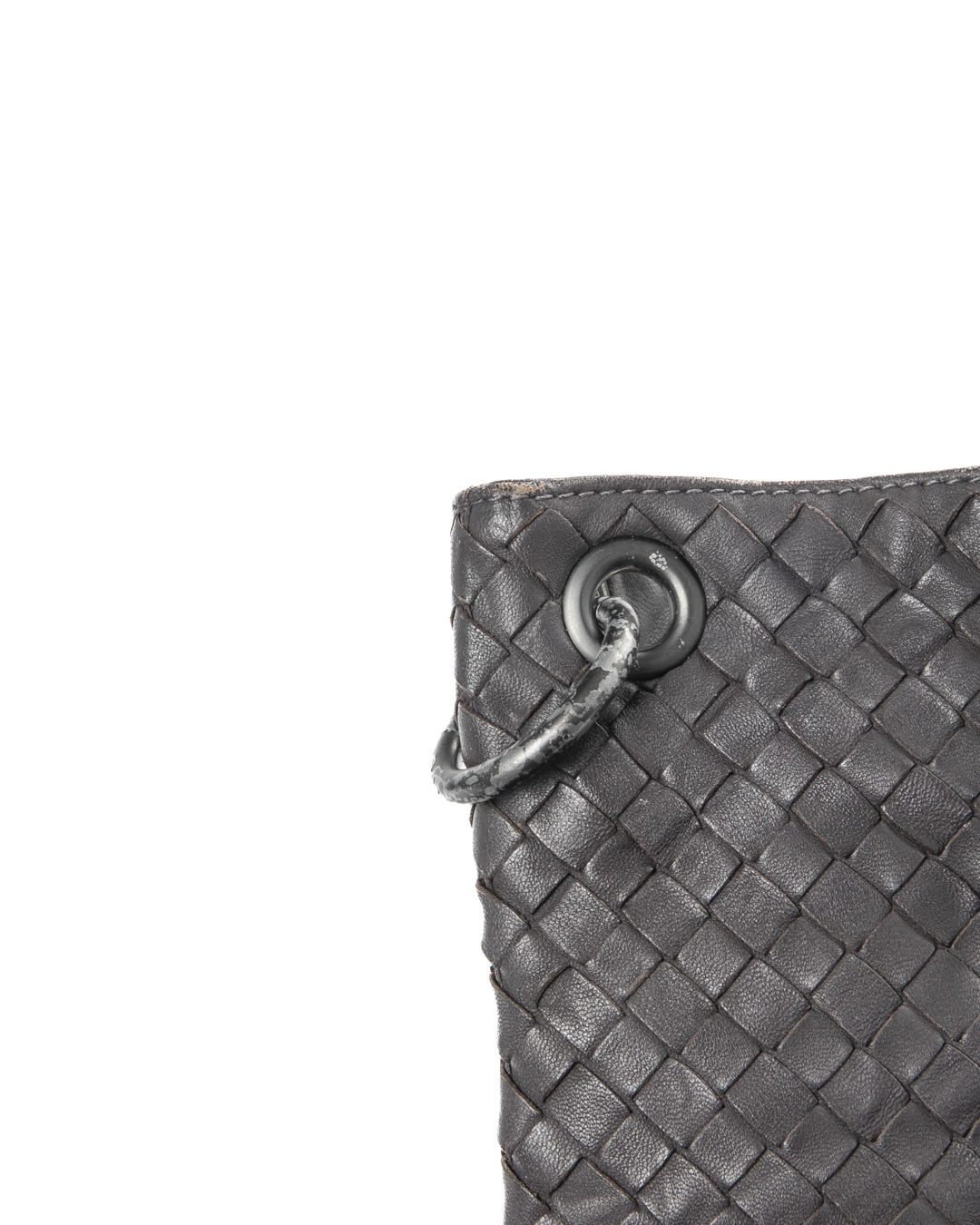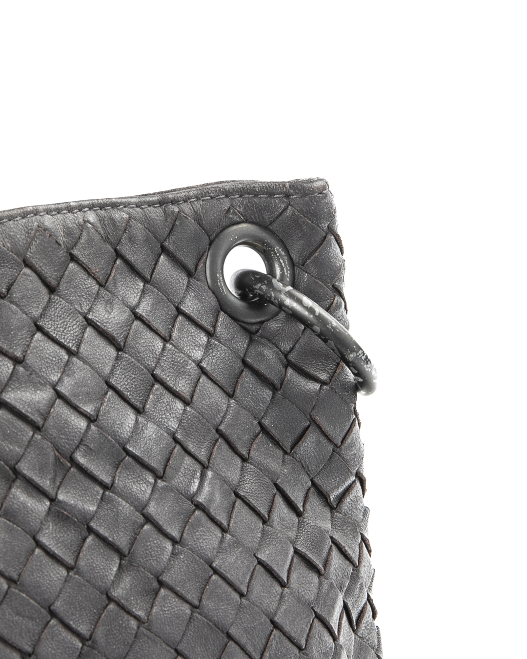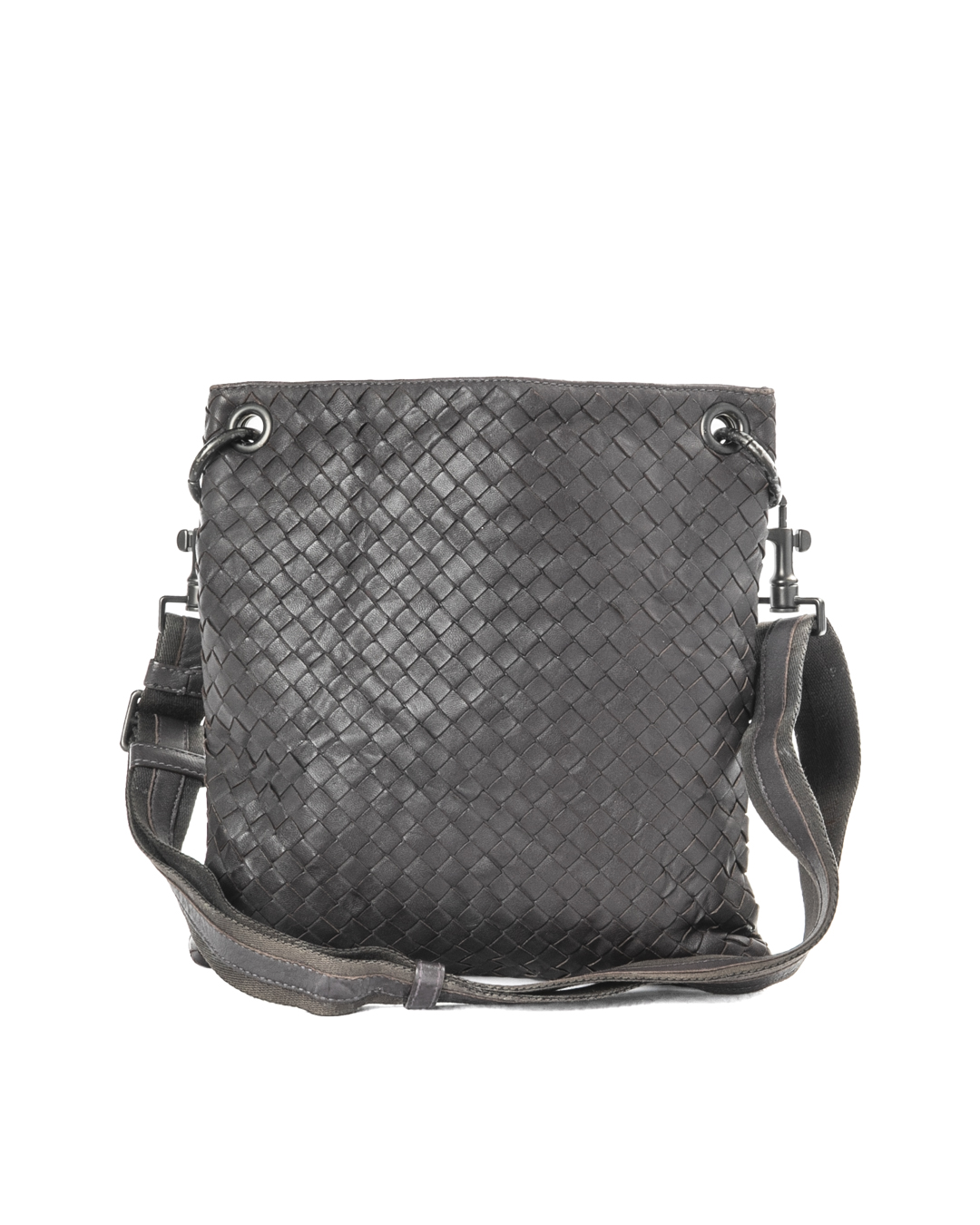 Borsa firmata Bottega Veneta, misura small, realizzata in pelle intrecciata viola con hardware argento. Non è dotata di nessuna chiusura, internamente rivestita in tela grigia con comoda tasca, la borsa è abbastanza capiente. Munita di una tracolla regolabile e rimovibile in tessuto, per una comoda portata a spalla o a tracolla. L'articolo si presenta in buone condizioni, con segni di usura visibili in foto.