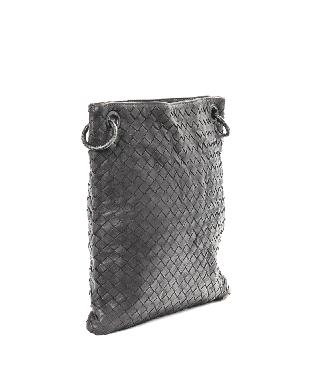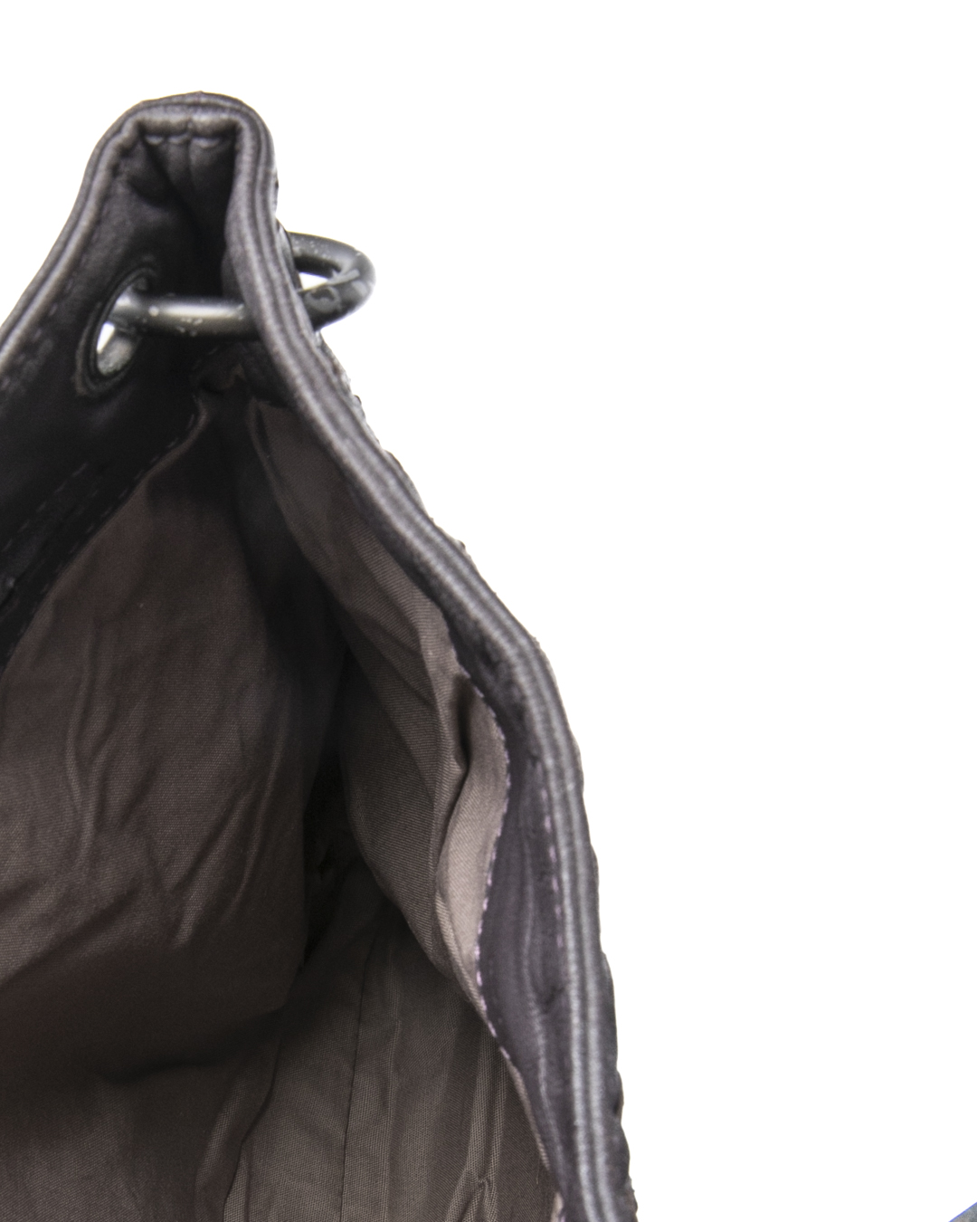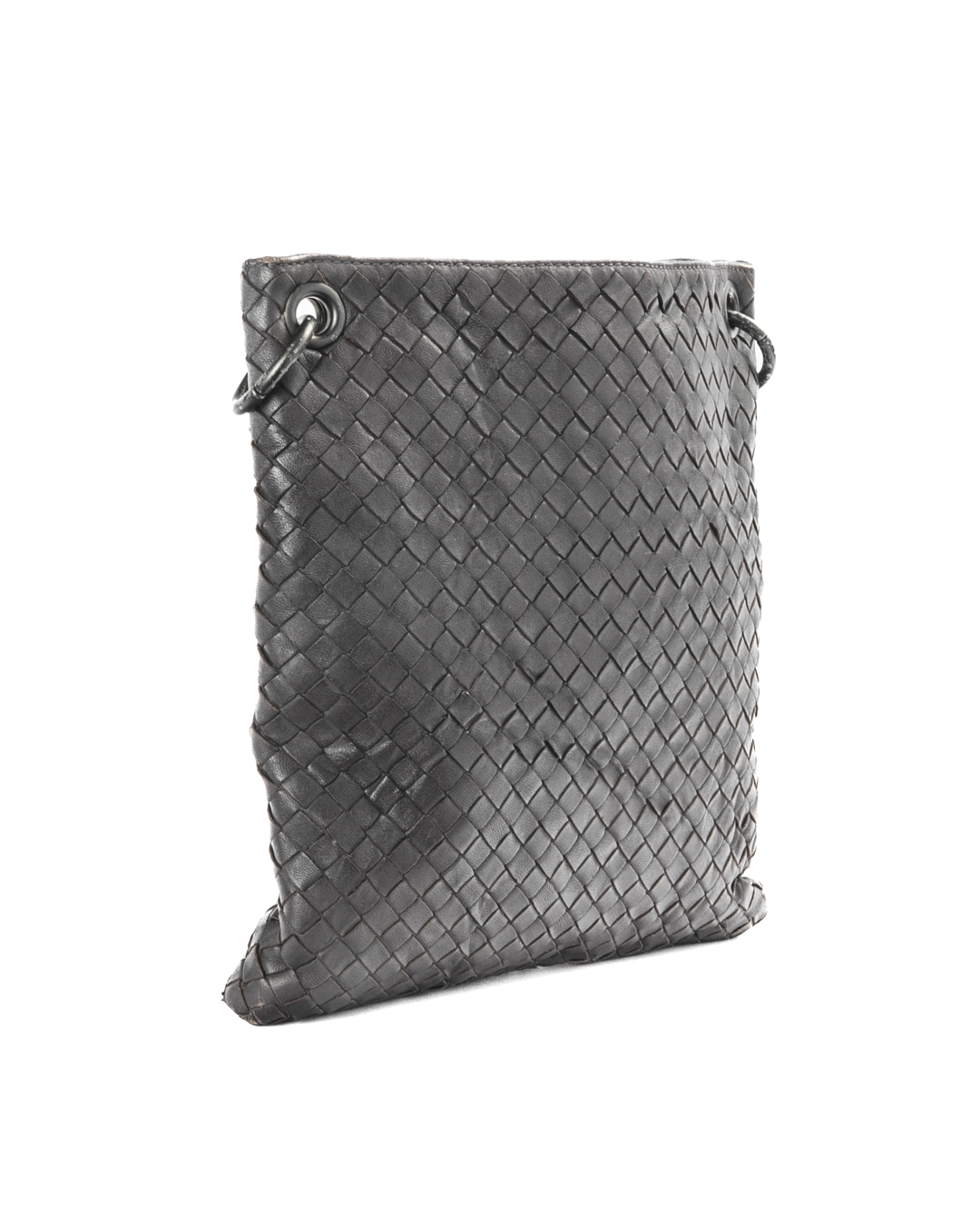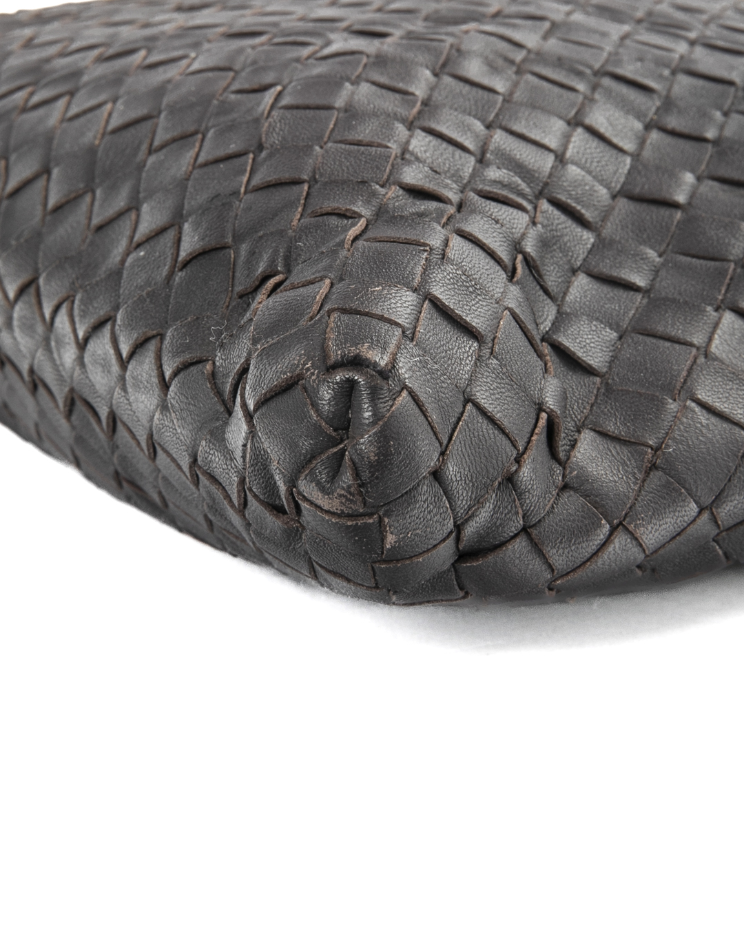 Borsa firmata Bottega Veneta, misura small, realizzata in pelle intrecciata viola con hardware argento. Non è dotata di nessuna chiusura, internamente rivestita in tela grigia con comoda tasca, la borsa è abbastanza capiente. Munita di una tracolla regolabile e rimovibile in tessuto, per una comoda portata a spalla o a tracolla. L'articolo si presenta in buone condizioni, con segni di usura visibili in foto.