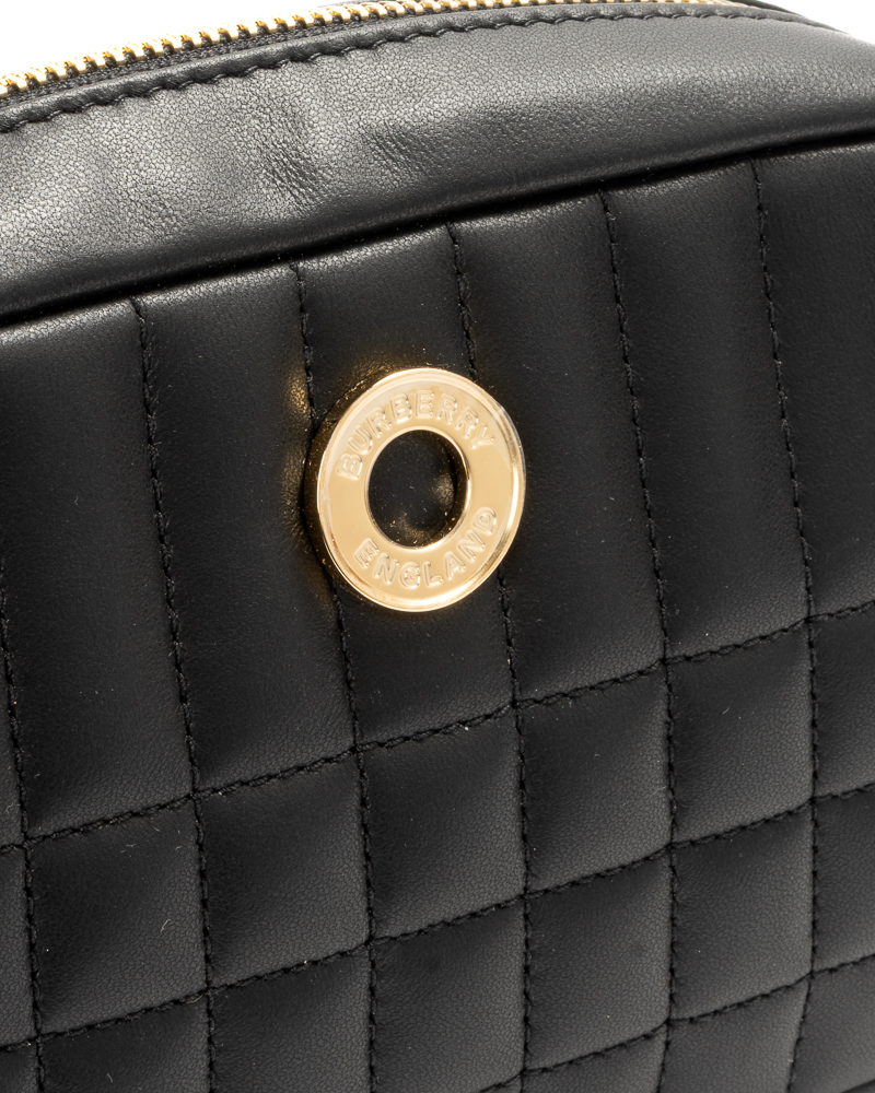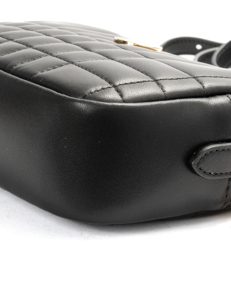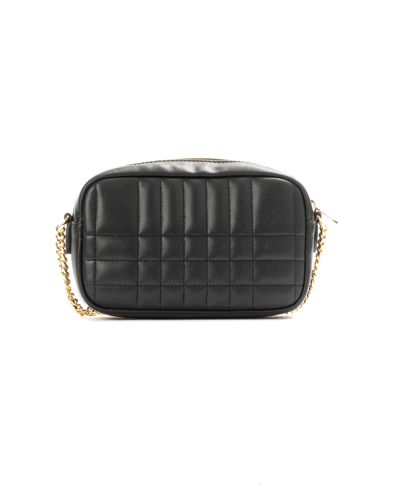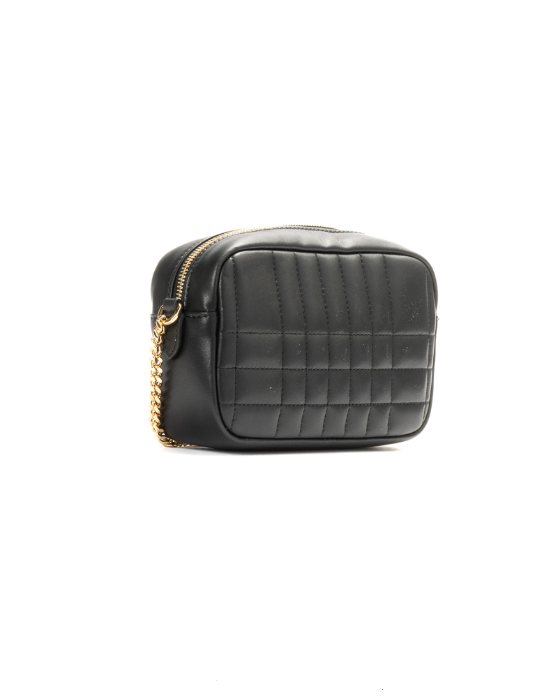 Borsa firmata Burberry, modello camera bag Lola nella misura small, realizzata in pelle trapuntata nera con hardware dorato. Dotata di una chiusura superiore a zip, internamente rivestita in tela tono su tono con piccola tasca, la borsa è capiente per l’essenziale. Munita di una tracolla regolabile in pelle e catena, per una comoda portata a spalla o a tracolla. L’articolo si presenta in condizioni pari al nuovo.
