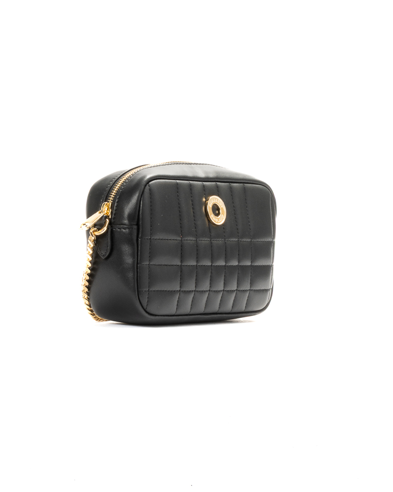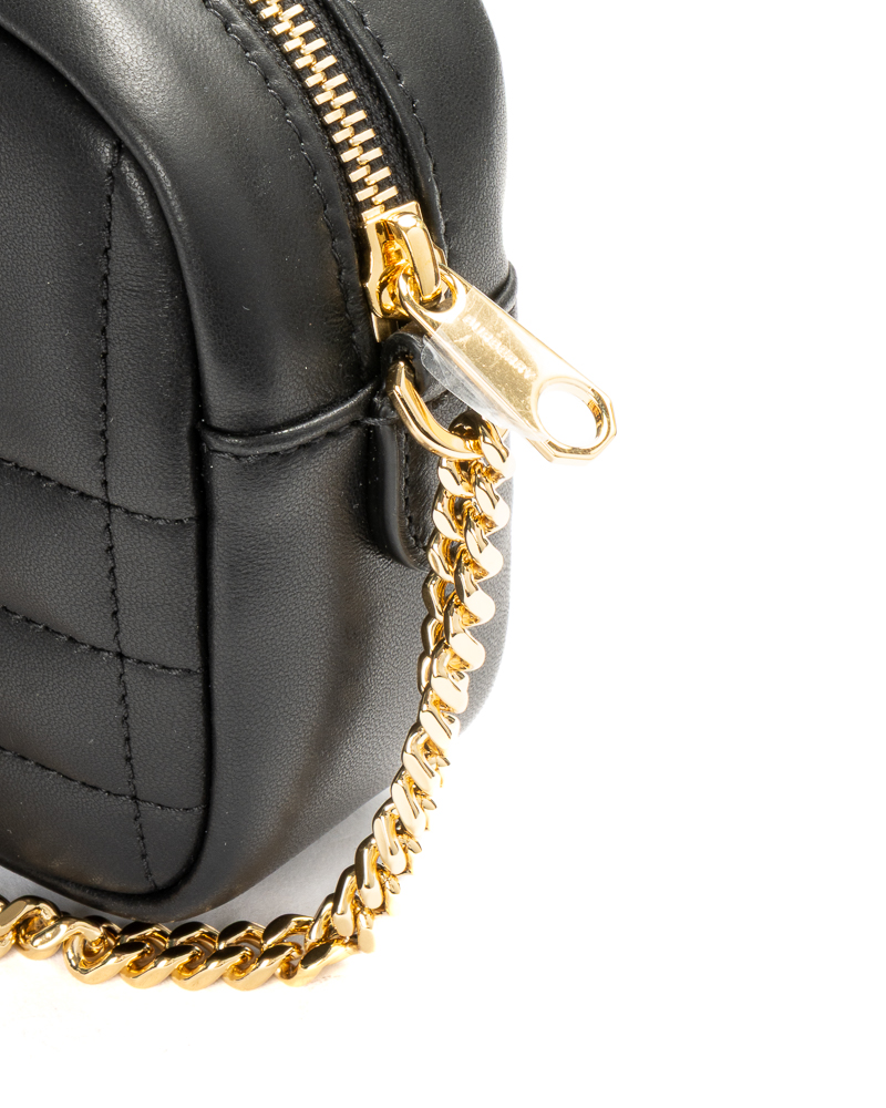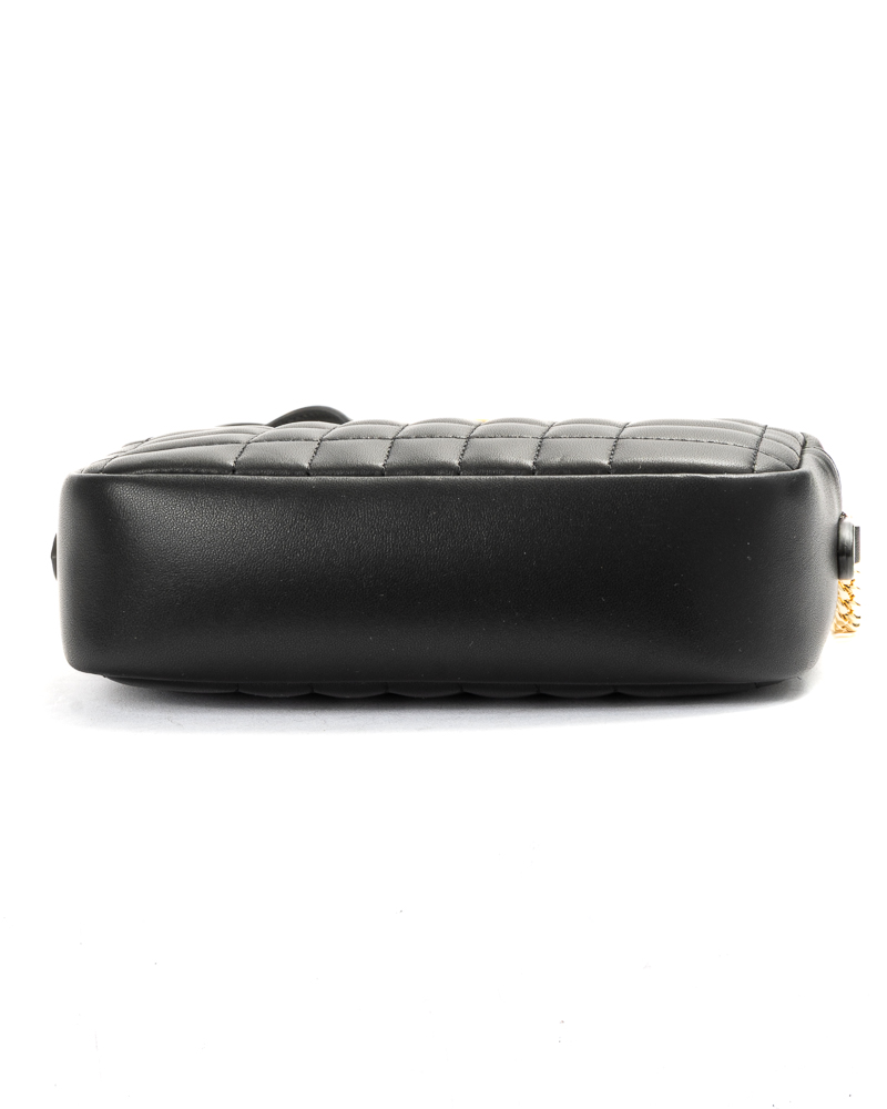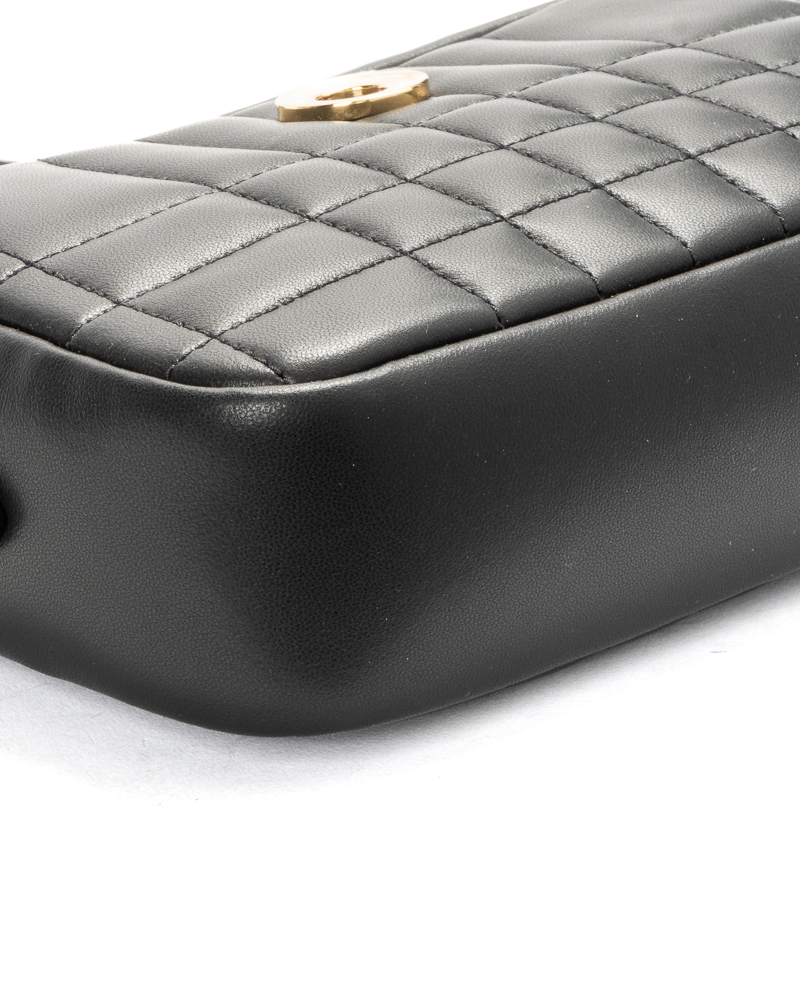 Borsa firmata Burberry, modello camera bag Lola nella misura small, realizzata in pelle trapuntata nera con hardware dorato. Dotata di una chiusura superiore a zip, internamente rivestita in tela tono su tono con piccola tasca, la borsa è capiente per l’essenziale. Munita di una tracolla regolabile in pelle e catena, per una comoda portata a spalla o a tracolla. L’articolo si presenta in condizioni pari al nuovo.