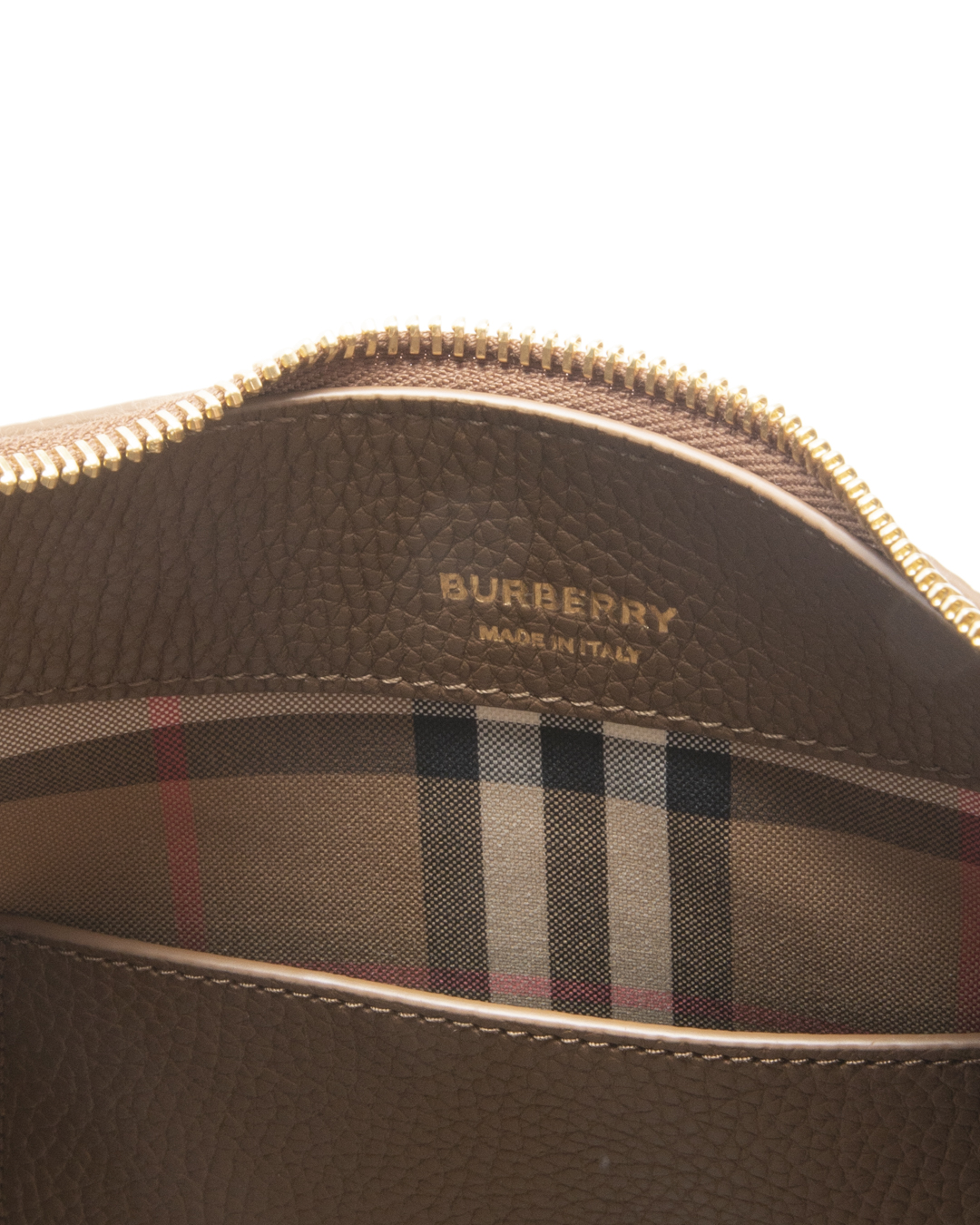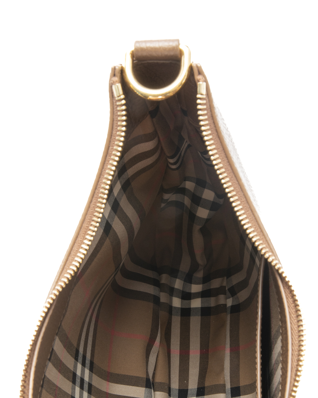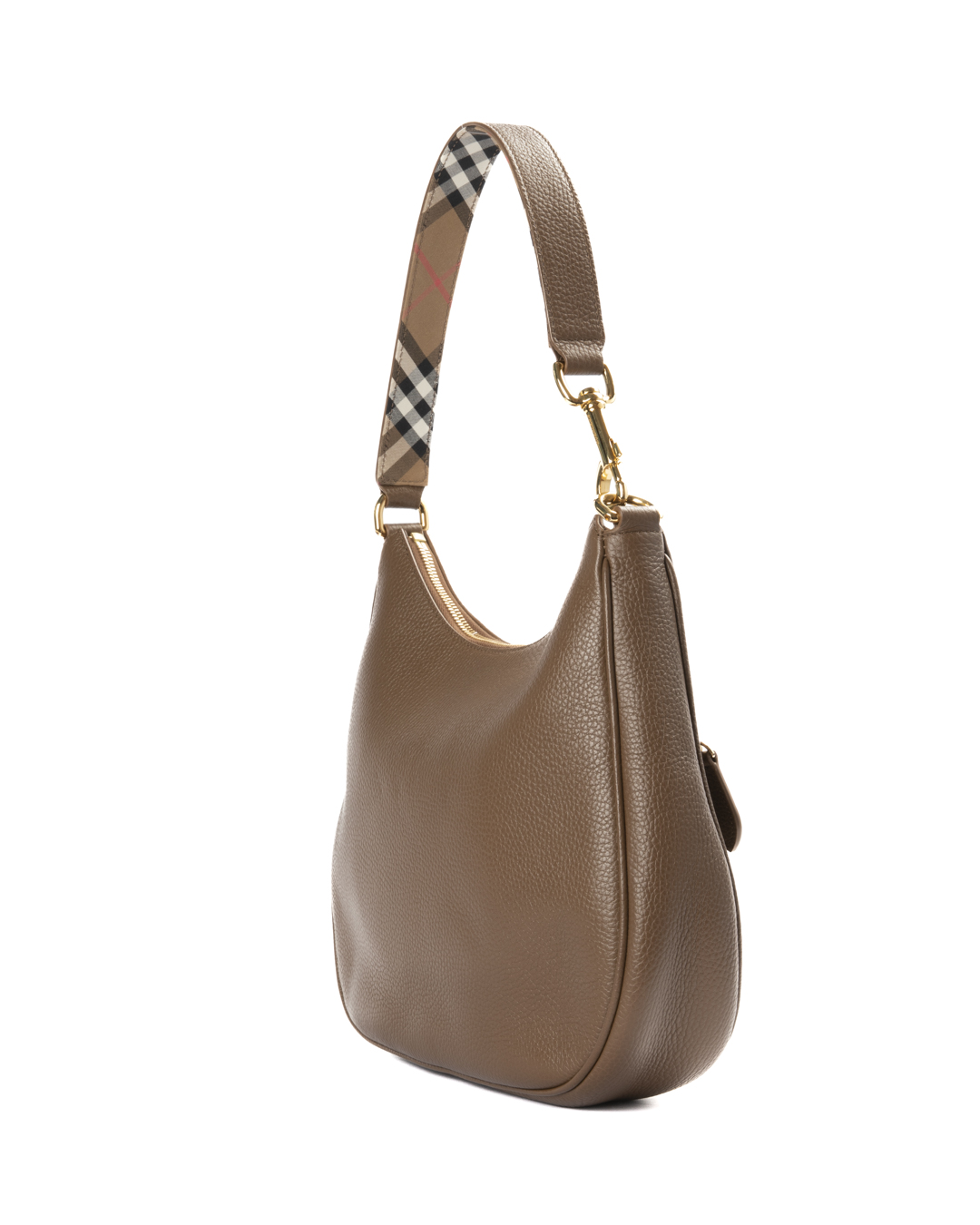 Borsa firmata Burberry, modello Hobo nella misura medium, realizzata in pelle granulata marrone con hardware dorato. Dotata di una chiusura superiore a zip, internamente rivestita in tessuto nella fantasia Check con comoda tasca, la borsa è abbastanza capiente. Munita di un manico in pelle, per una comoda portata a spalla o a mano. Arricchita da una comoda tasca sulla parte frontale con chiusura a zip. L'articolo si presenta in ottime condizioni.
