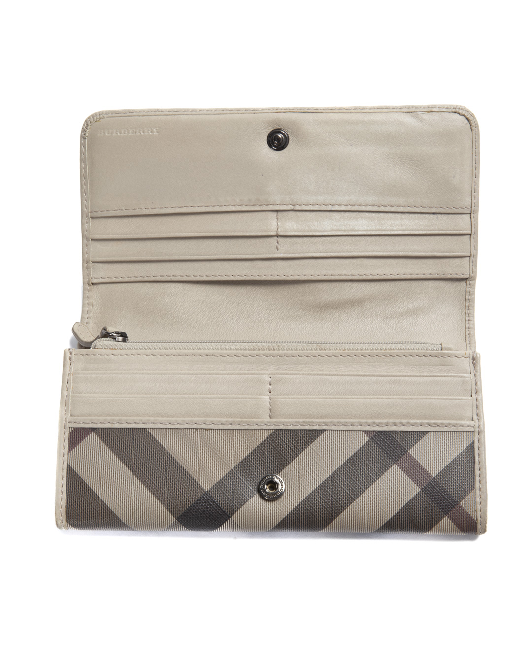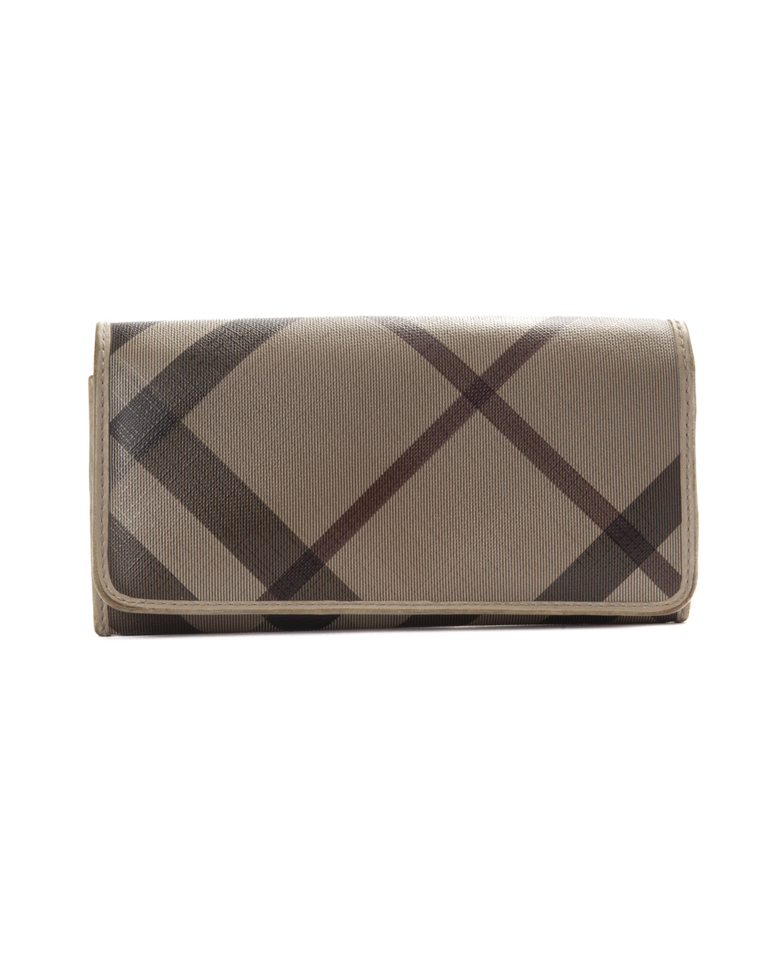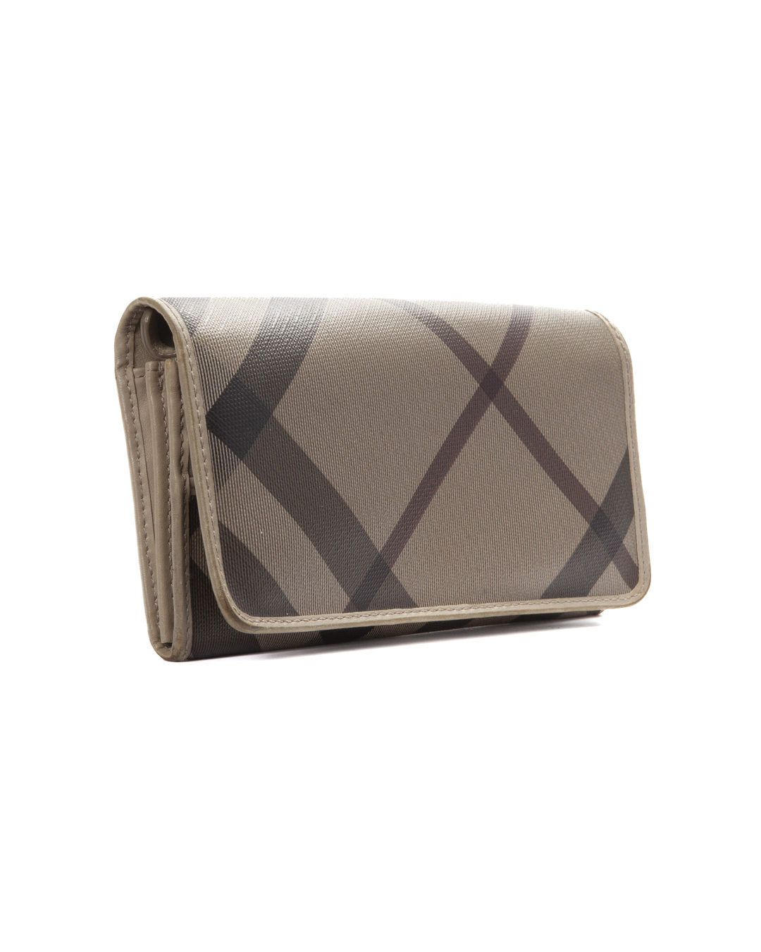Portafoglio firmato Burberry, realizzato in tela nella fantasia Check Smoke con rifiniture in pelle tortora e hardware argento. Dotata di una patta con chiusura a clip, internamente rivestita in pelle liscia con molteplici tasche comode per documenti e banconote. L’articolo si presenta in buone condizioni, con segni di usura visibili in foto.
