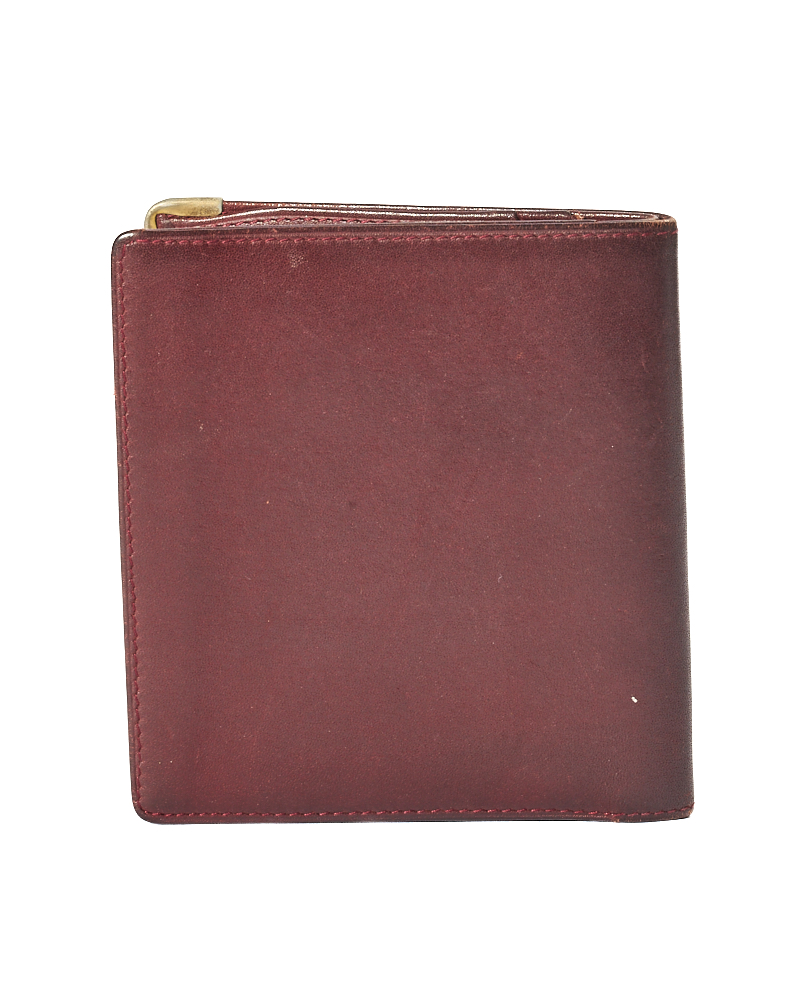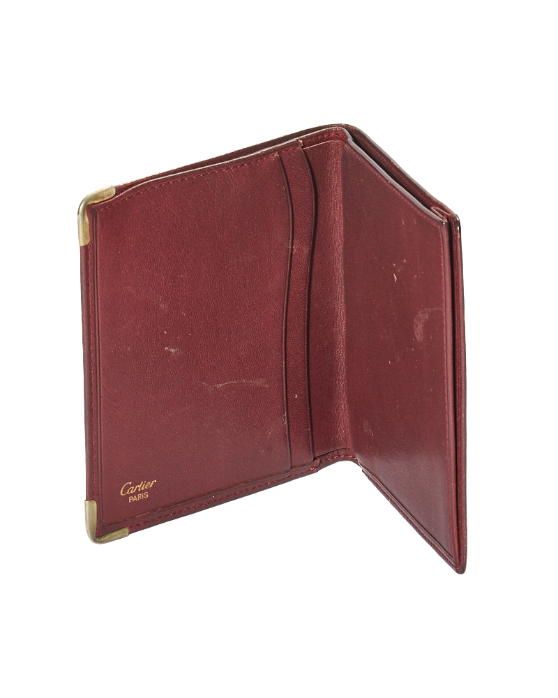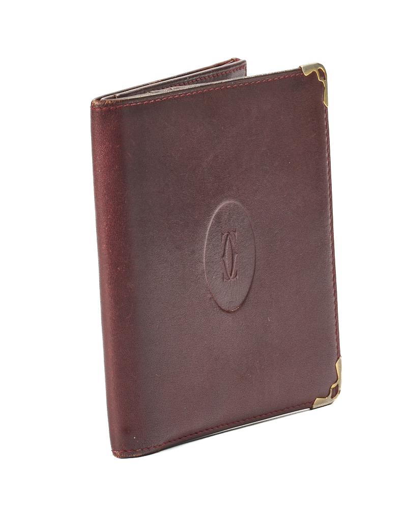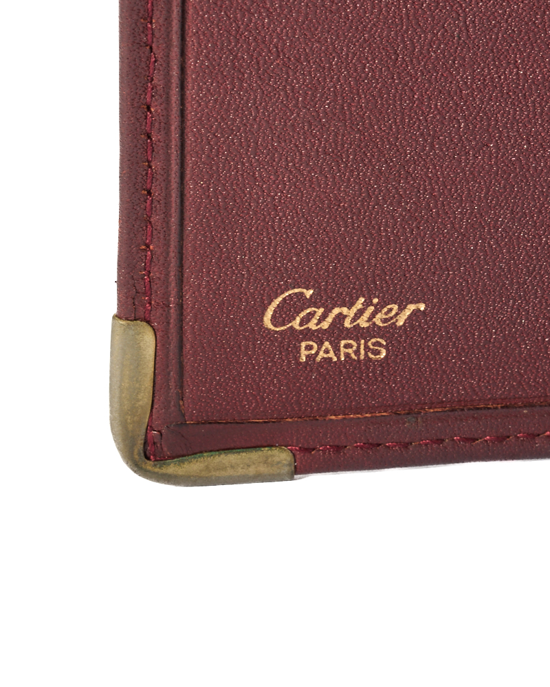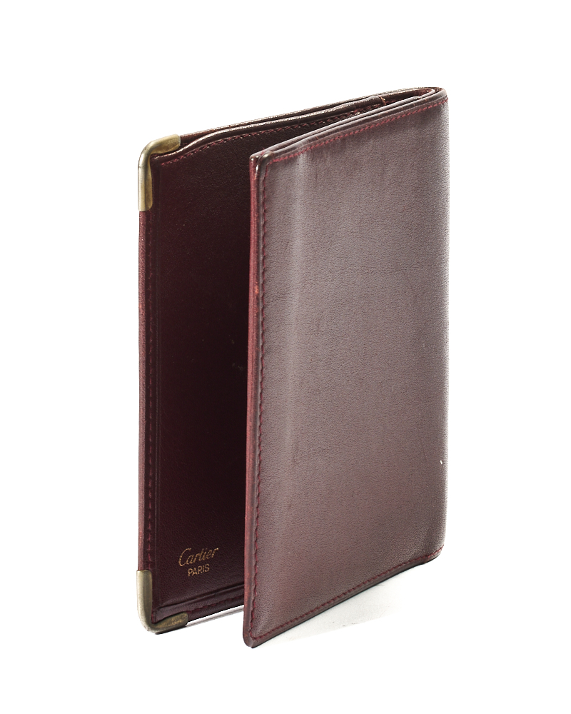 Portafoglio firmato Cartier, linea Vintage, realizzata in pelle liscia bordeuax. Non è dotato di nessuna chiusura, internamente rivestito in pelle tono su tono, con comode fessure per documenti e banconote. L’articolo si presenta in buone condizioni, con segni di usura visibili in foto.