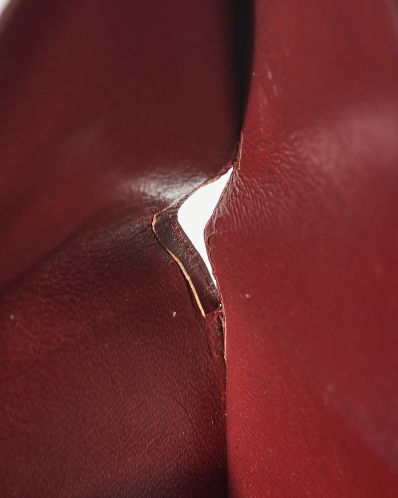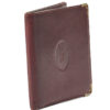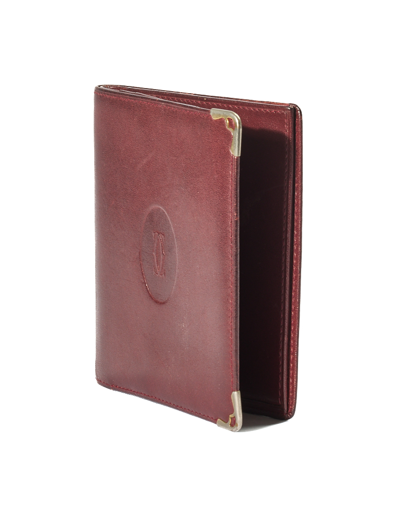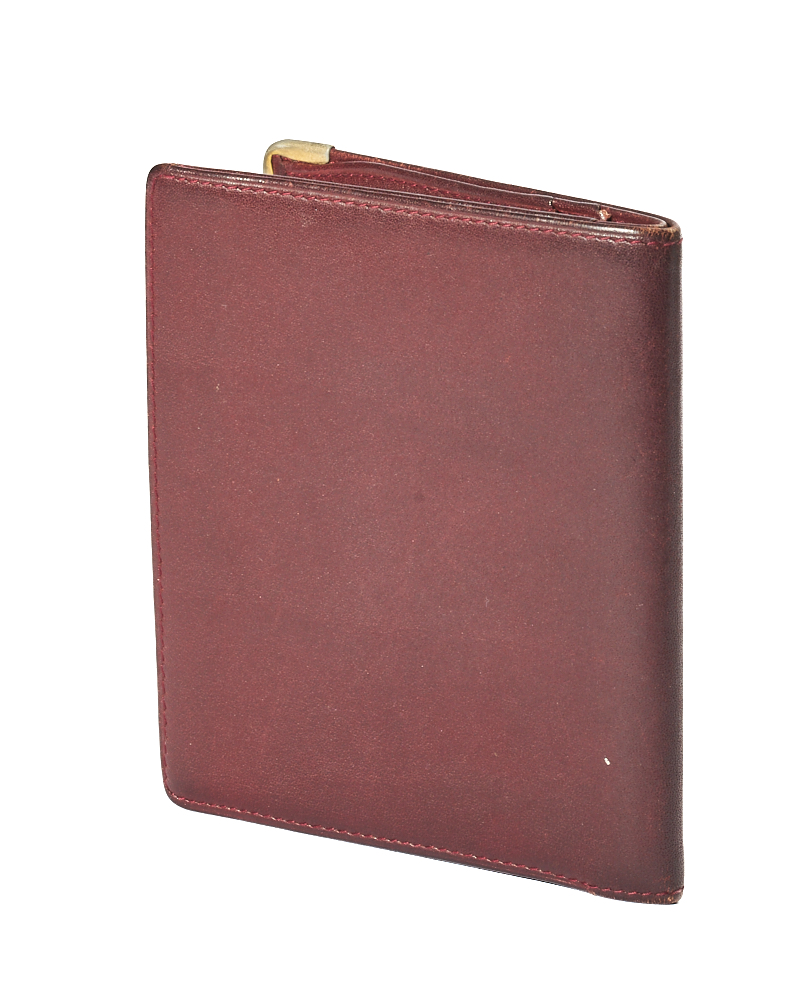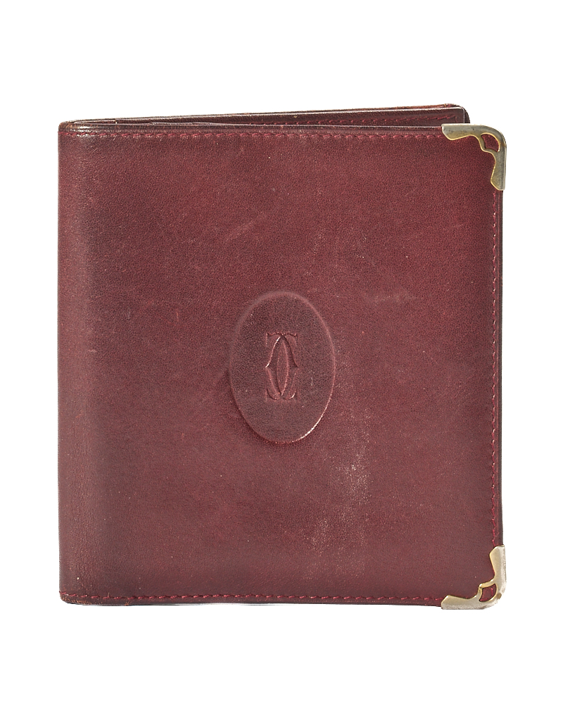 Portafoglio firmato Cartier, linea Vintage, realizzata in pelle liscia bordeuax. Non è dotato di nessuna chiusura, internamente rivestito in pelle tono su tono, con comode fessure per documenti e banconote. L’articolo si presenta in buone condizioni, con segni di usura visibili in foto.