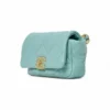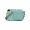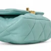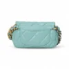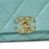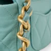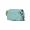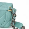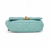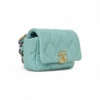 Marsupio firmato Chanel, modello 19 Flap nella misura mini, realizzato in pelle trapuntato nella colorazione tiffany con hardware bicolor, argento\oro. La patta frontale è arricchita dal classico logo del brand “CC” in metallo e chiusura a girello. Internamente rivestita in tela tono su tono con piccola tasca, la borsa è capiente per l’essenziale. Munita di una cintura regolabile in pelle e catena, per una comoda portata a spalla o a tracolla. Anno di produzione 2019, completo di card. L’articolo si presenta in ottime condizioni.