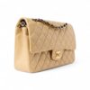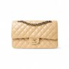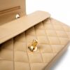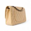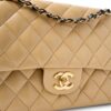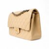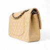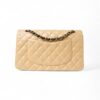 Borsa firmata Chanel, linea Timeless, modello 2.55, realizzata in pelle liscia nella colorazione beige con rifiniture nere e hardware dorati. Dotata di doppia patta, una interna con chiusura a bottone e una esterna con chiusura a girello con classico logo “CC”. Munita di una tracolla a scorrimento in catena e pelle intrecciata nera e oro, per indossare la borsa a spalla o a tracolla. Internamente rivestita in pelle liscia tono su tono con comode tasche, abbastanza capiente. Anno di produzione 2005/2006, l’articolo si presenta in buone condizioni.
