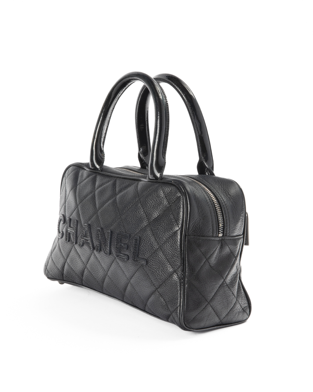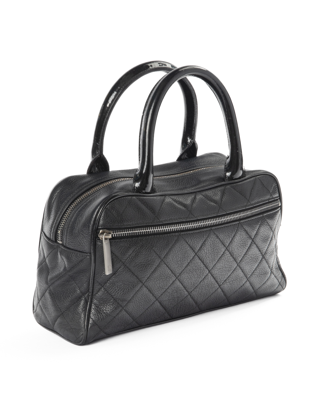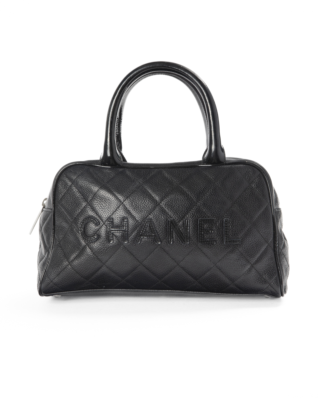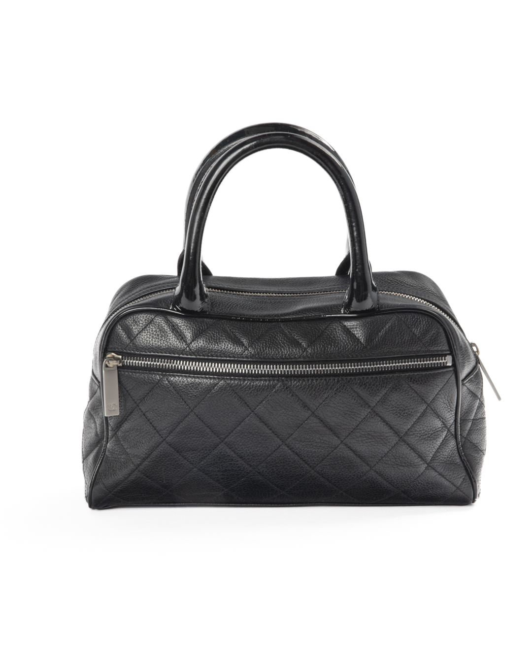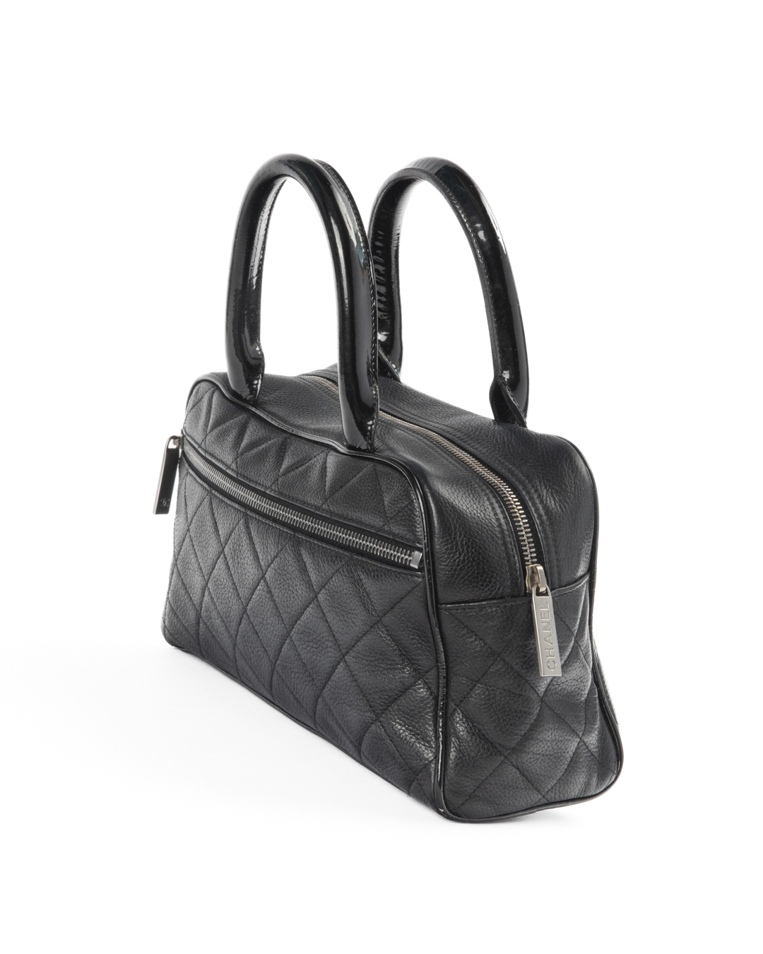 Borsa firmata Chanel, modello Bowling nella misura small, realizzata in pelle caviar nera con hardware argento. Dotata di una chiusura superiore a zip, internamente rivestita in pelle liscia tono su tono con comoda tasca, la borsa è abbastanza capiente. Munita di doppio manico in pelle, per una comoda portata a mano. Anno di produzione 2000/2002. L'articolo si presenta in ottime condizioni.