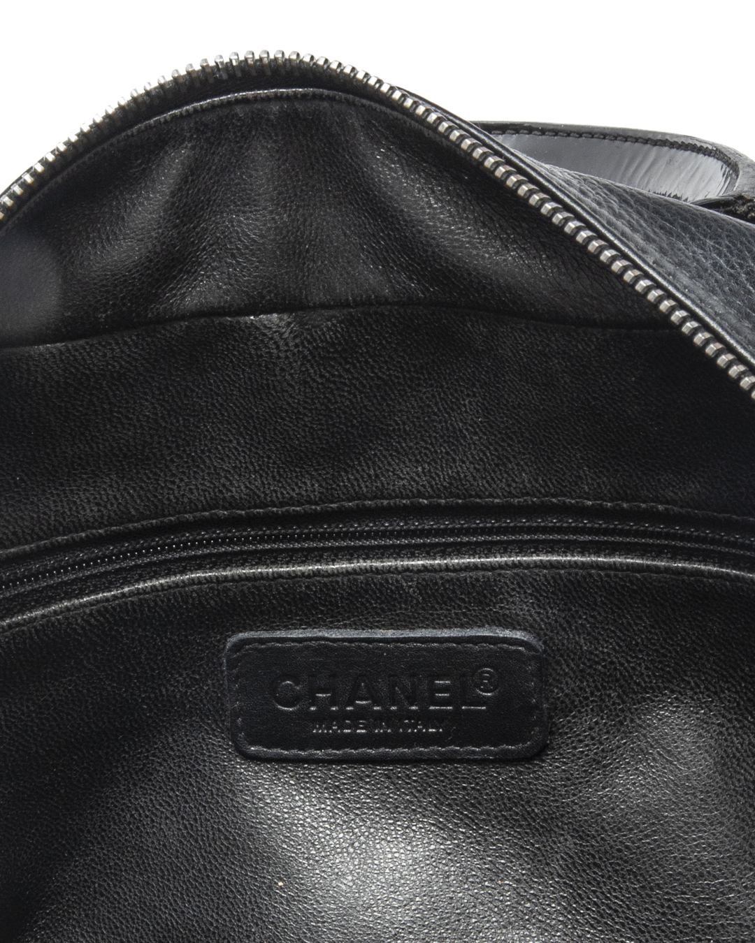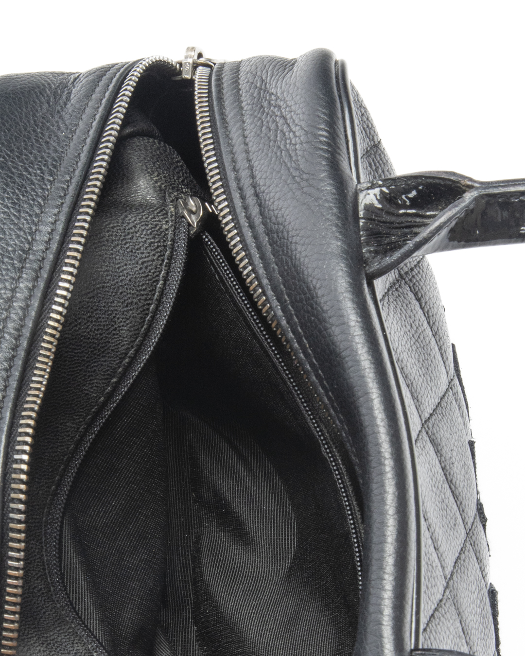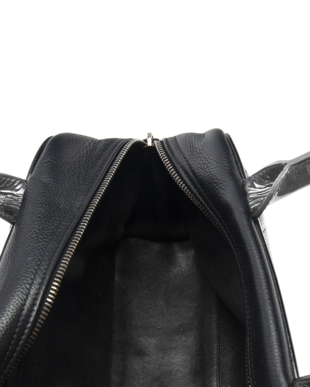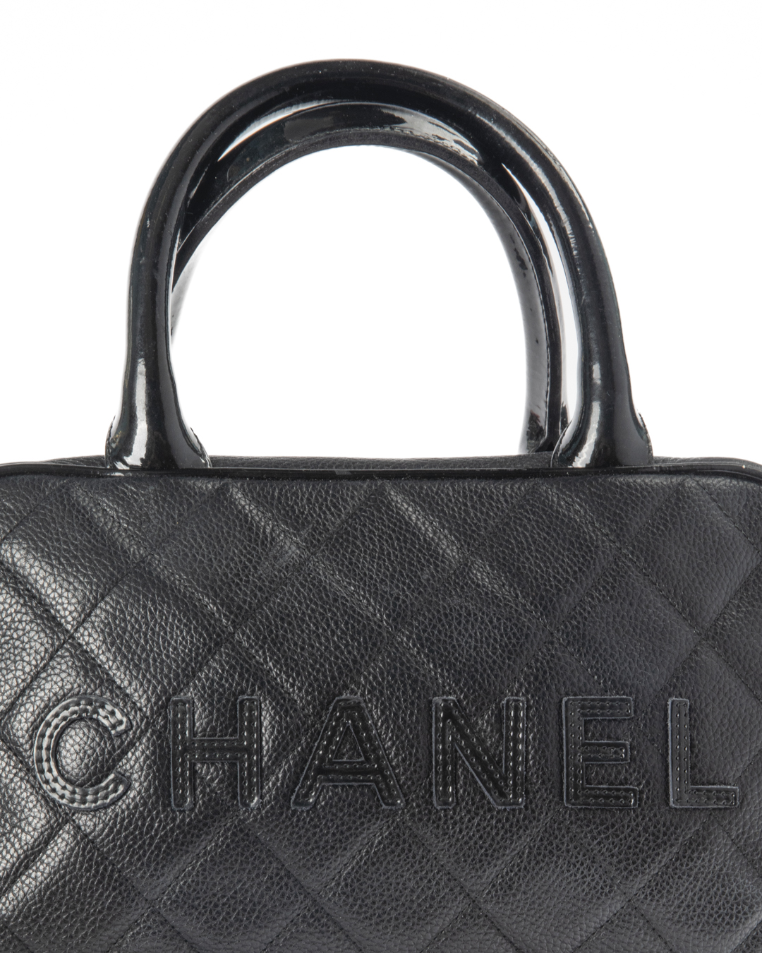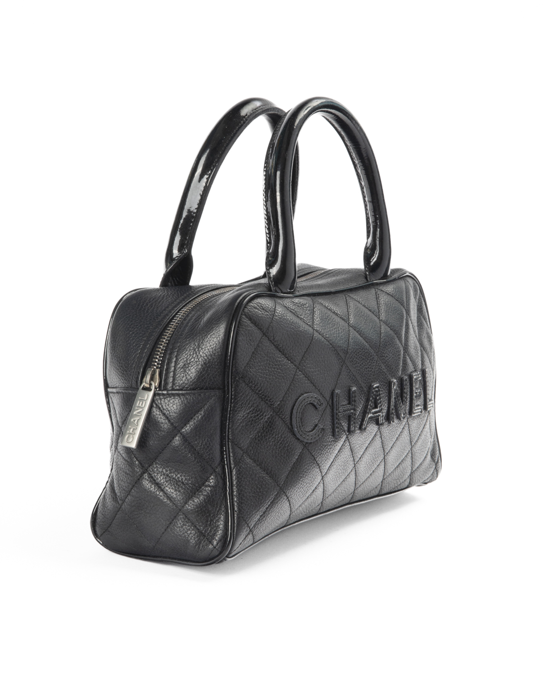 Borsa firmata Chanel, modello Bowling nella misura small, realizzata in pelle caviar nera con hardware argento. Dotata di una chiusura superiore a zip, internamente rivestita in pelle liscia tono su tono con comoda tasca, la borsa è abbastanza capiente. Munita di doppio manico in pelle, per una comoda portata a mano. Anno di produzione 2000/2002. L'articolo si presenta in ottime condizioni.