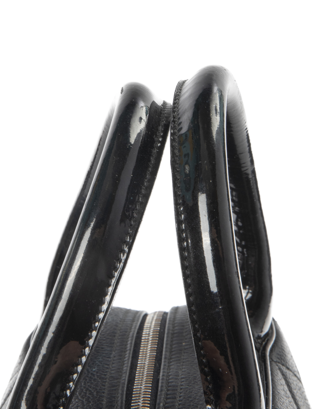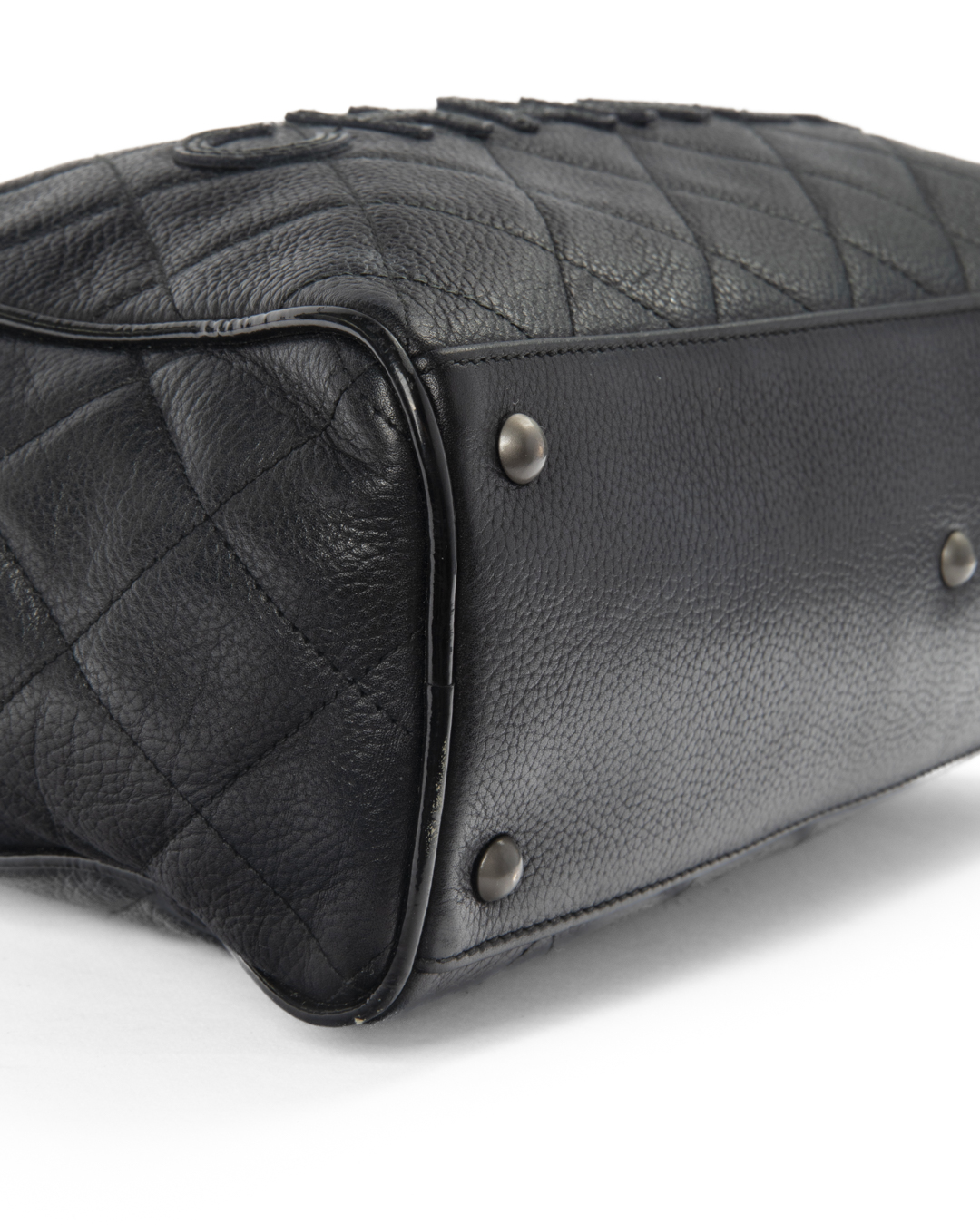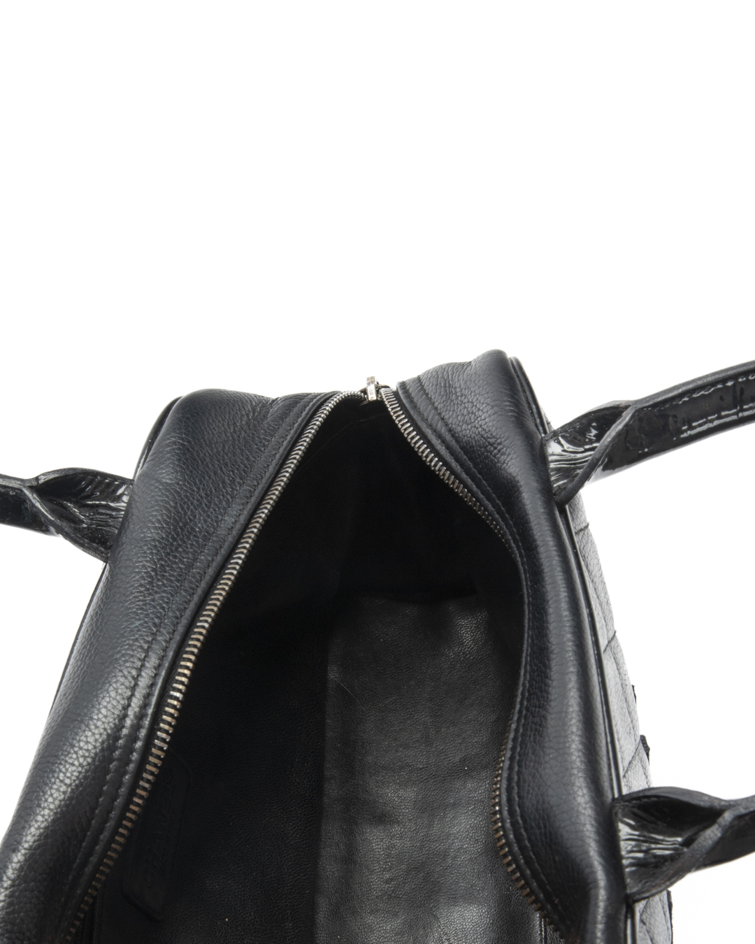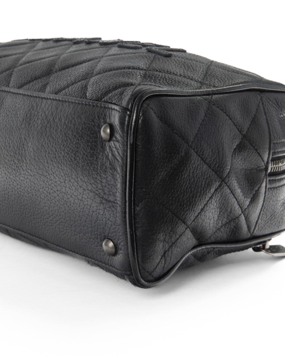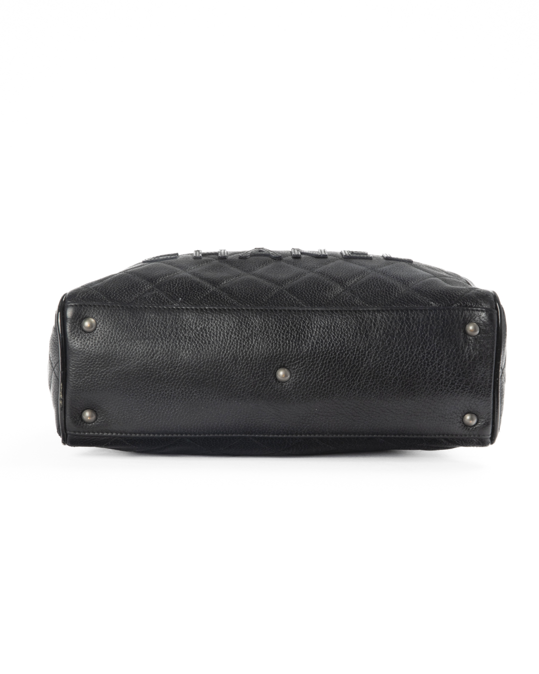 Borsa firmata Chanel, modello Bowling nella misura small, realizzata in pelle caviar nera con hardware argento. Dotata di una chiusura superiore a zip, internamente rivestita in pelle liscia tono su tono con comoda tasca, la borsa è abbastanza capiente. Munita di doppio manico in pelle, per una comoda portata a mano. Anno di produzione 2000/2002. L'articolo si presenta in ottime condizioni.