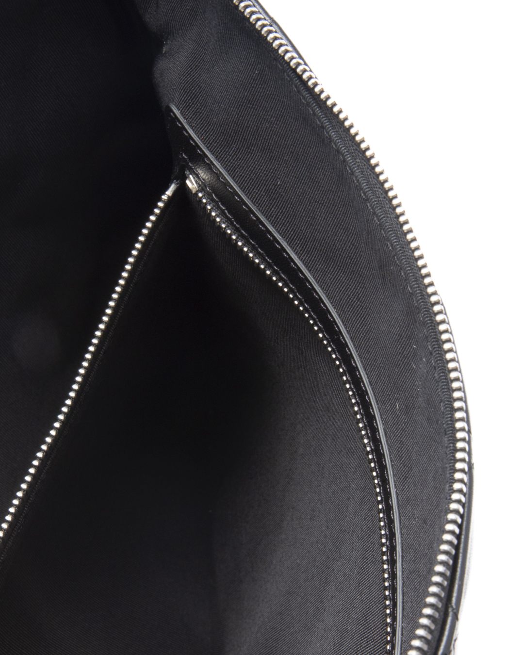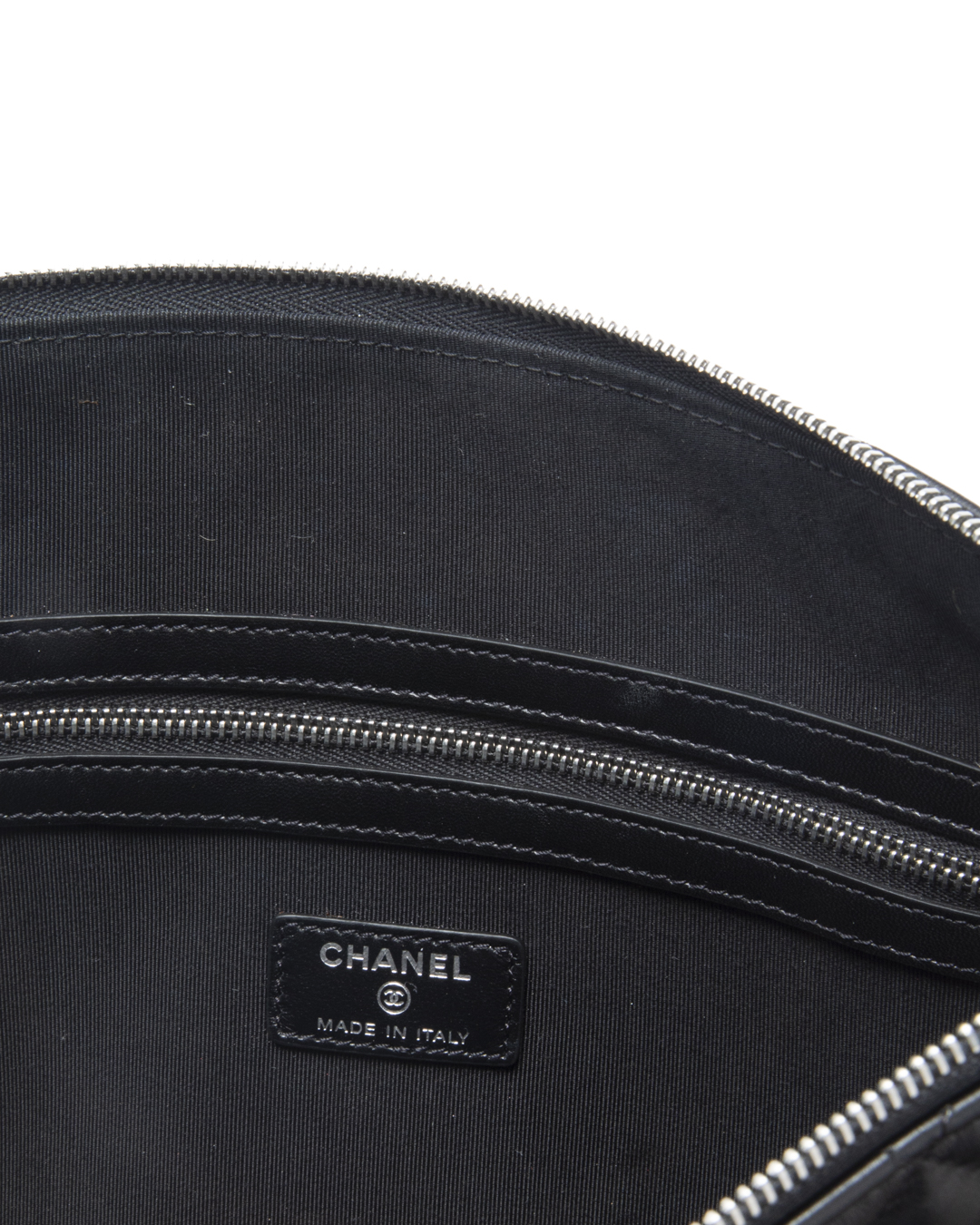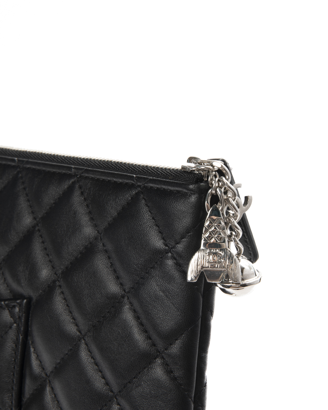 Clutch firmata Chanel, modello Charm Space nella misura large, realizzata in pelle trapuntata nera con hardware argento. Dotata di una chiusura superiore a zip, internamente rivestita in tela nera con comode tasche, la borsa è abbastanza capiente. Arricchita da charm sulla linguetta, completa di card, Anno di produzione 2017/2018. L'articolo si presenta in ottime condizioni.