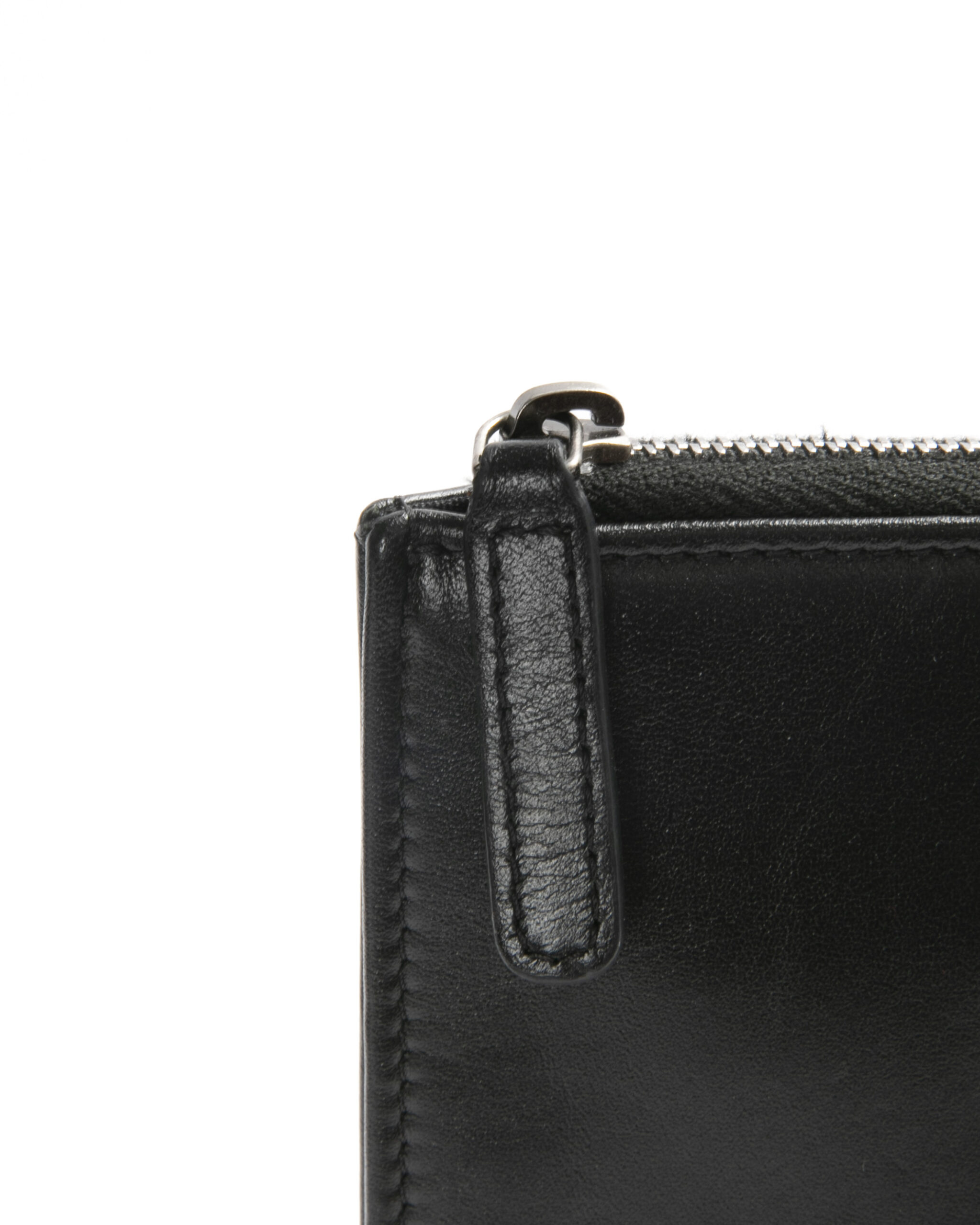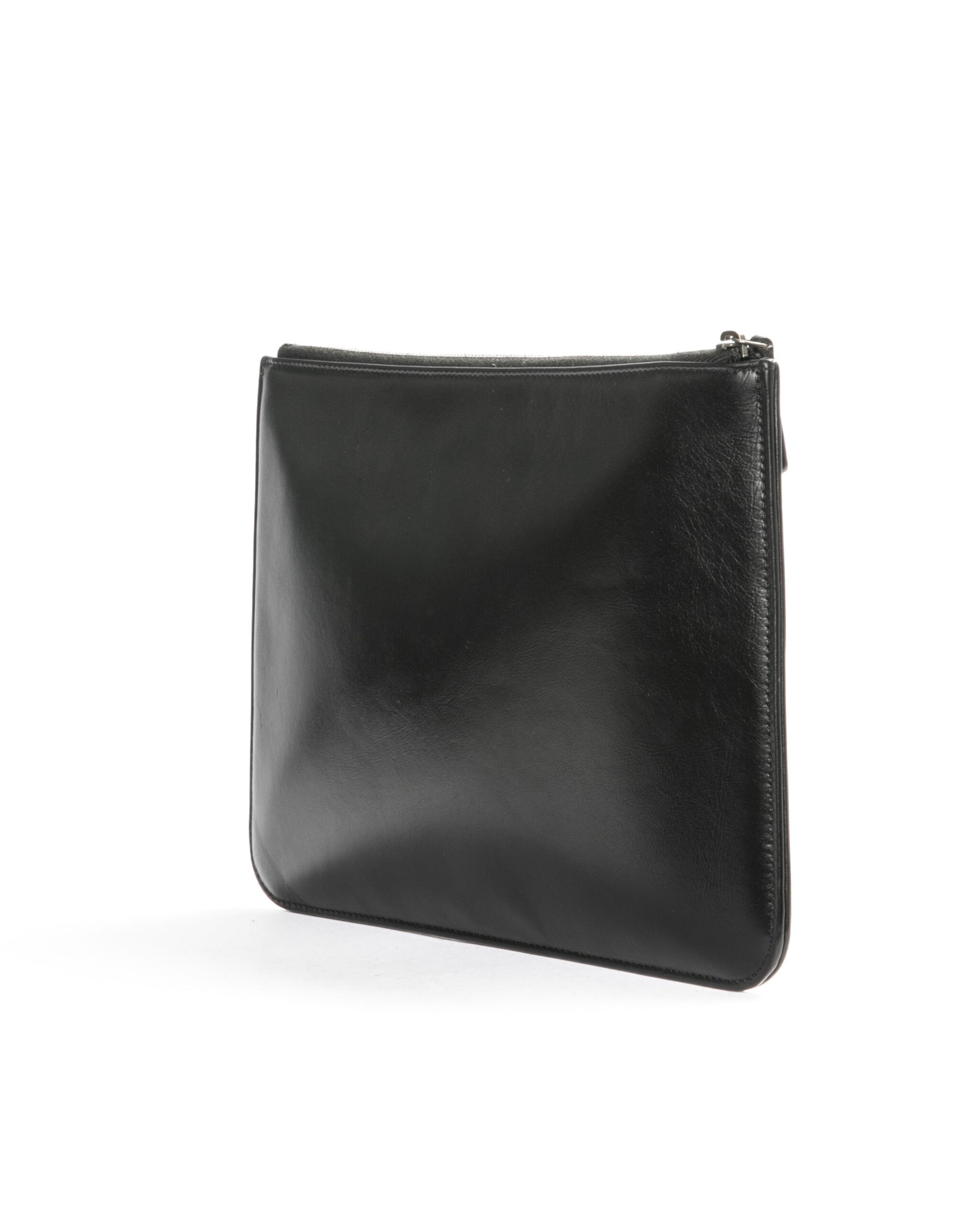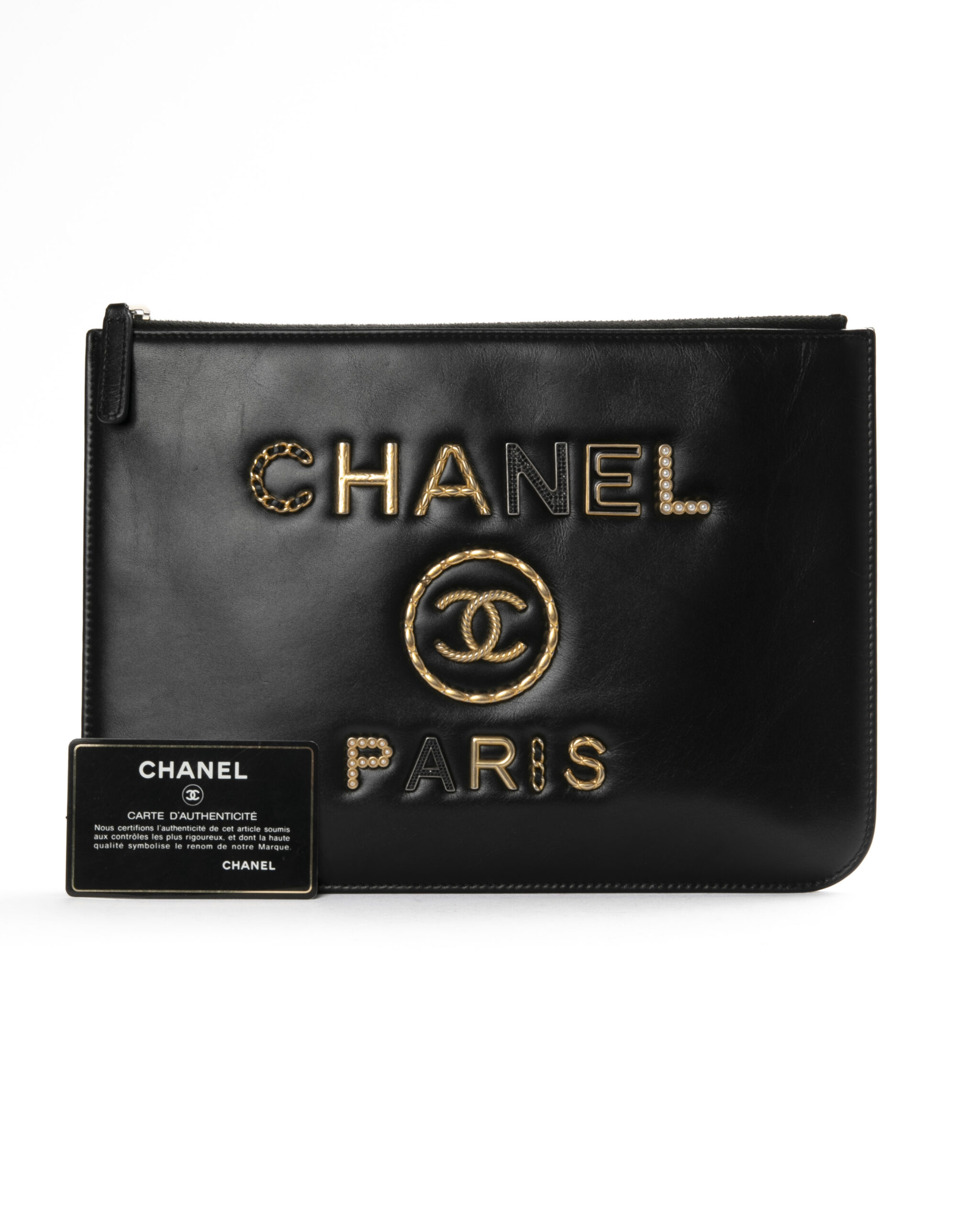 Clutch firmata Chanel, modello Deauville nella misura small, realizzata in pelle liscia nera arricchita dalla classica scritta del brand in rilievo sulla parte frontale e hardware dorato. Dotata di una chiusura superiore a zip, internamente rivestita in tela nera con comoda tasca, la borsa è capiente per l’essenziale. Completa di Card, Anno di produzione 2020/2021. L’articolo si presenta in ottime condizioni.
