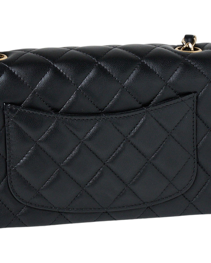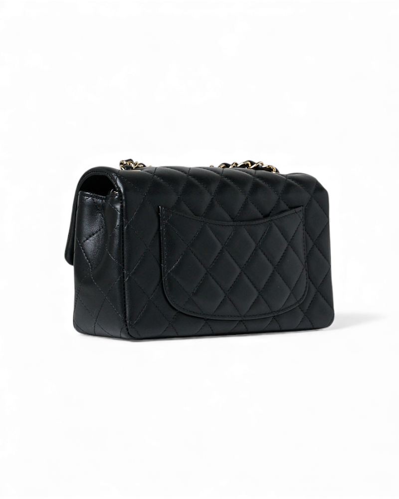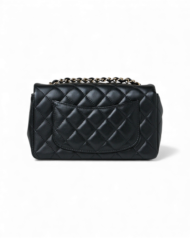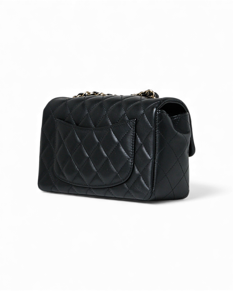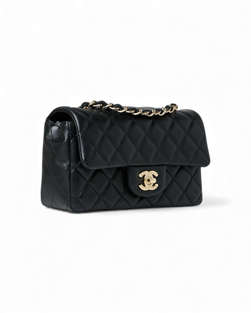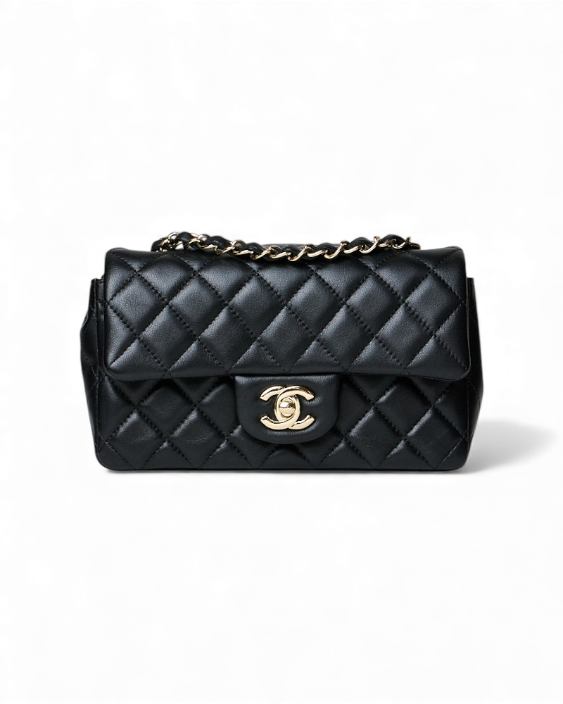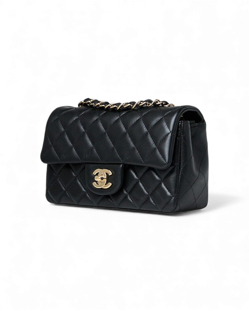 Borsa firmata Chanel, linea Timeless, modello Mini Flap Rectangular, realizzata in pelle trapuntata nera con hardware dorato. Dotata di una patta frontale con classico logo del brand “CC” in metallo e chiusura a girello. Internamente rivestita in pelle liscia tono su tono con comode tasche, la borsa è capiente. Munita di una tracolla in pelle e catena intrecciata, per una comoda portata a spalla o a tracolla. Completa di card, Anno di produzione 2020/2021. L’articolo si presenta in condizioni pari al nuovo.