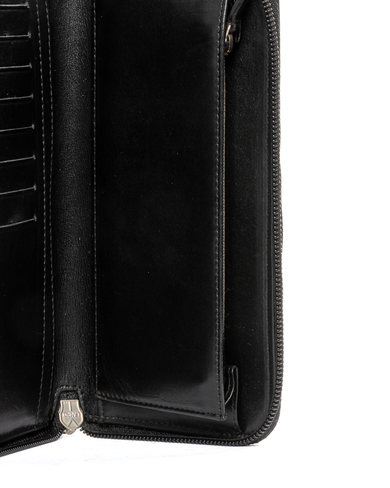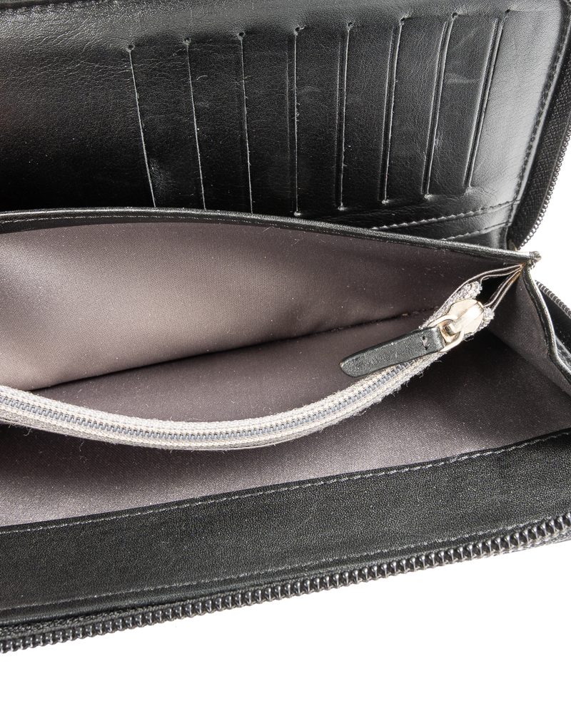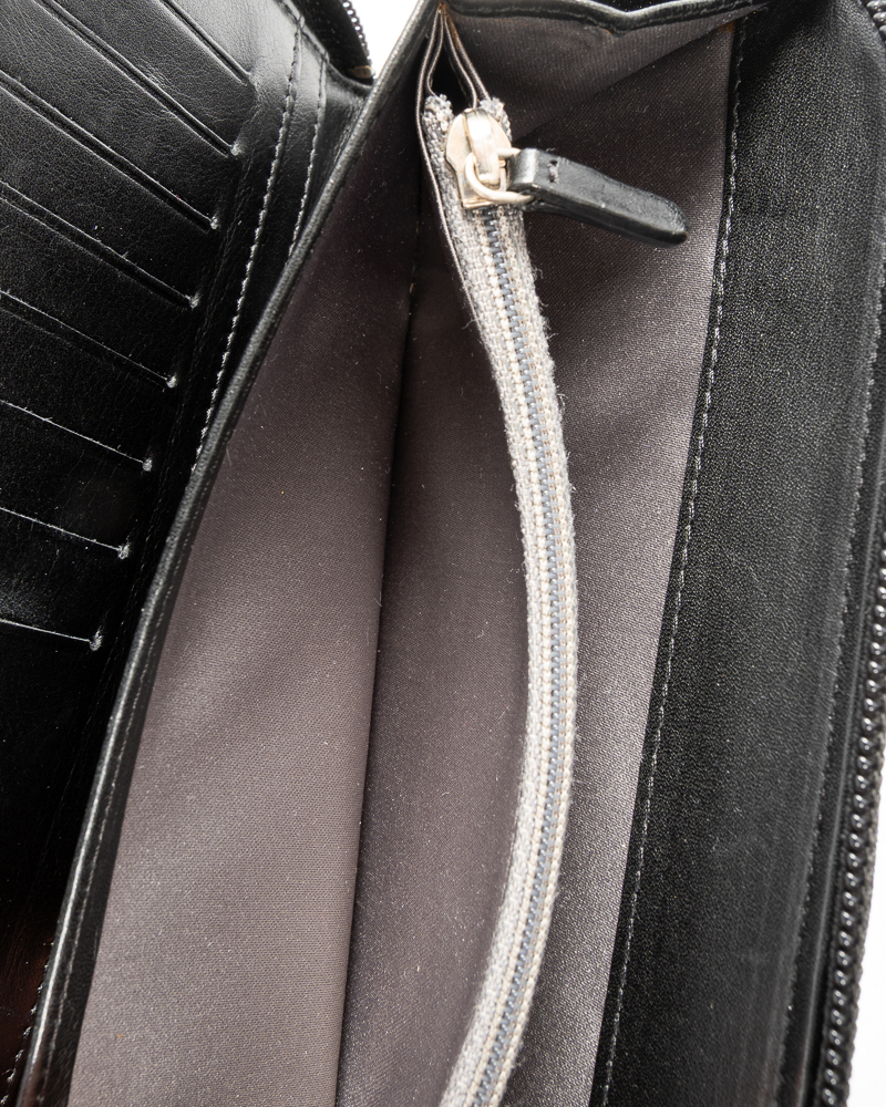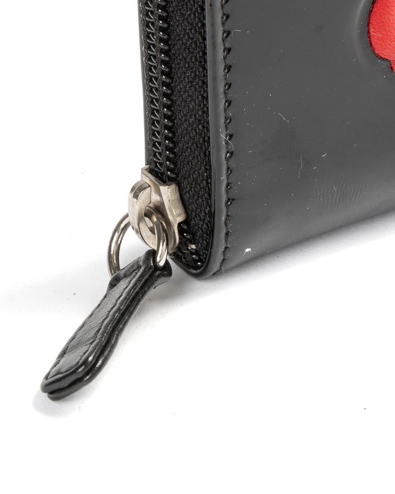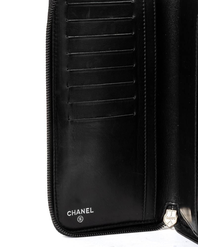 Portafoglio firmato Chanel, realizzato in pelle verniciata nero con hardware argento. Dotato di una chiusura superiore a zip, internamente rivestito in pelle liscia tono su tono con molteplici tasche comodo per documenti e banconote. Arricchito da camelie colorate sulla parte frontale. Anno di produzione 2008/2009. L’articolo si presenta in buone condizioni.