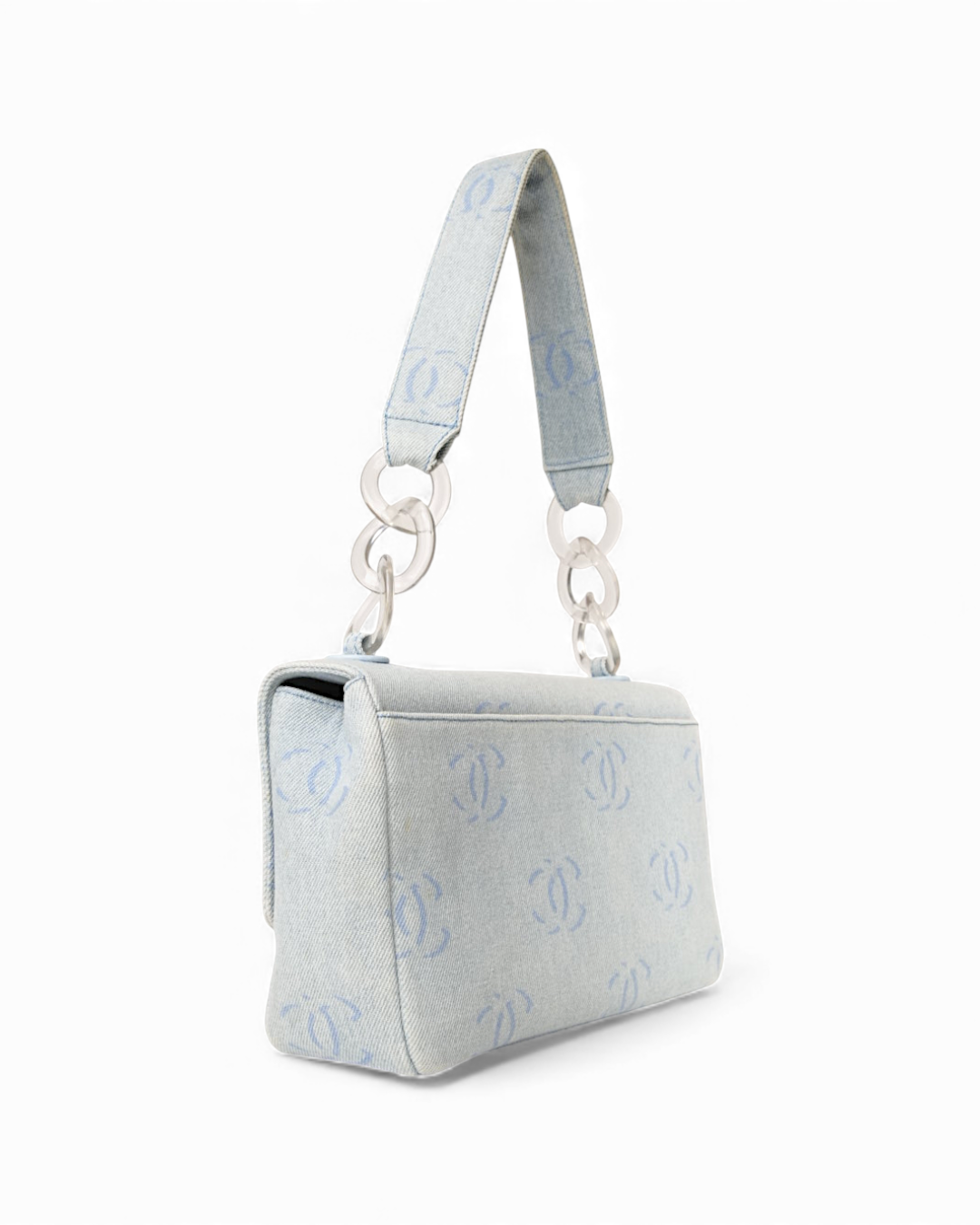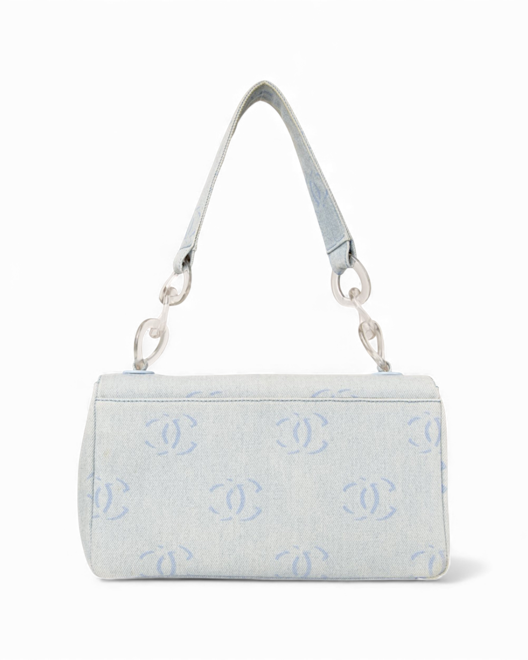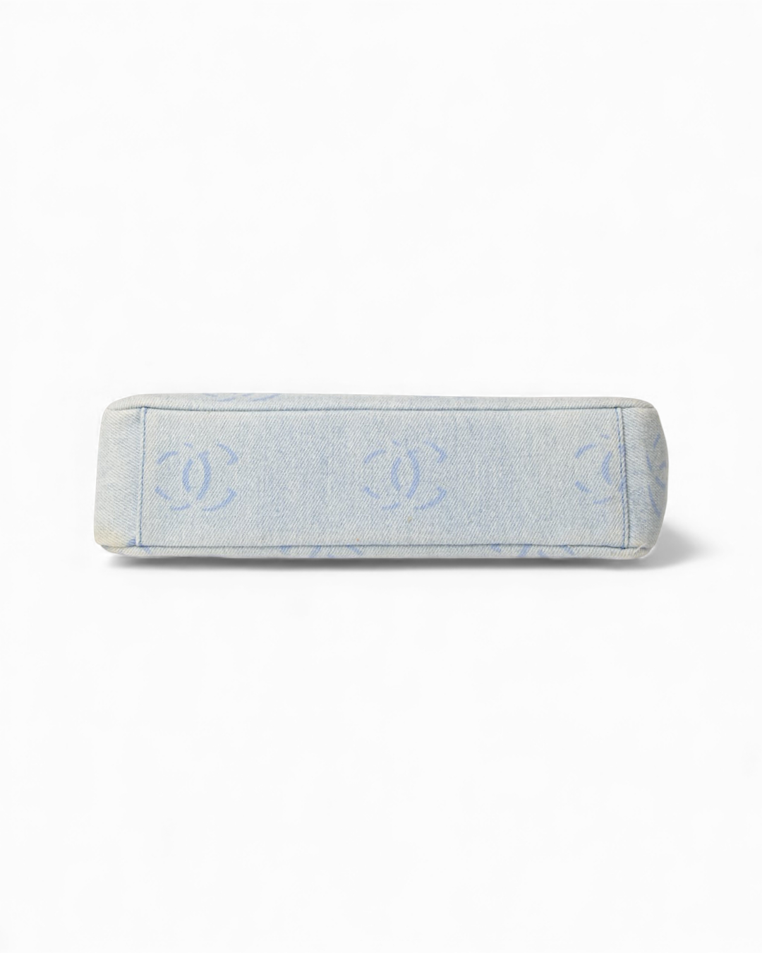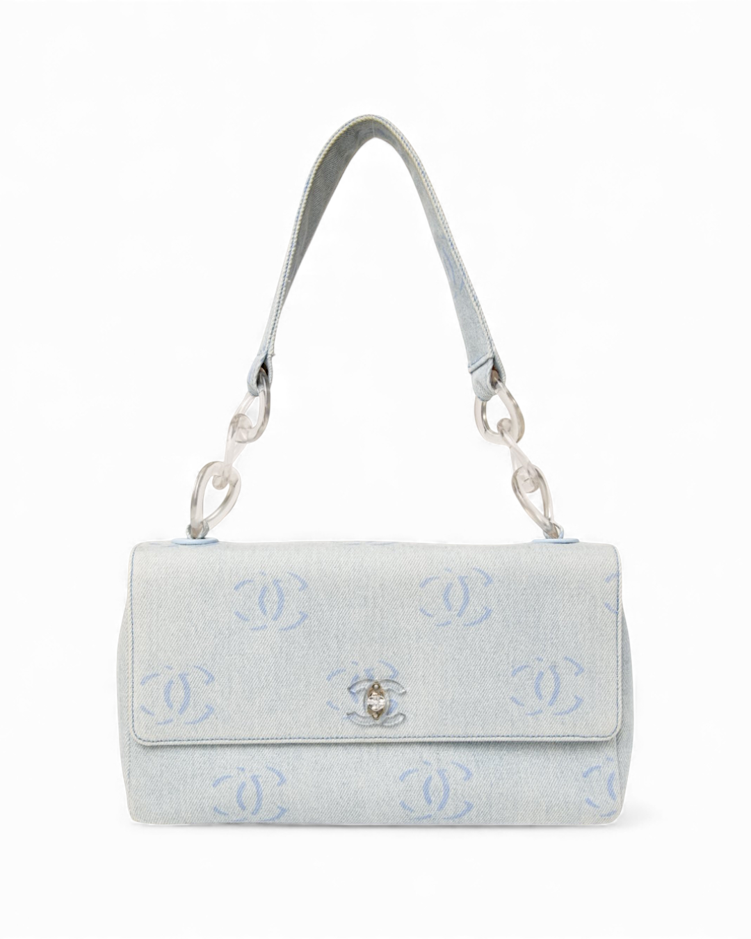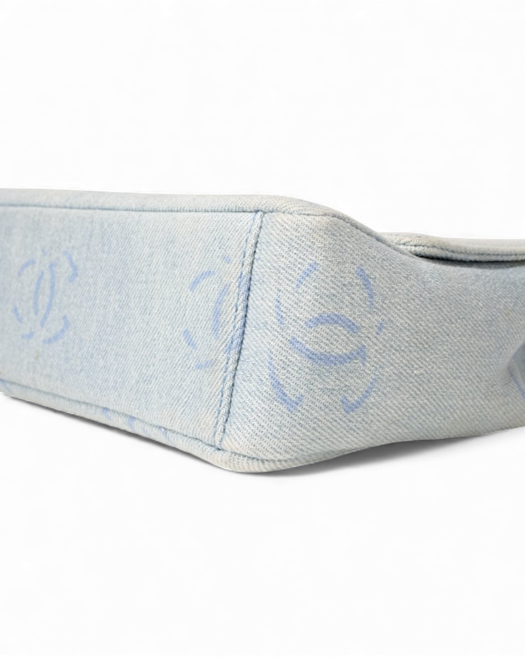 Borsa firmata Chanel, modello Sottospalla, realizzata in denim azzurra con hardware argento. Dotata di un patta con classico logo del brand trasparente “CC” e chiusura a girello, internamente rivestita in nylon nero con comode tasche, la borsa è abbastanza capiente. Munita di un manico, per una comoda portata a spalla o a mano. Anno di produzione 2002/2003. L’articolo si presenta in buone condizioni, con lievi segni di usura visibili in foto.