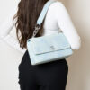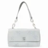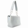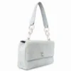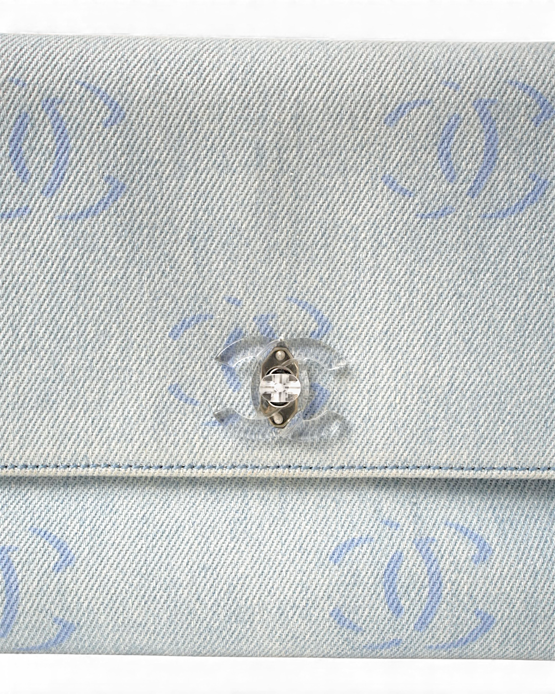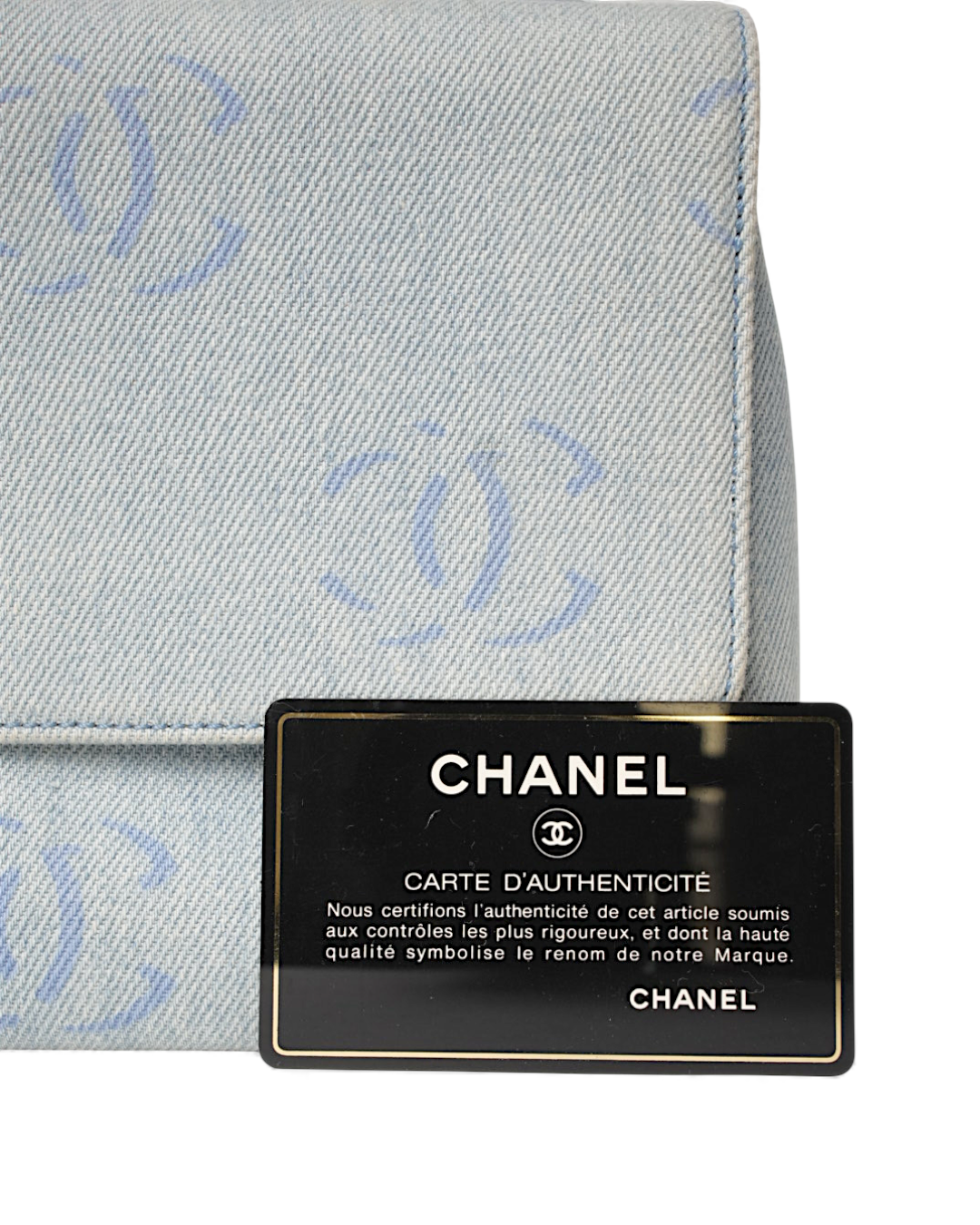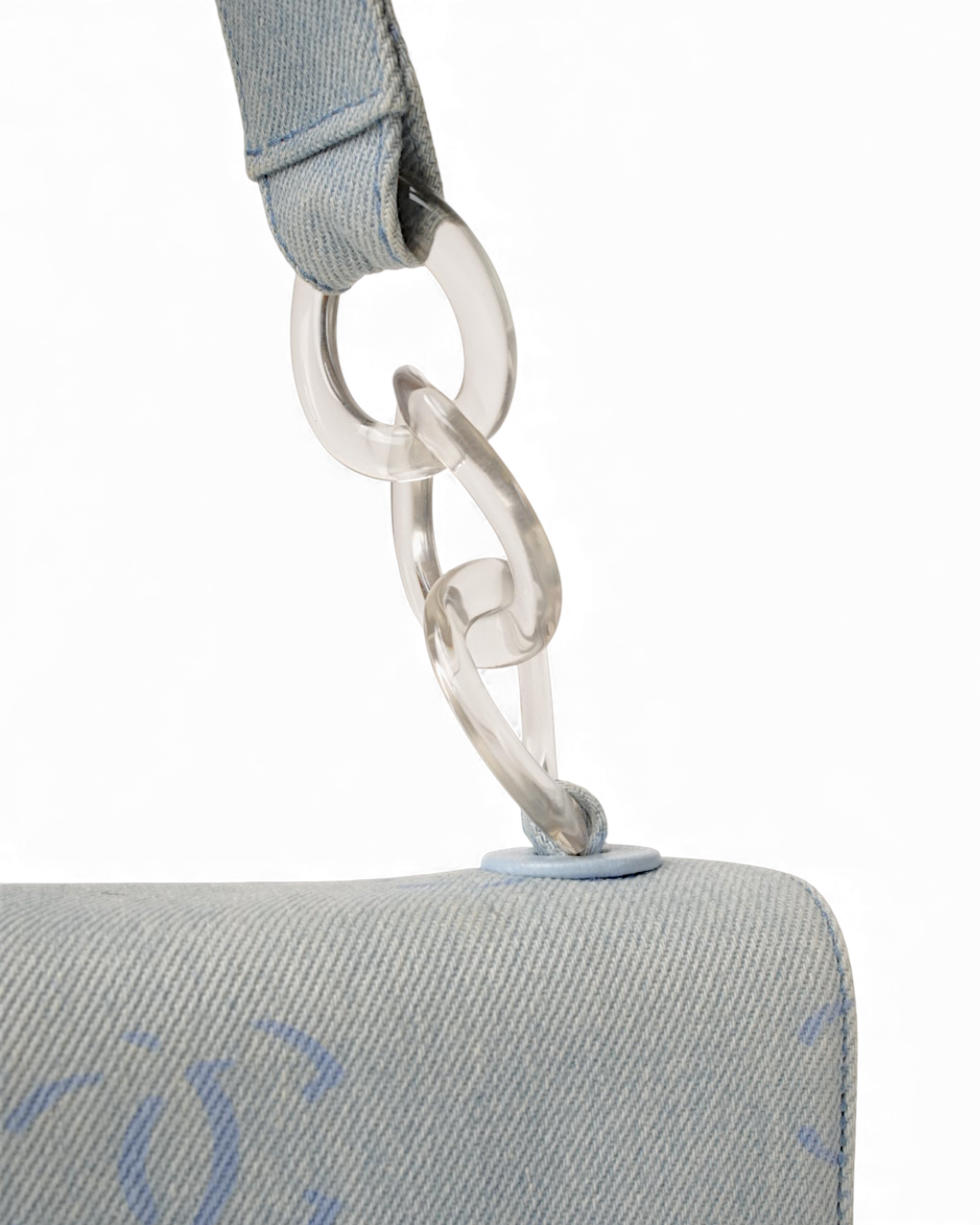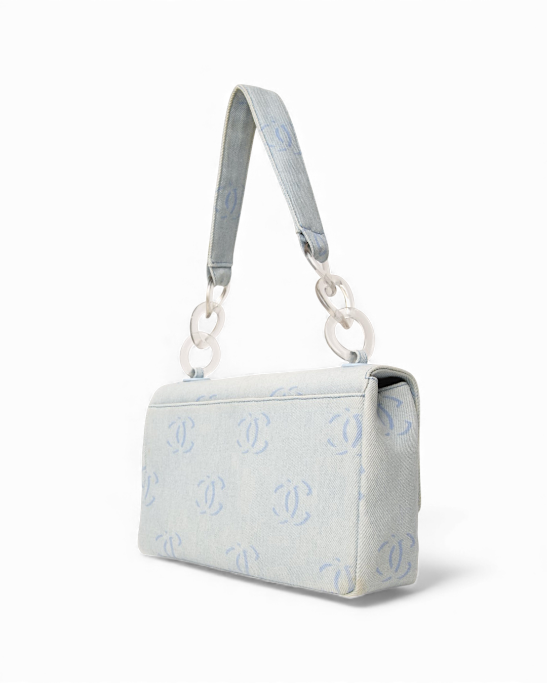 Borsa firmata Chanel, modello Sottospalla, realizzata in denim azzurra con hardware argento. Dotata di un patta con classico logo del brand trasparente “CC” e chiusura a girello, internamente rivestita in nylon nero con comode tasche, la borsa è abbastanza capiente. Munita di un manico, per una comoda portata a spalla o a mano. Anno di produzione 2002/2003. L’articolo si presenta in buone condizioni, con lievi segni di usura visibili in foto.