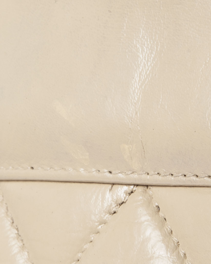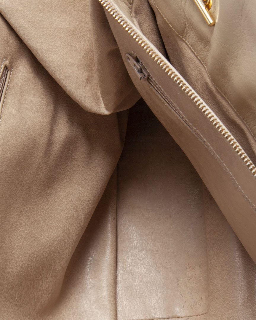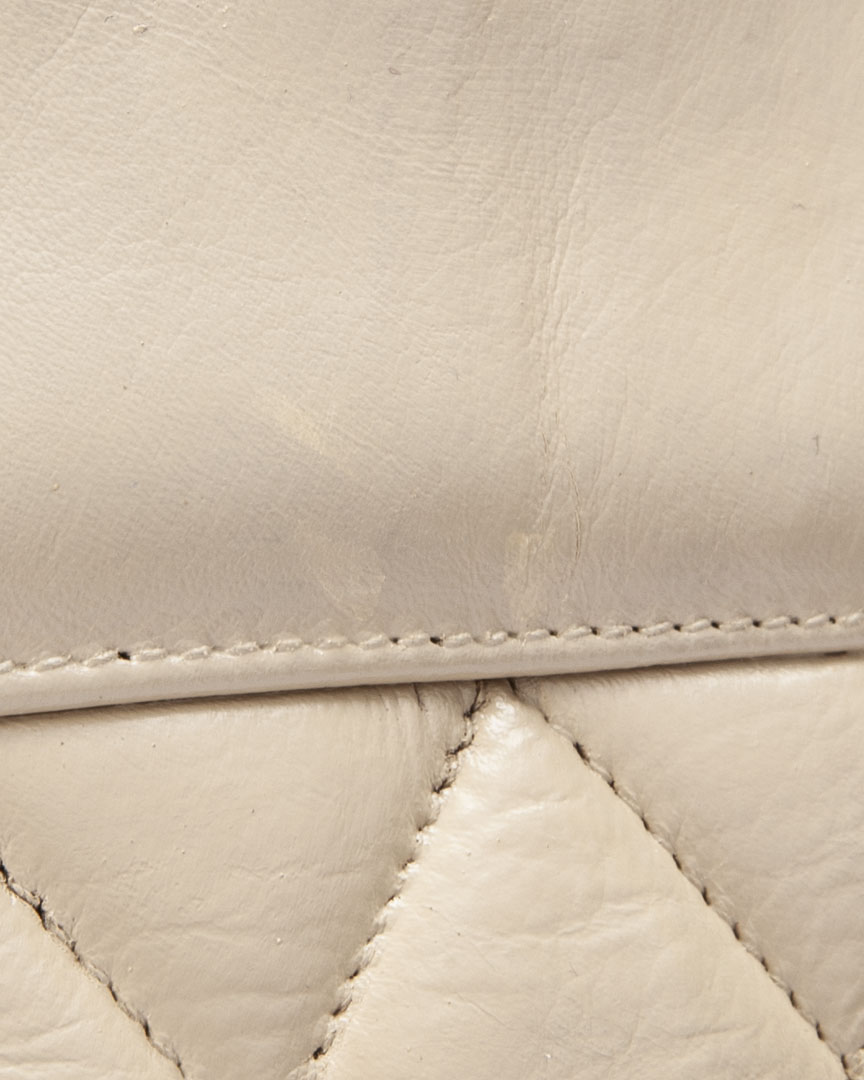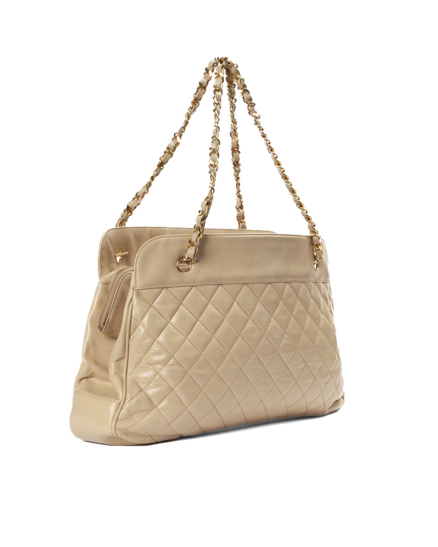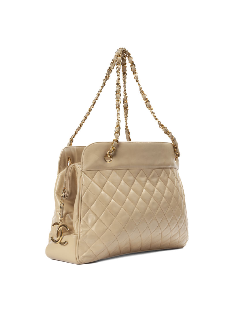 Borsa firmata Chanel, linea vintage, modello tote nella misura medium, realizzata in pelle trapuntata beige con con hardware dorato. Non è dotata di nessuna chiusura, internamente rivestita in pelle con comoda tasca centrale, la borsa è abbastanza capiente. Munita di doppio manico in pelle e catena, per una comoda portata a spalla o a mano. Anni 90.  L'articolo si presenta in buone condizioni con piccole usure visibili in foto.