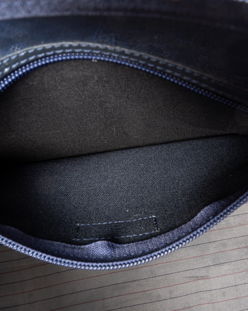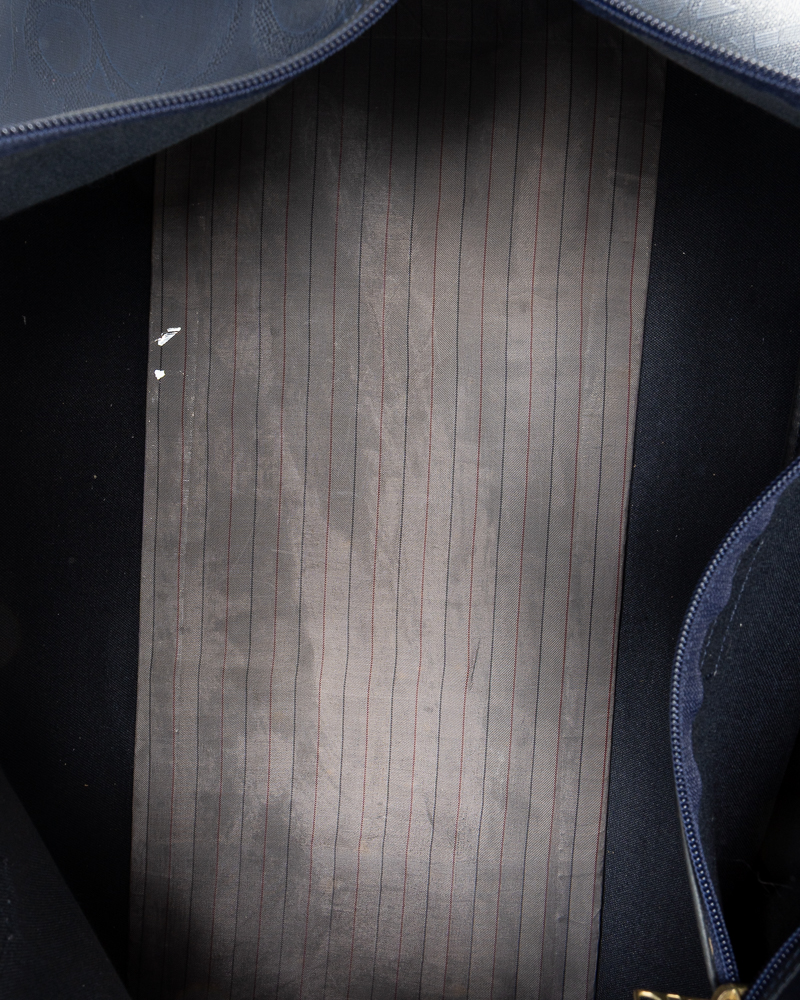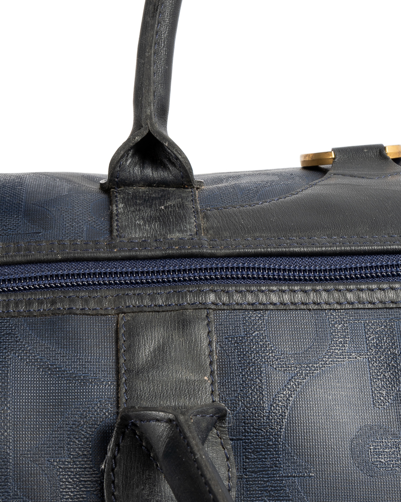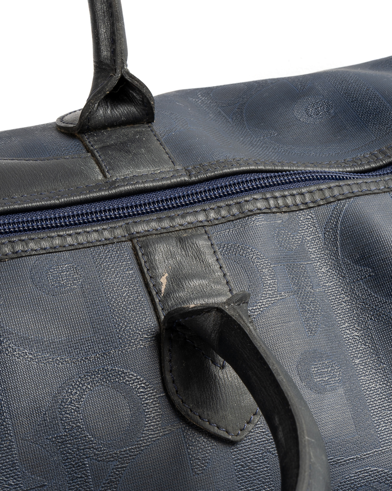 Borsone da viaggio, linea Vintage nella misura 55, realizzato in tela e pelle blu con hardware dorato. Dotato di una chiusura superiore a zip, internamente rivestito in tela tono su tono con comoda tasca, il borsone è molto capiente. Munito di doppio manico in pelle, per una comoda portata a mano. L'articolo si presenta in buone condizioni, con segni di usura visibili in foto.