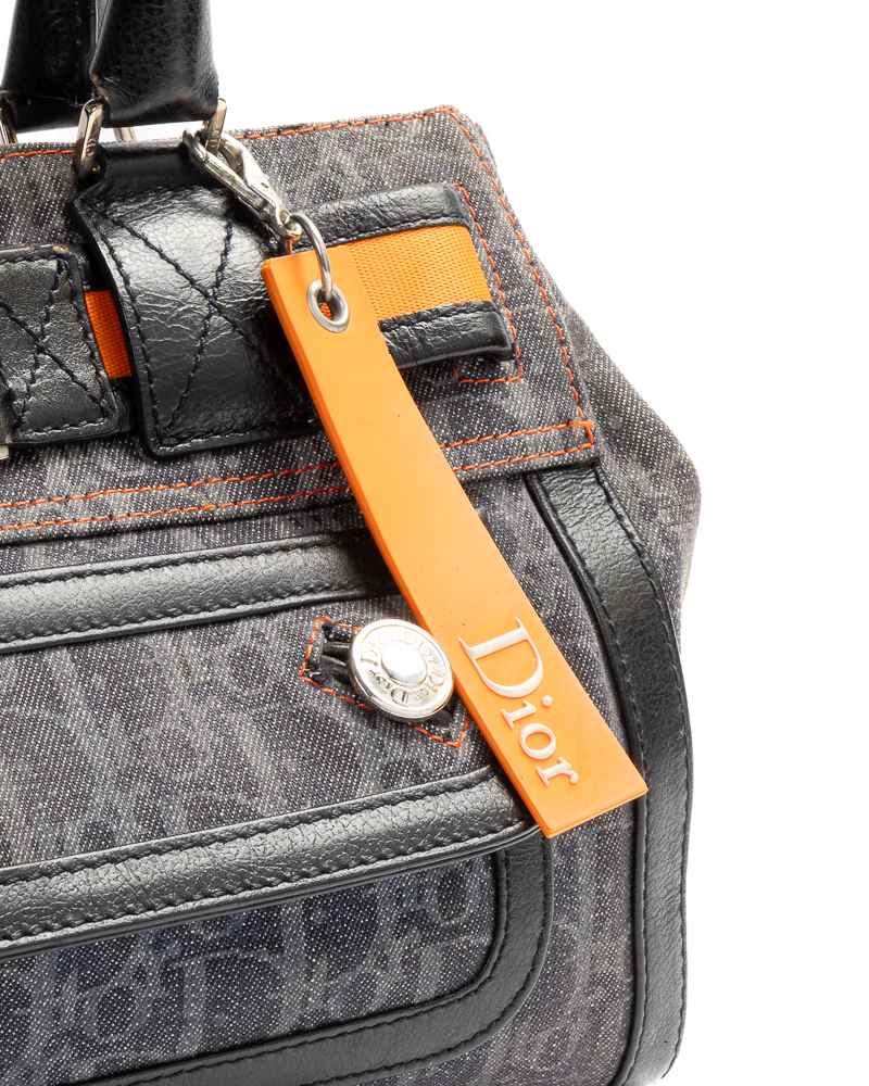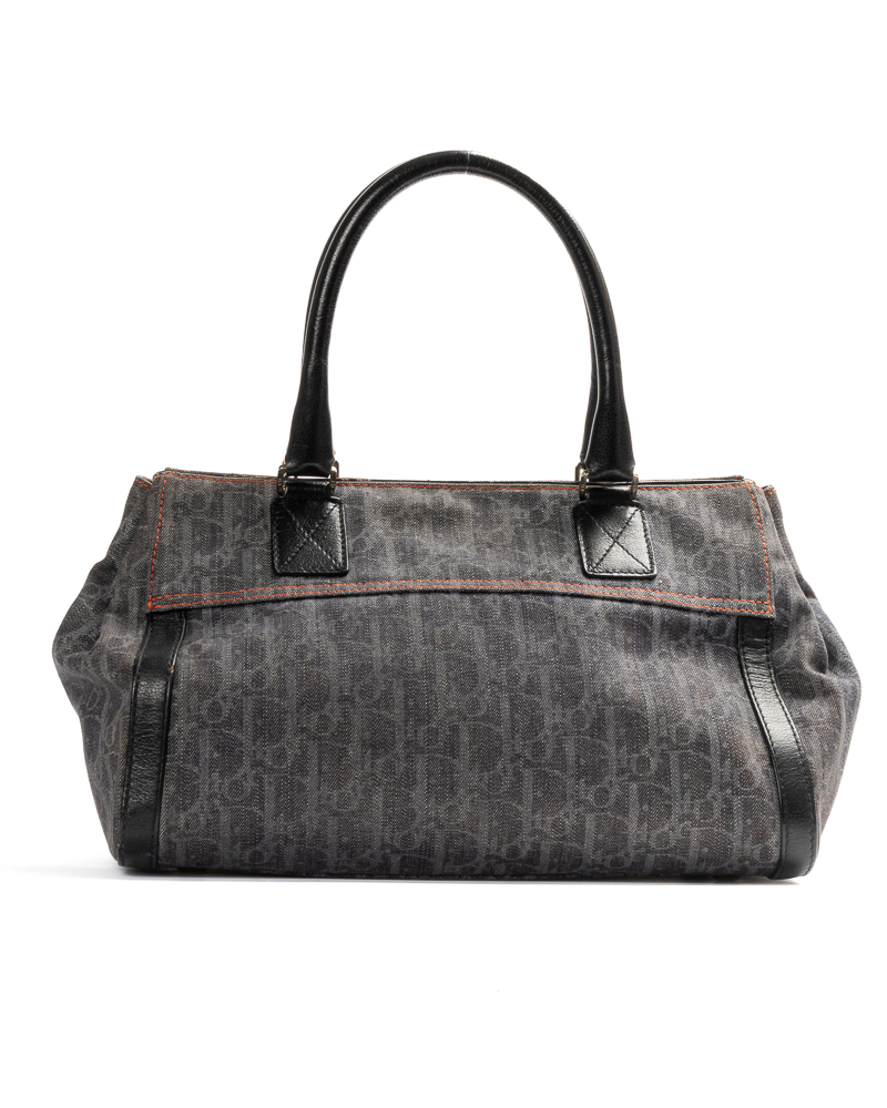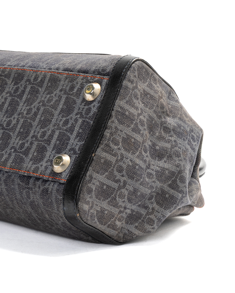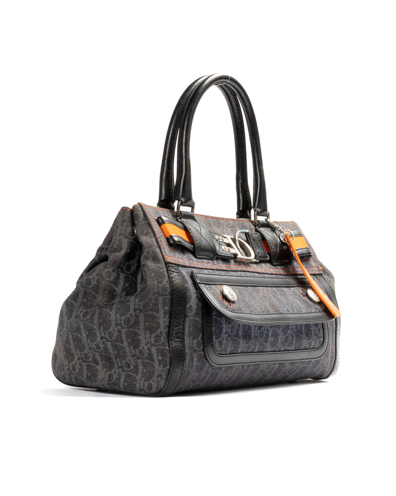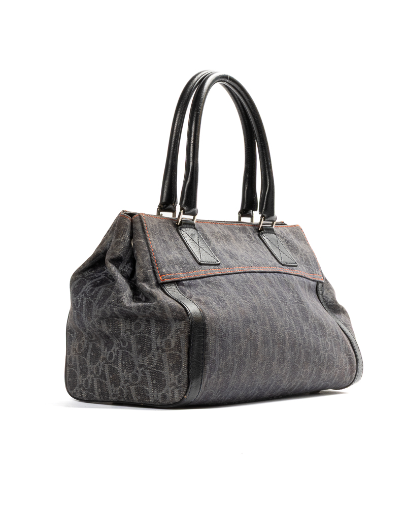 Borsa firmata Dior, linea Vintage Diorissimo, modello Filght, realizzata in tessuto nella fantasia oblique con rifiniture in pelle nera con hardware argento. Dotata di una chiusura a bottone calamitato, internamente rivestito in nylon blu con comode tasche, la borsa è abbastanza capiente. Munito di doppio manico in pelle, per una comoda portata a mano. Arricchita da una piccola tasca sulla parte frontale. L’articolo si presenta in buone condizioni con segni di usura visibili in foto.