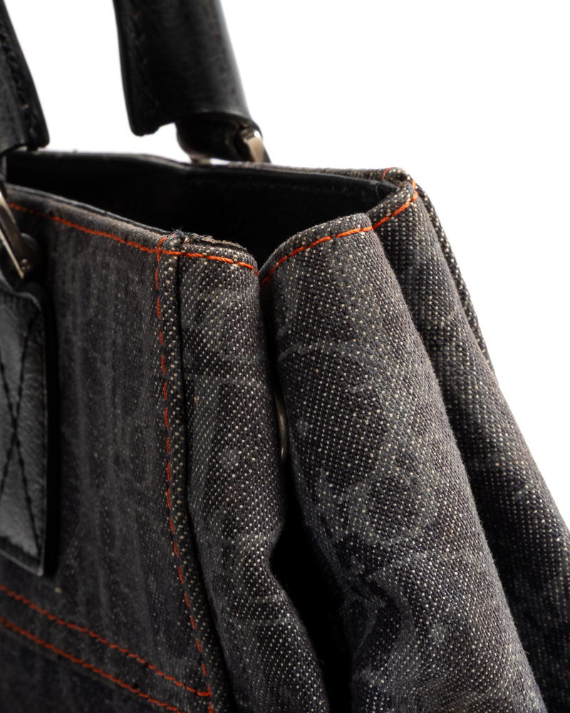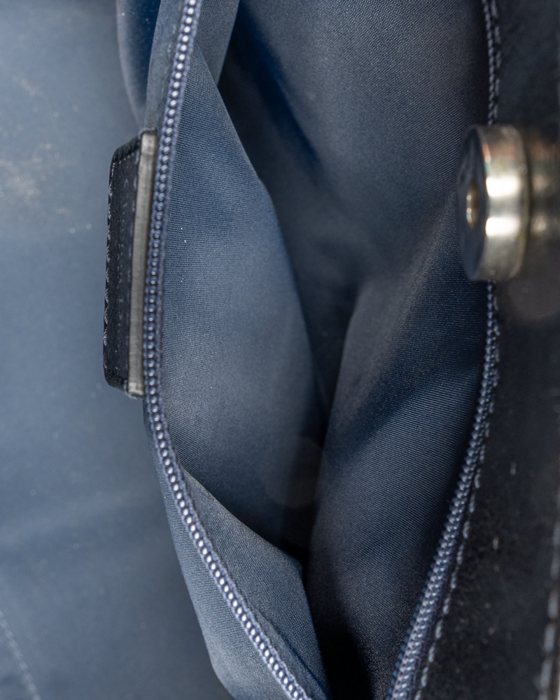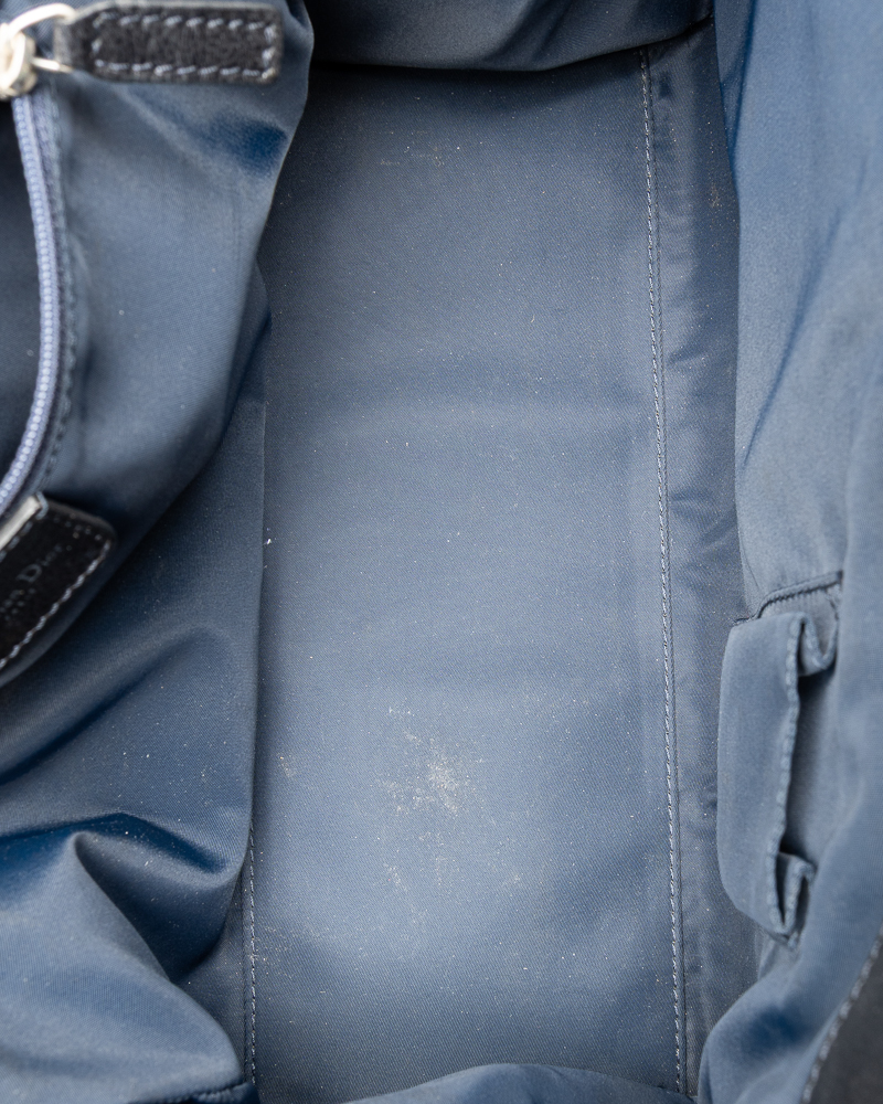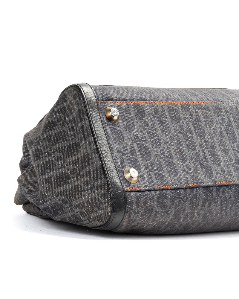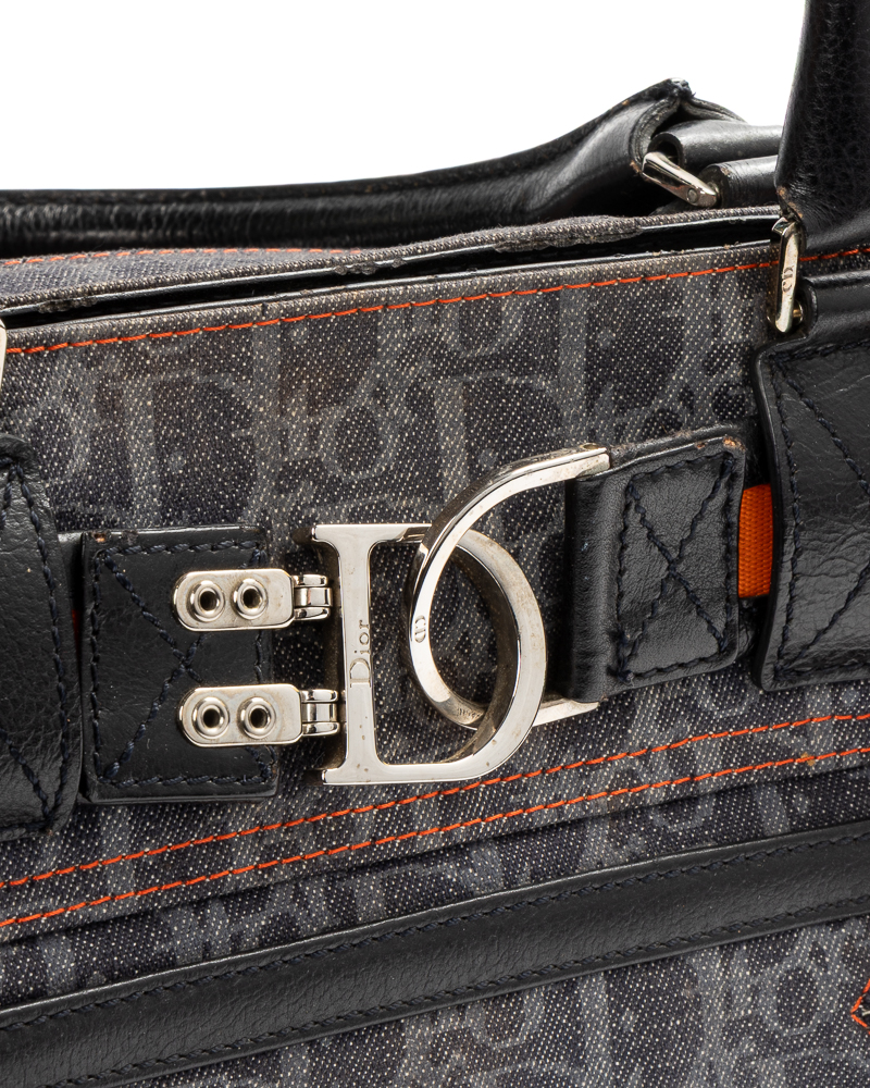 Borsa firmata Dior, linea Vintage Diorissimo, modello Filght, realizzata in tessuto nella fantasia oblique con rifiniture in pelle nera con hardware argento. Dotata di una chiusura a bottone calamitato, internamente rivestito in nylon blu con comode tasche, la borsa è abbastanza capiente. Munito di doppio manico in pelle, per una comoda portata a mano. Arricchita da una piccola tasca sulla parte frontale. L’articolo si presenta in buone condizioni con segni di usura visibili in foto.
