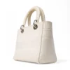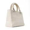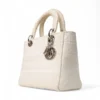 Borsa firmata Dior, modello Lady D-Lite nella misura Medium, realizzata in tessuto panna con motivo cannage e hardware argento. Dotata di una chiusura con patta, internamente rivestita in tessuto tono su tono con comoda tasca, la borsa è abbastanza capiente. Munita di doppio manico e di una tracolla rimovibile, per una comoda portata a mano o a spalla. Arricchita dai ciondoli “D.I.O.R.” in metallo argento. L’articolo si presenta in buone condizioni con segni di usura visibile nelle foto.