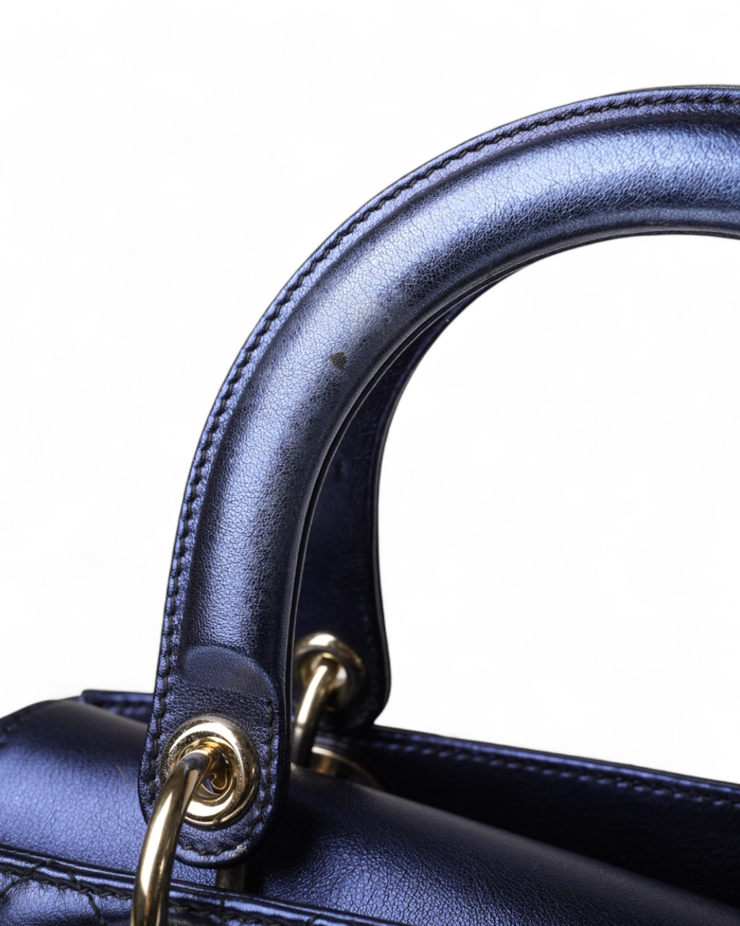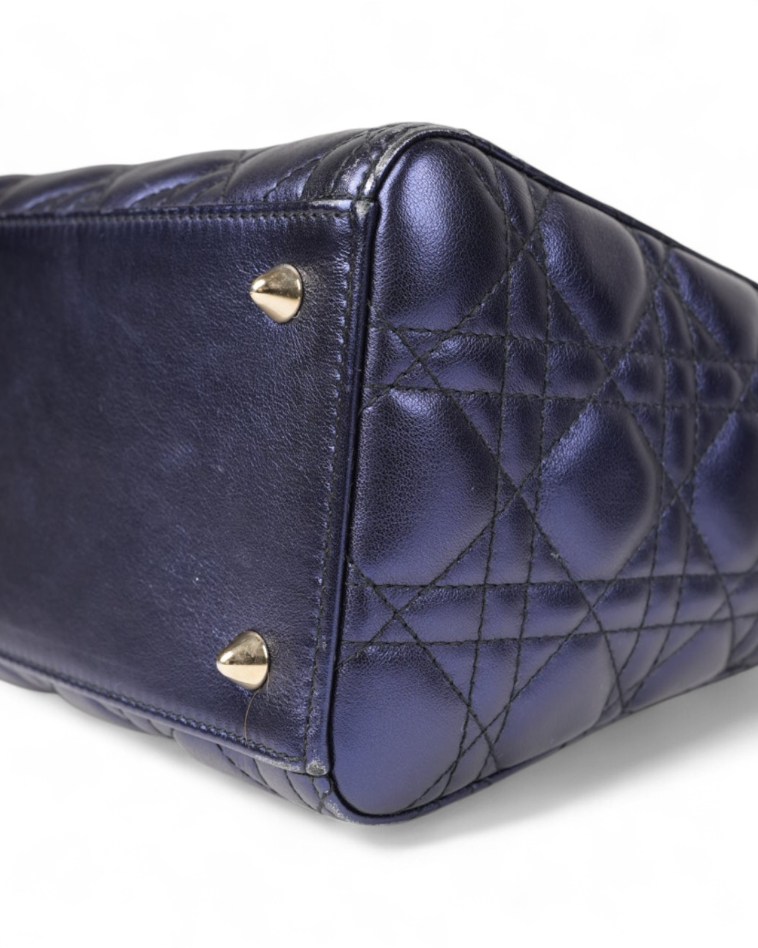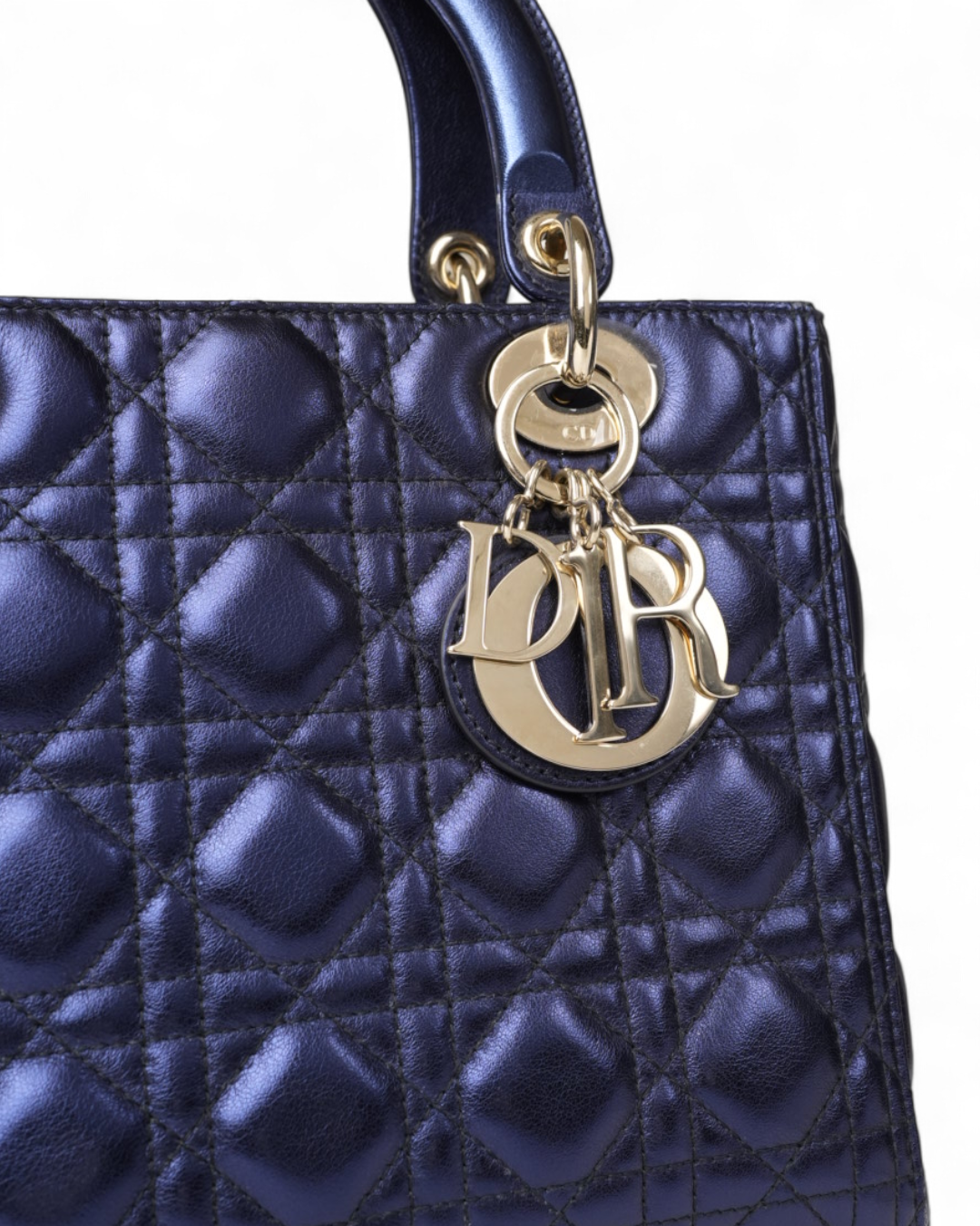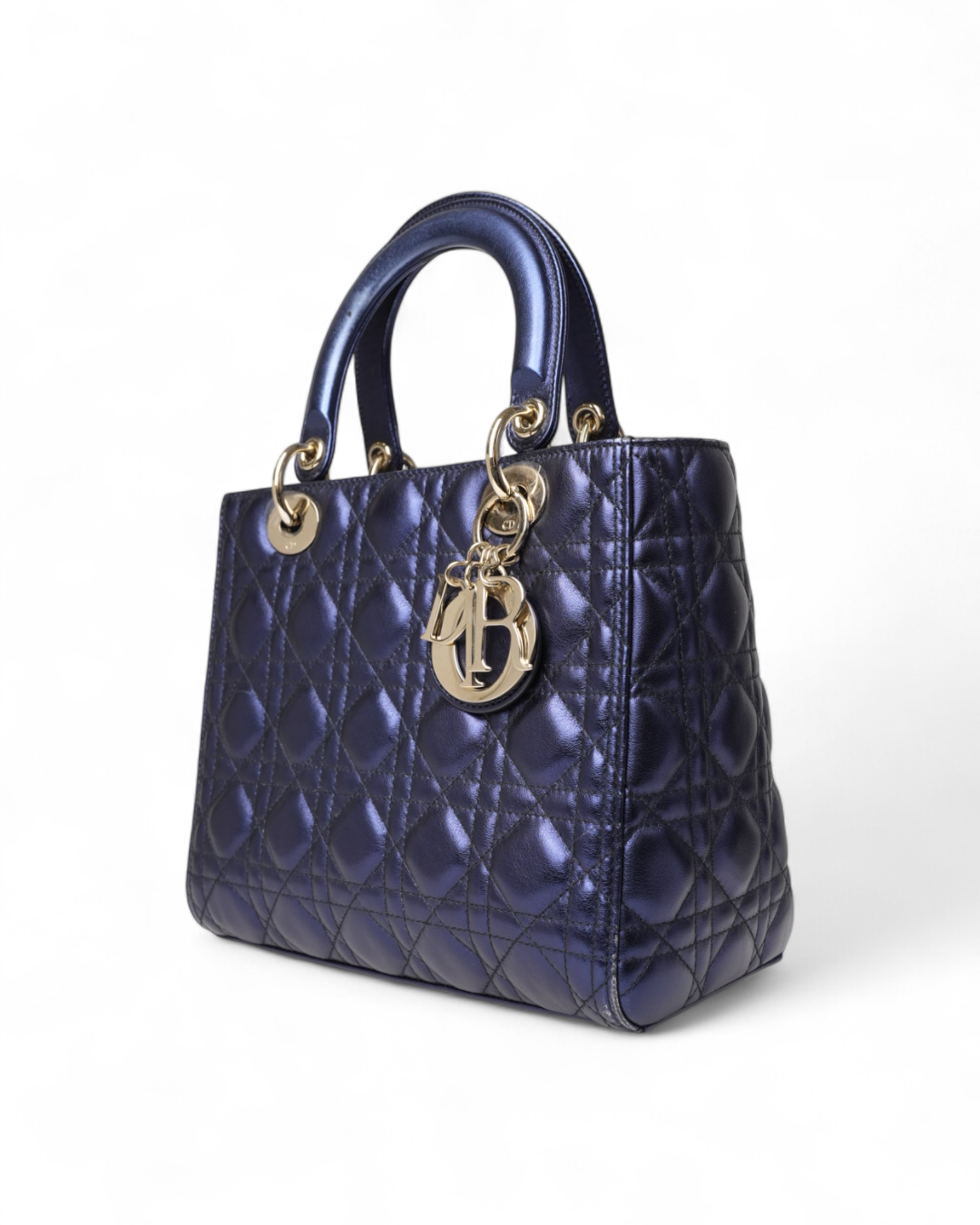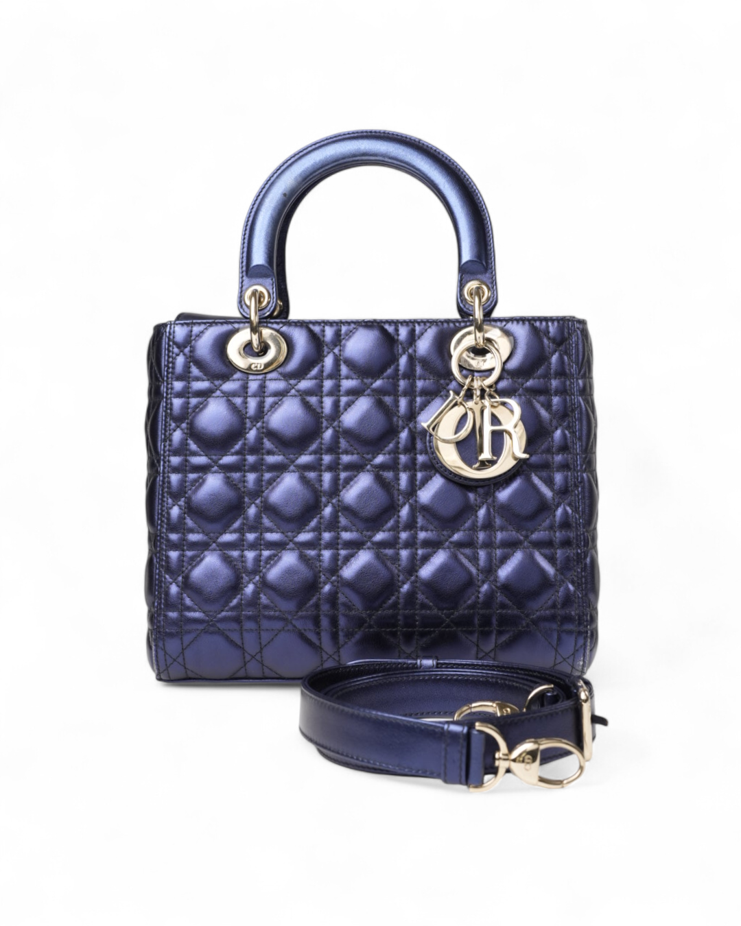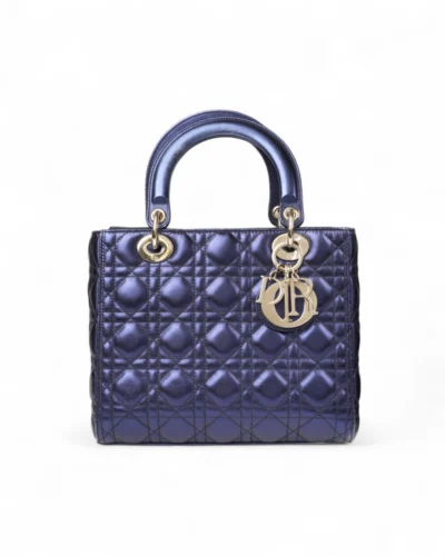 Borsa firmata Dior, modello Lady nella misura medium, realizzata in pelle con motivo cannage metallizzato con hardware dorato. Dotata di una chiusura a patta, internamente rivestita in tessuto scamosciato blu con comode tasche, la borsa è abbastanza capiente. Munita di un manico e di una tracolla rimovibile e regolabile, per una comoda portata a mano o a spalla. I ciondoli “D.I.O.R.” in metallo arricchiscono il design, conferendo un tocco distintivo. L’articolo si presenta in buone condizioni, con segni di usura visibili in foto.