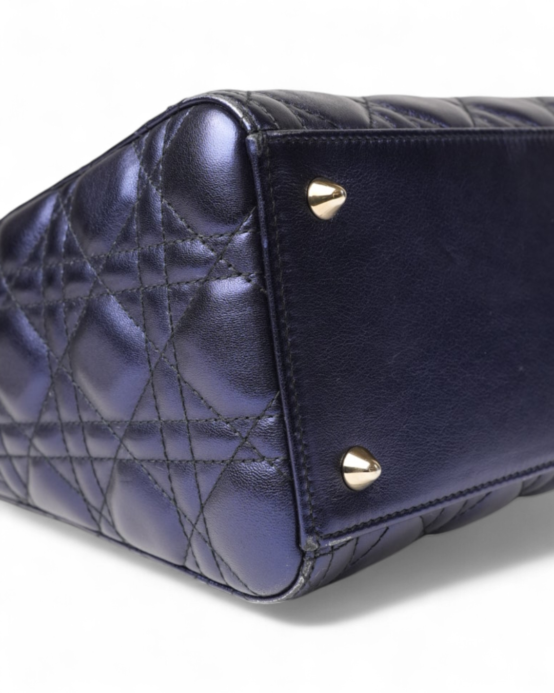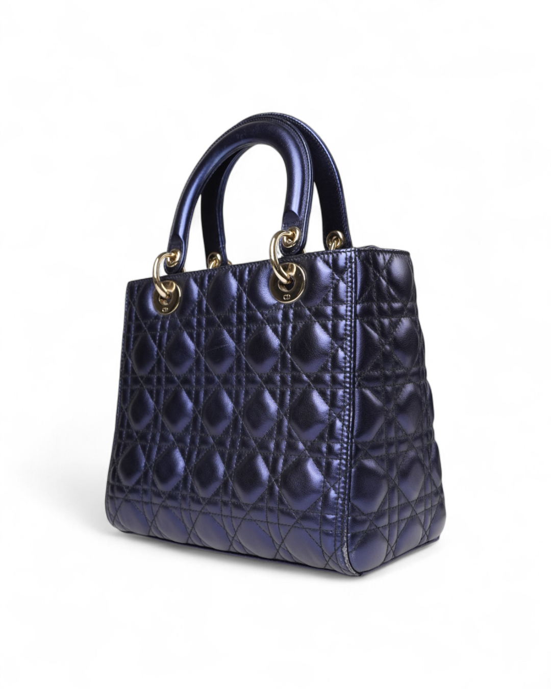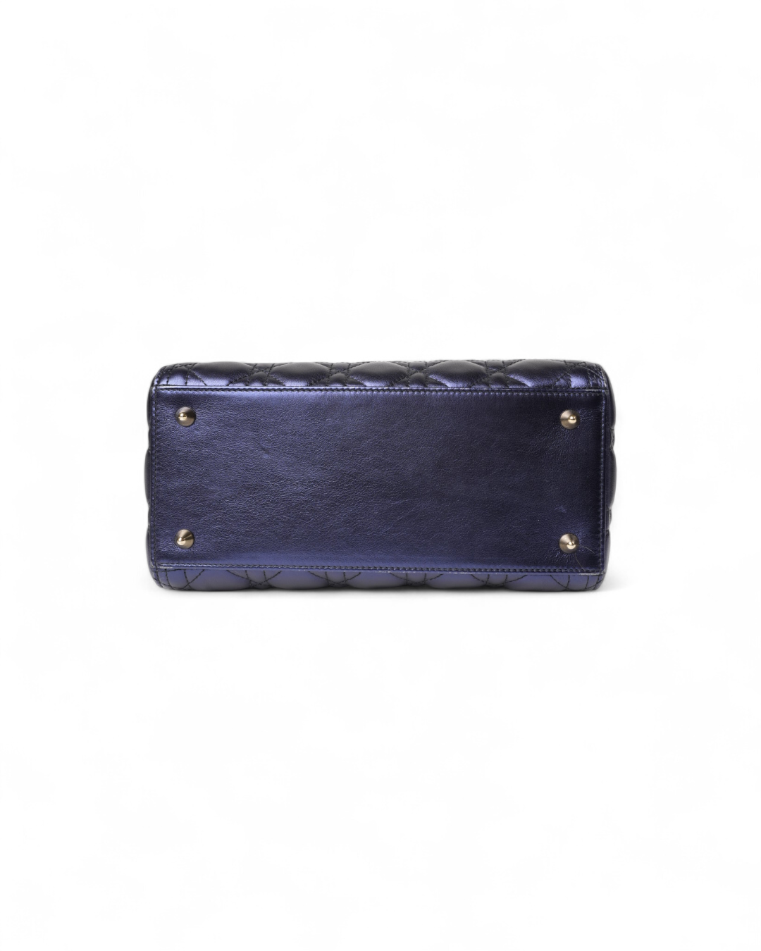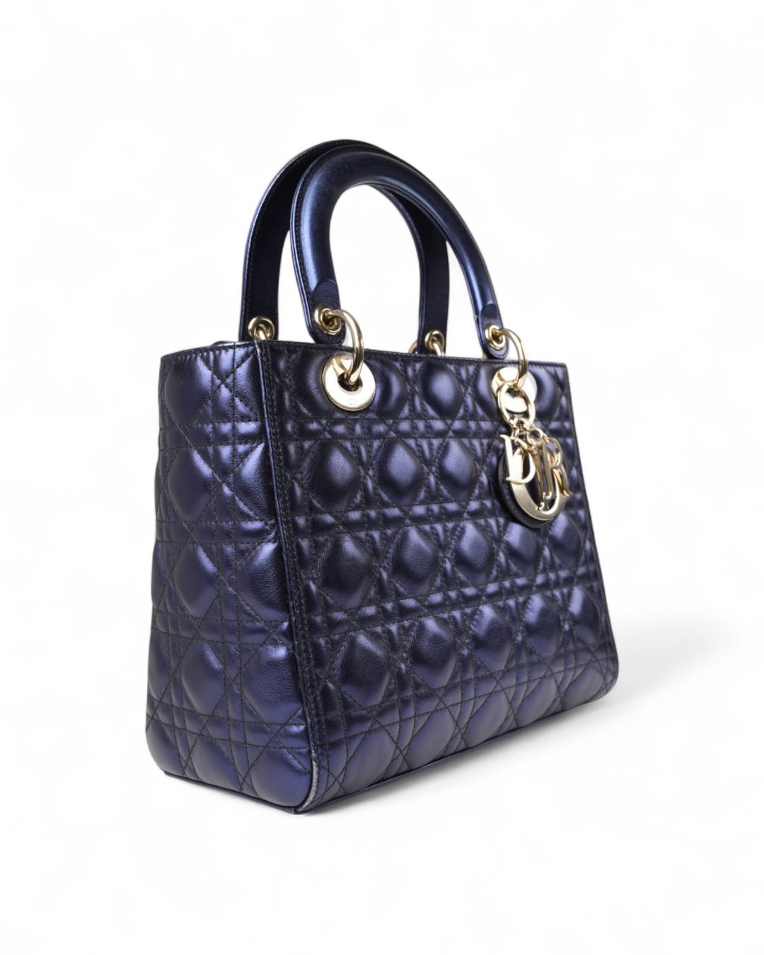 Borsa firmata Dior, modello Lady nella misura medium, realizzata in pelle con motivo cannage metallizzato con hardware dorato. Dotata di una chiusura a patta, internamente rivestita in tessuto scamosciato blu con comode tasche, la borsa è abbastanza capiente. Munita di un manico e di una tracolla rimovibile e regolabile, per una comoda portata a mano o a spalla. I ciondoli “D.I.O.R.” in metallo arricchiscono il design, conferendo un tocco distintivo. L’articolo si presenta in buone condizioni, con segni di usura visibili in foto.