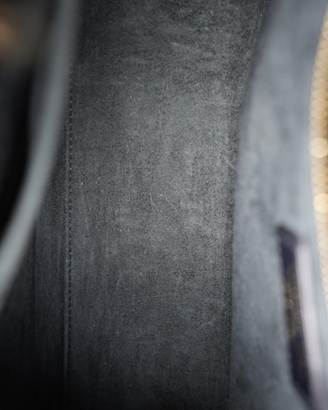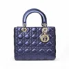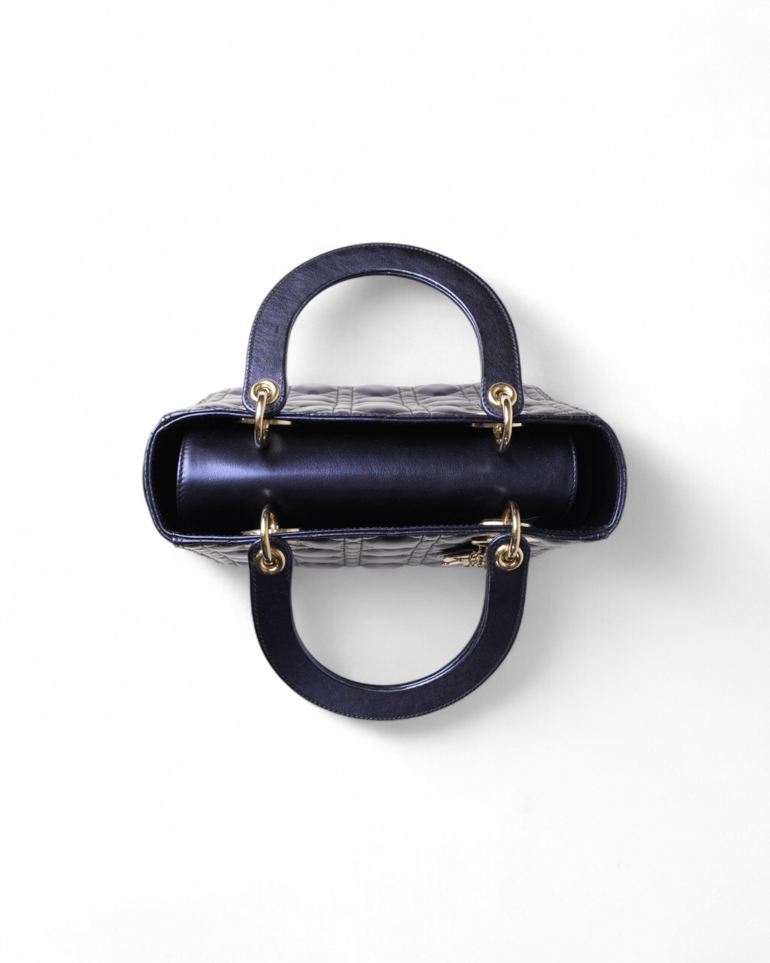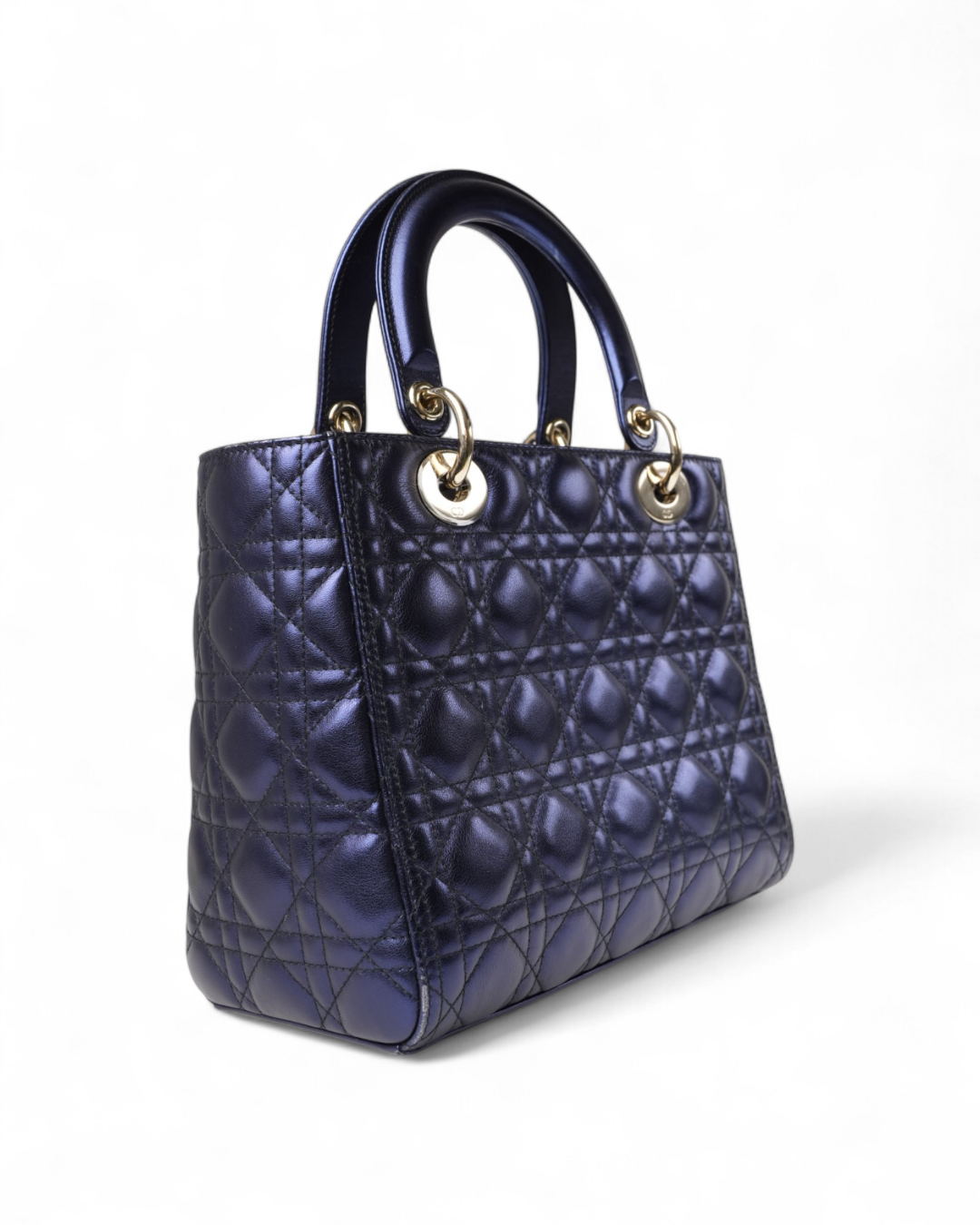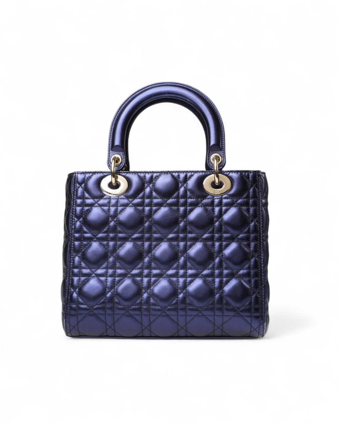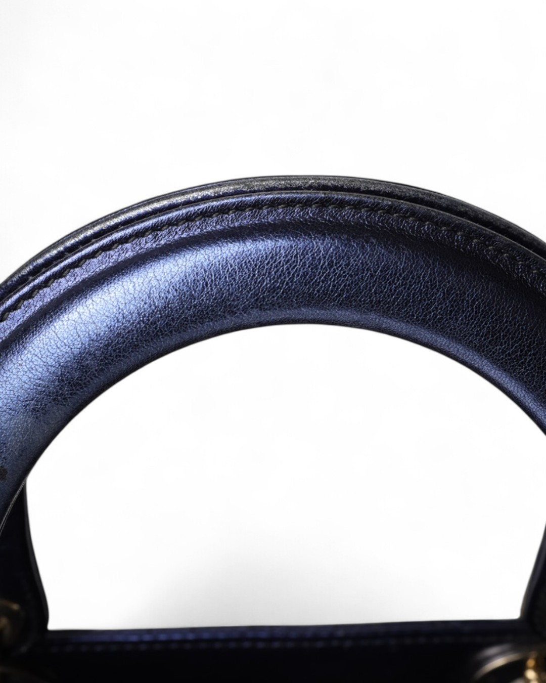 Borsa firmata Dior, modello Lady nella misura medium, realizzata in pelle con motivo cannage metallizzato con hardware dorato. Dotata di una chiusura a patta, internamente rivestita in tessuto scamosciato blu con comode tasche, la borsa è abbastanza capiente. Munita di un manico e di una tracolla rimovibile e regolabile, per una comoda portata a mano o a spalla. I ciondoli “D.I.O.R.” in metallo arricchiscono il design, conferendo un tocco distintivo. L’articolo si presenta in buone condizioni, con segni di usura visibili in foto.
