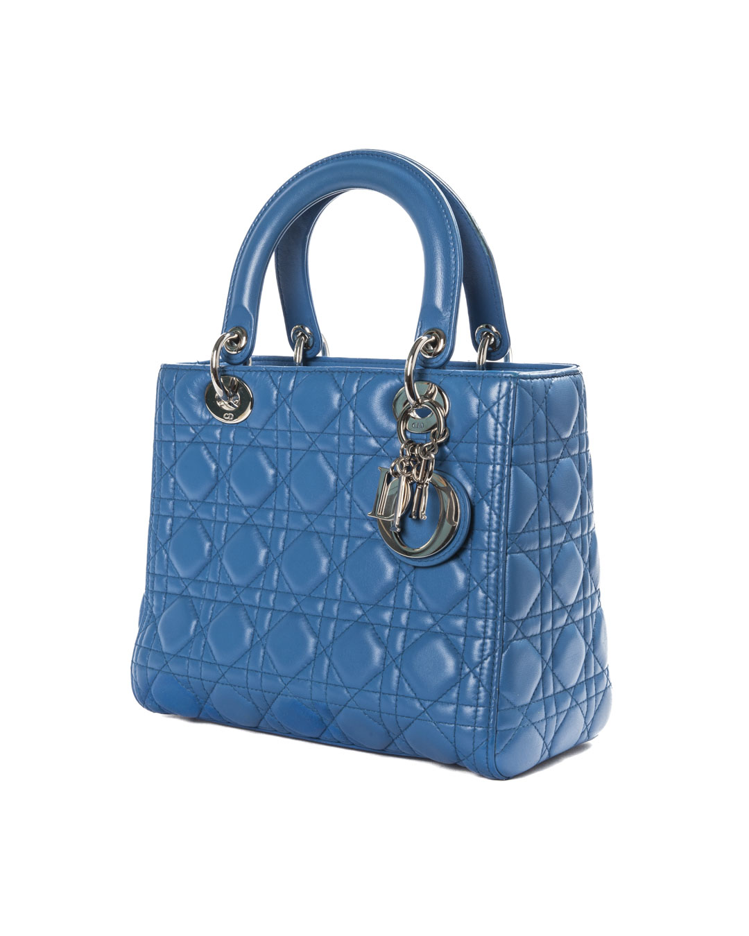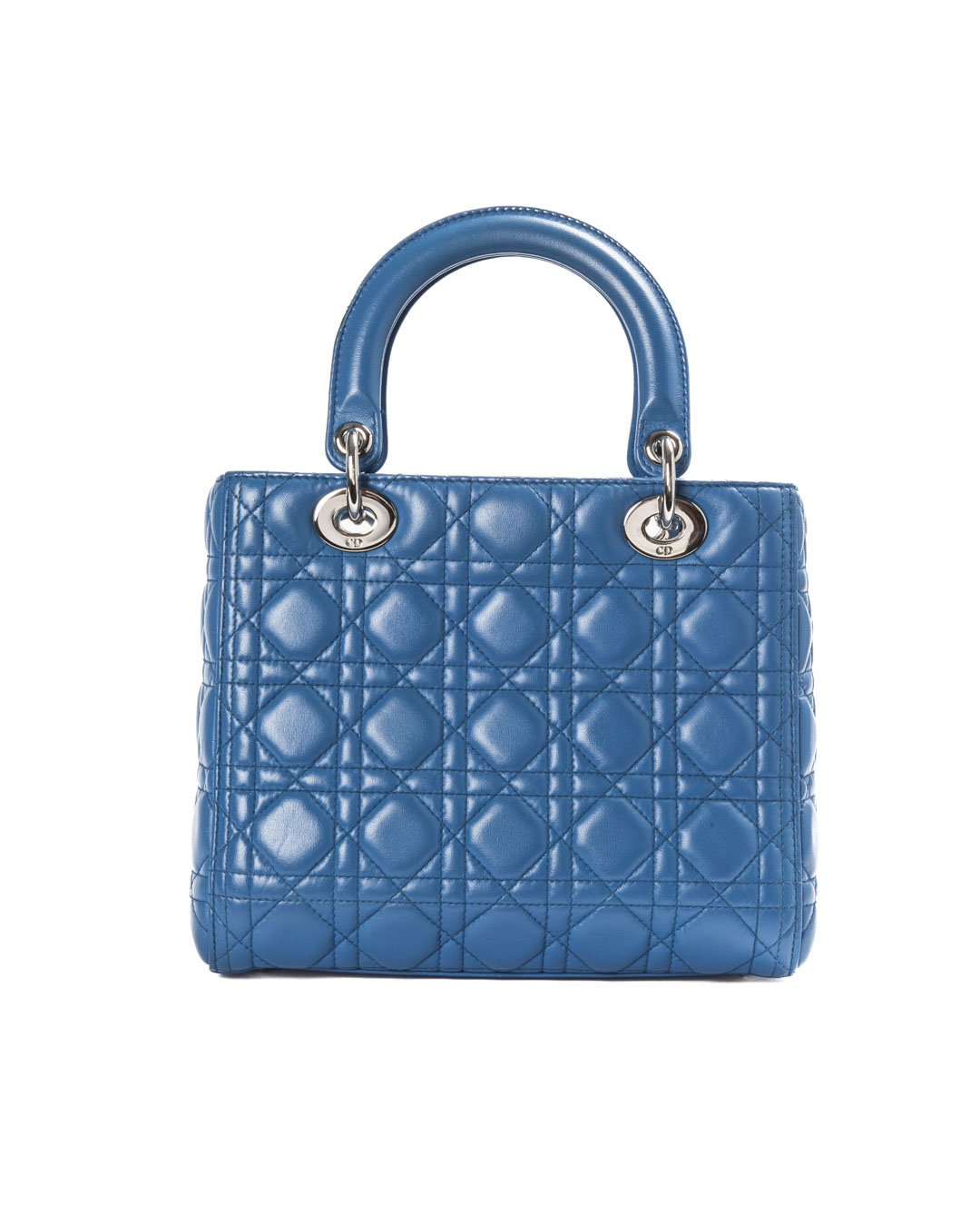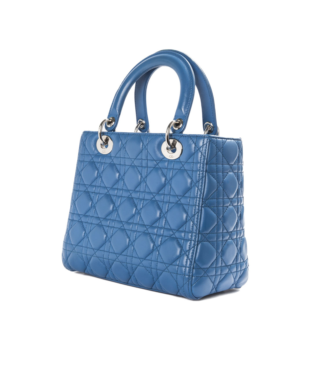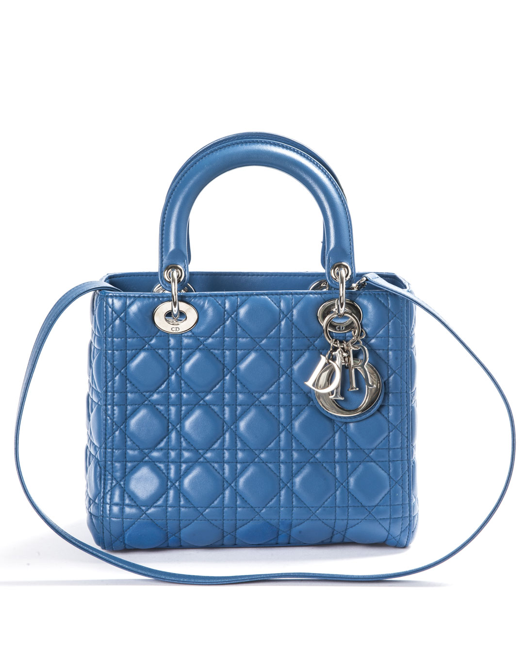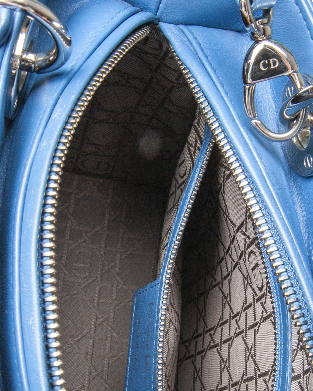 Borsa firmata Dior, modello Lady Vintage nella misura Medium, realizzata in pelle Cannage Blu  con dettagli in hardware argento. Dotata di una chiusura con zip, l’interno è rivestito in tela grigia logata e offre una comoda tasca per una facile organizzazione. La borsa presenta un doppio manico in pelle e una tracolla rimovibile, permettendo di indossarla sia a mano che a spalla. Arricchita dai ciondoli “D.I.O.R.” in metallo  argentato , che aggiungono un tocco distintivo. L’articolo si presenta in buone condizioni, con segni di usura visibili in foto.