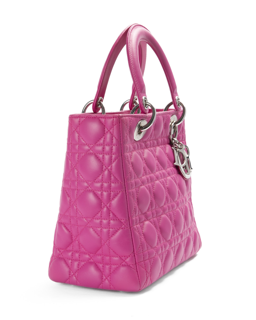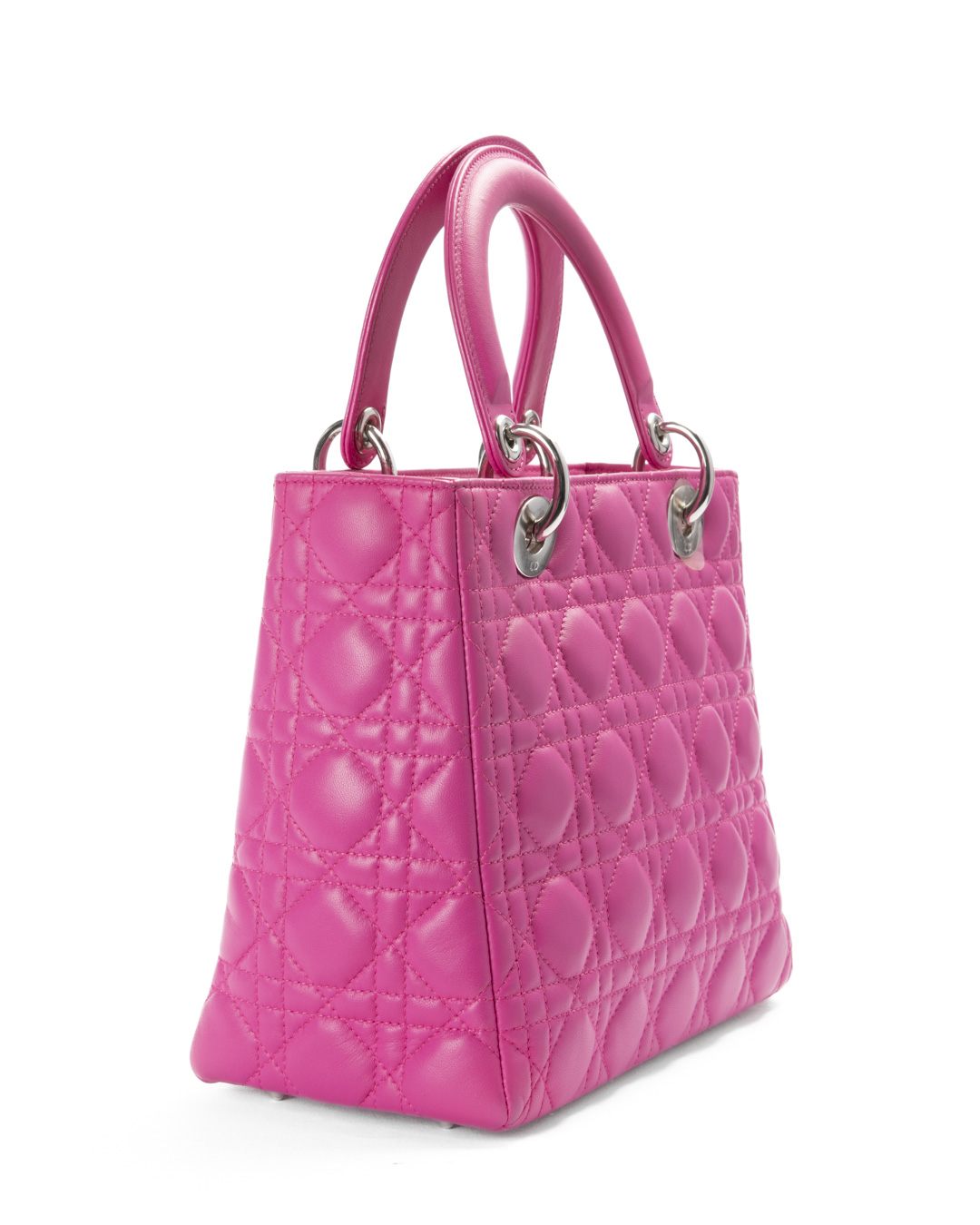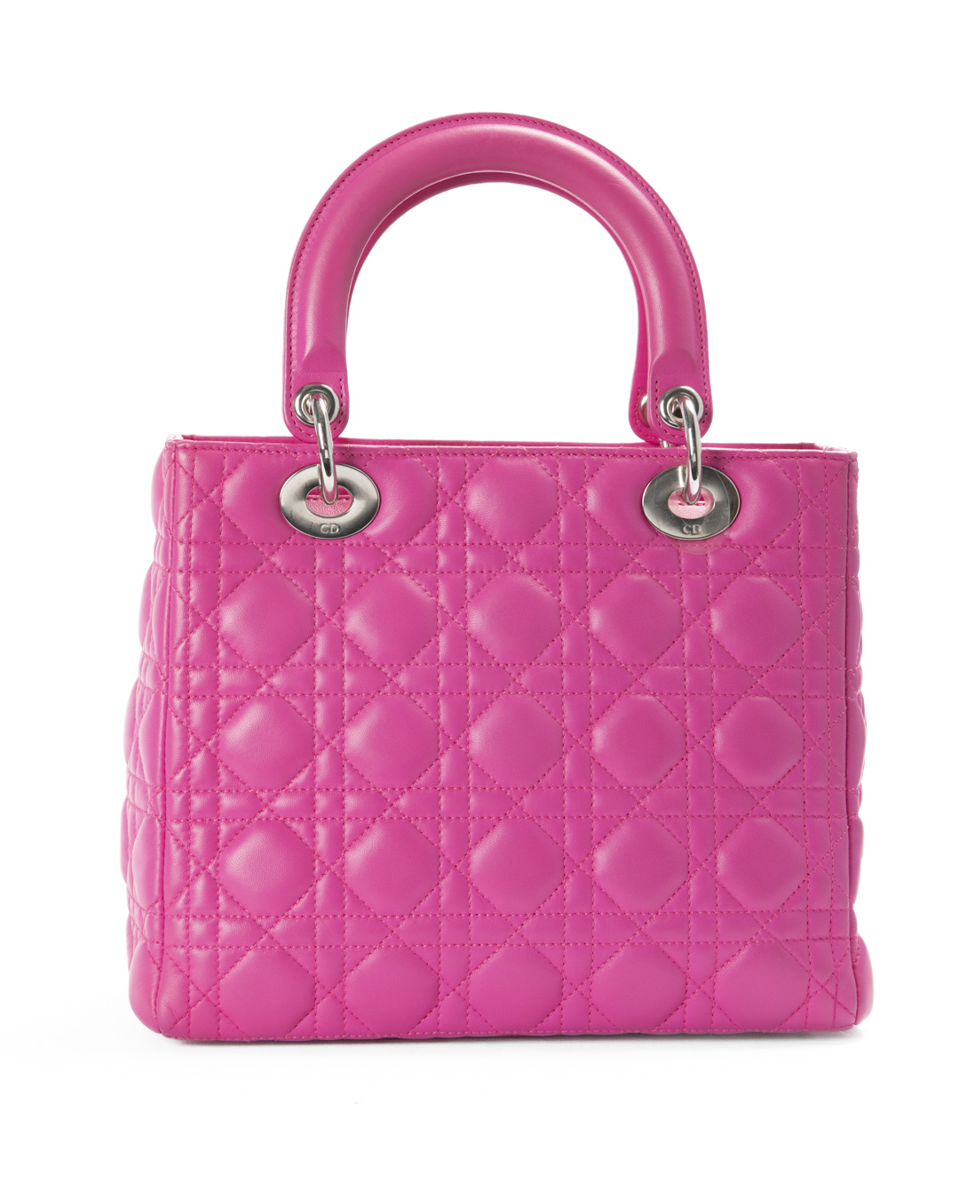 Borsa firmata Dior, linea vintage, modello Lady nella misura medium, realizzata in pelle fucsia con cuciture cannage e hardware argento. Dotata di una chiusura superiore a zip, internamente rivestita in tela logata grigia con comoda tasca, la borsa è abbastanza capiente. Munita di doppio manico e di una tracolla rimovibile, per una comoda portata a mano o a spalla.  I ciondoli “D.I.O.R.” in metallo arricchiscono il design, conferendo un tocco distintivo. L'articolo si presenta in ottime condizioni.
