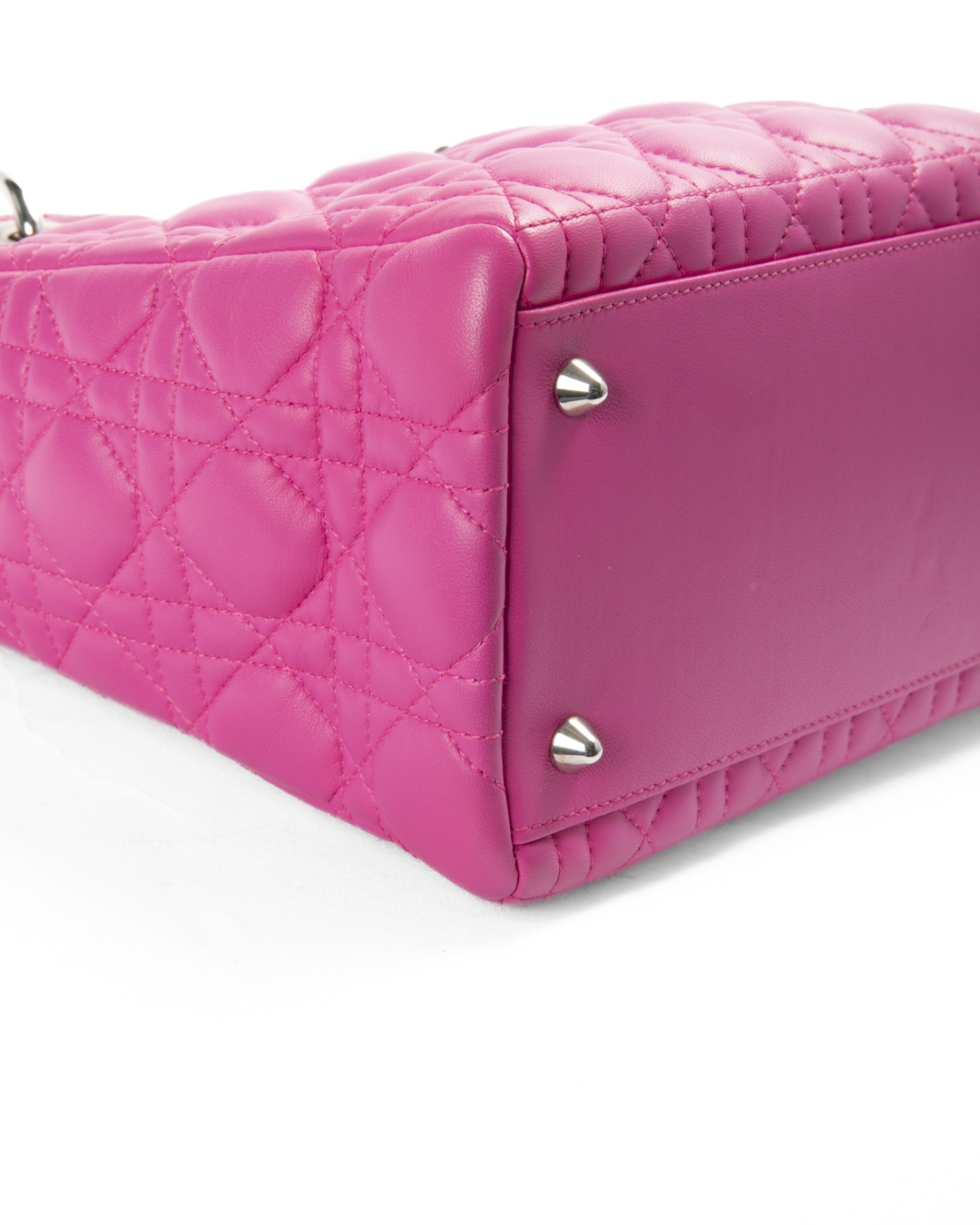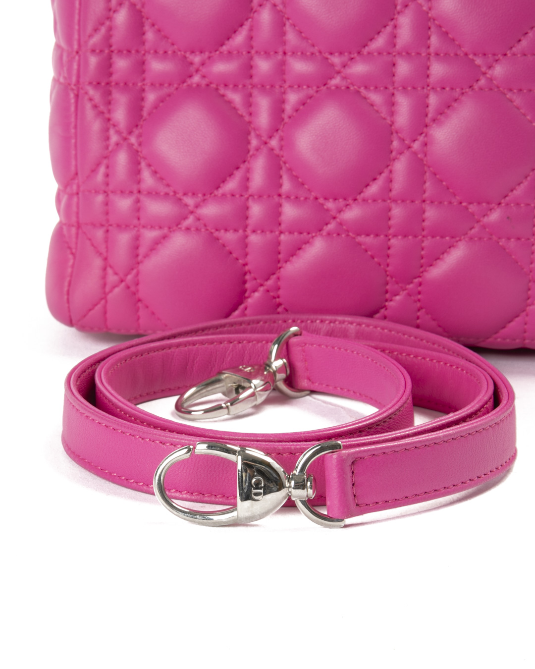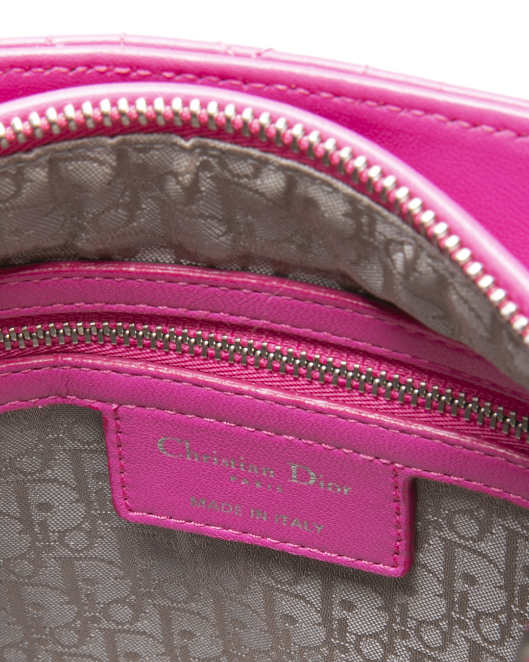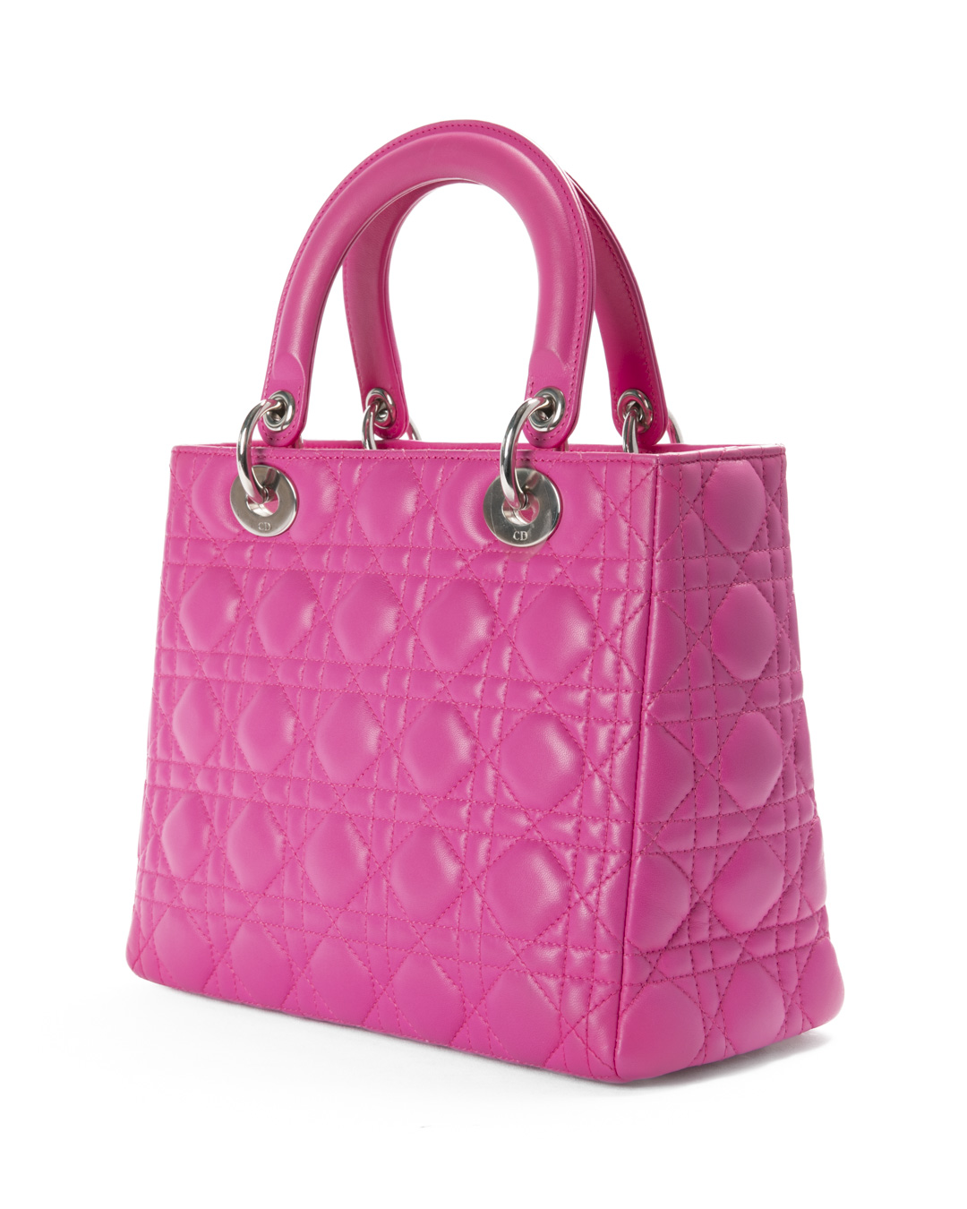 Borsa firmata Dior, linea vintage, modello Lady nella misura medium, realizzata in pelle fucsia con cuciture cannage e hardware argento. Dotata di una chiusura superiore a zip, internamente rivestita in tela logata grigia con comoda tasca, la borsa è abbastanza capiente. Munita di doppio manico e di una tracolla rimovibile, per una comoda portata a mano o a spalla.  I ciondoli “D.I.O.R.” in metallo arricchiscono il design, conferendo un tocco distintivo. L'articolo si presenta in ottime condizioni.