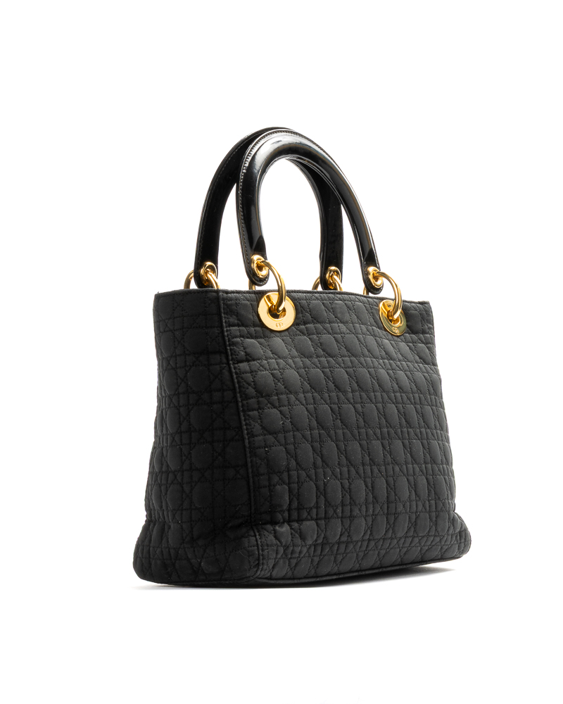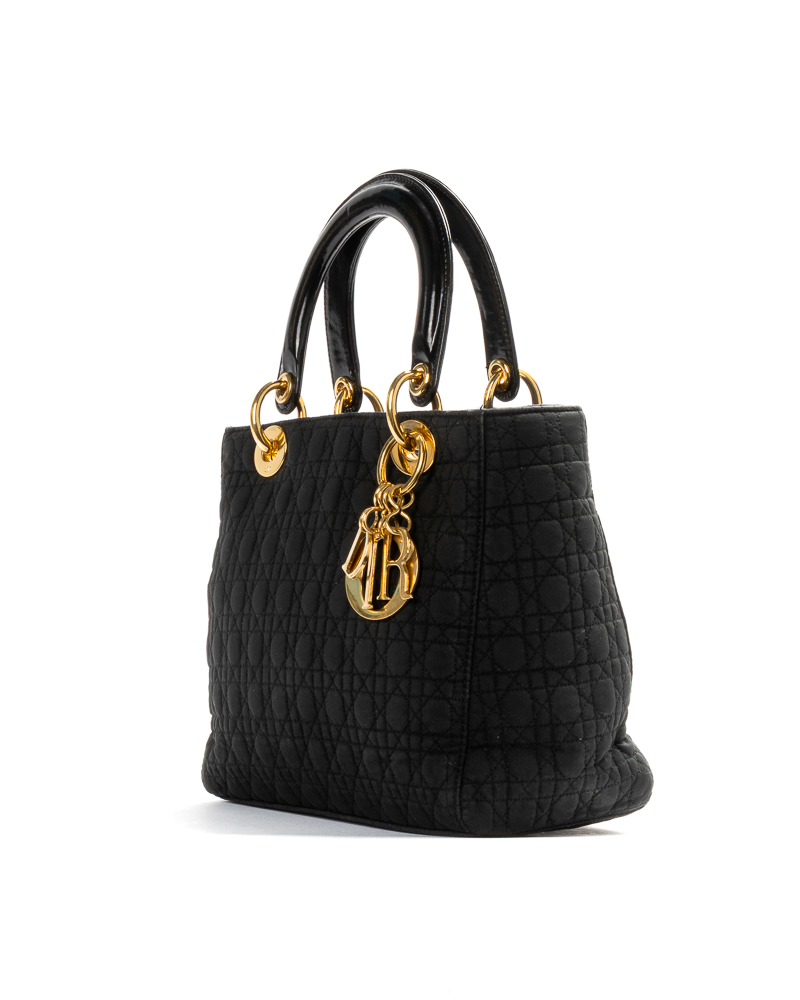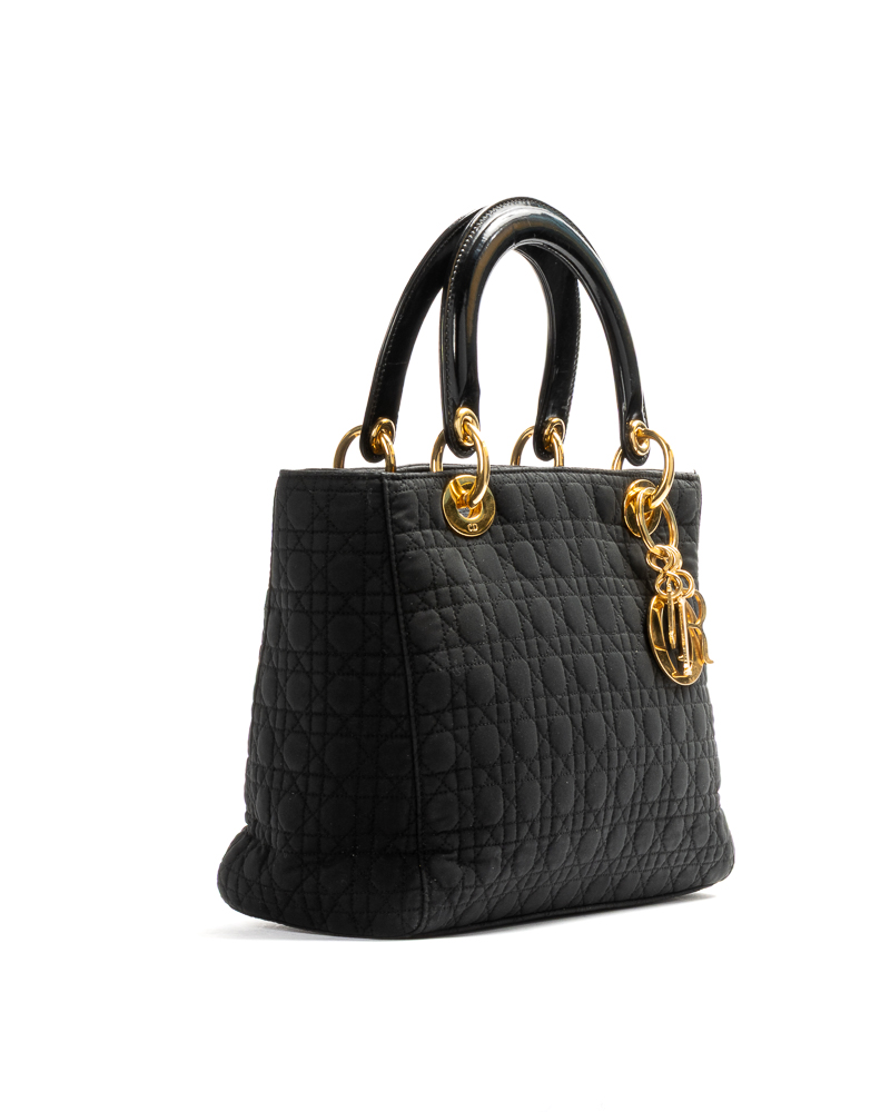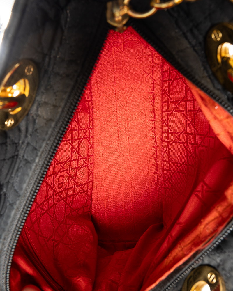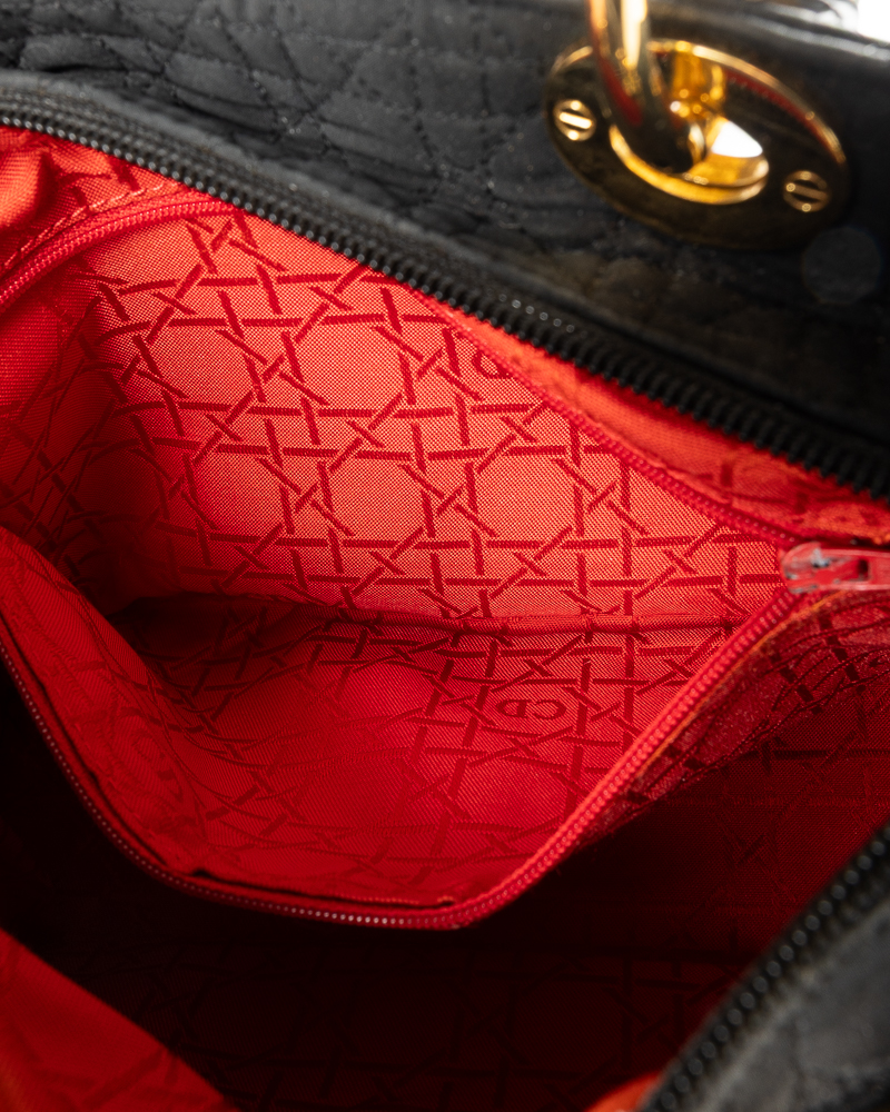 Borsa firmata Dior, linea Vintage, modello lady nella misura medium, realizzata in tessuto nero con hardware dorato. Dotata di una chiusura superiore a zip, internamente rivestita in tessuto rosso con comoda tasca, la borsa è abbastanza capiente. Munita di doppio manico in pelle, per una comoda portata a mano.  I ciondoli “D.I.O.R.” in metallo arricchiscono il design, conferendo un tocco distintivo. L’articolo si presenta in buone condizioni.
