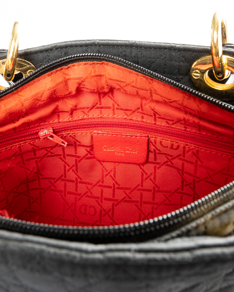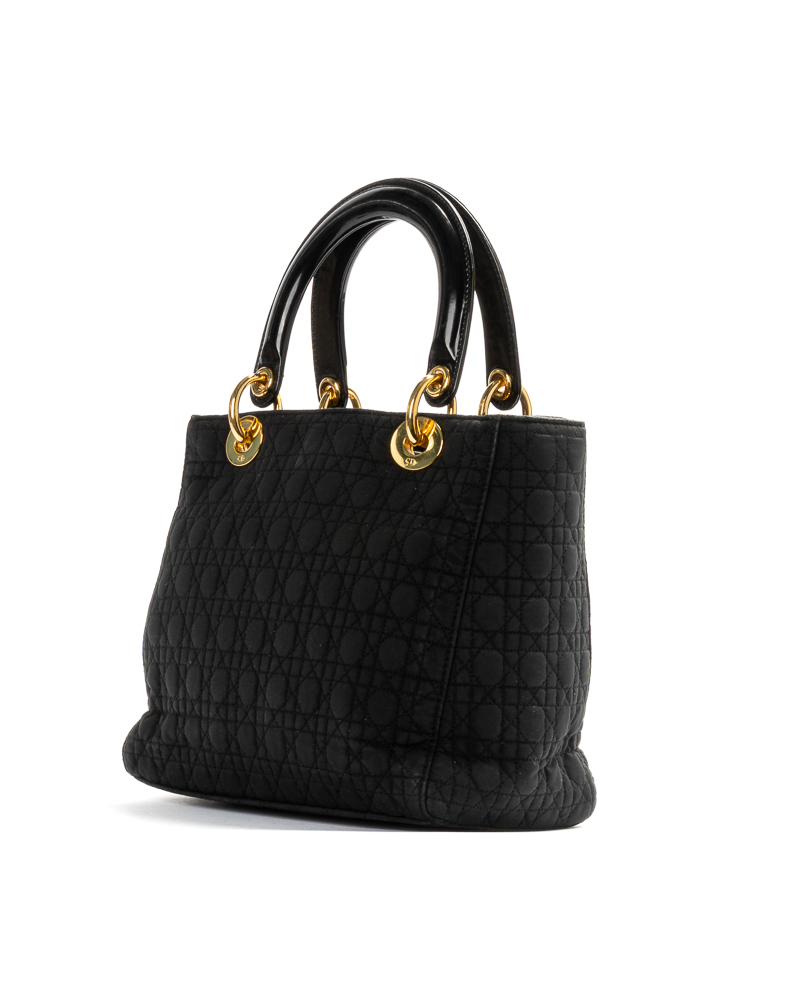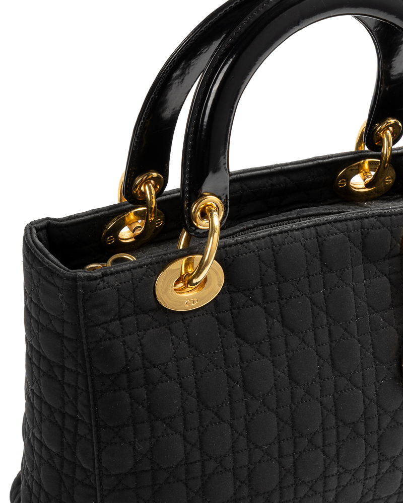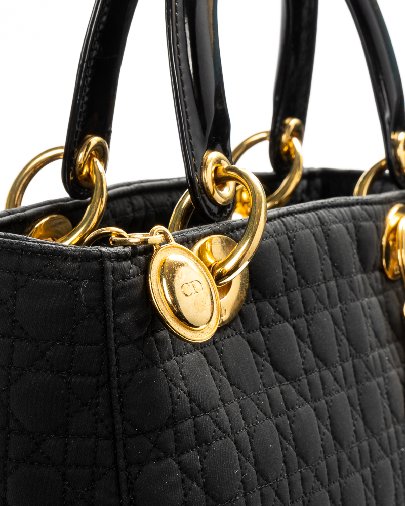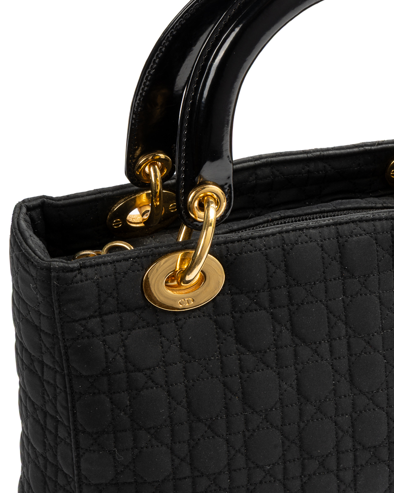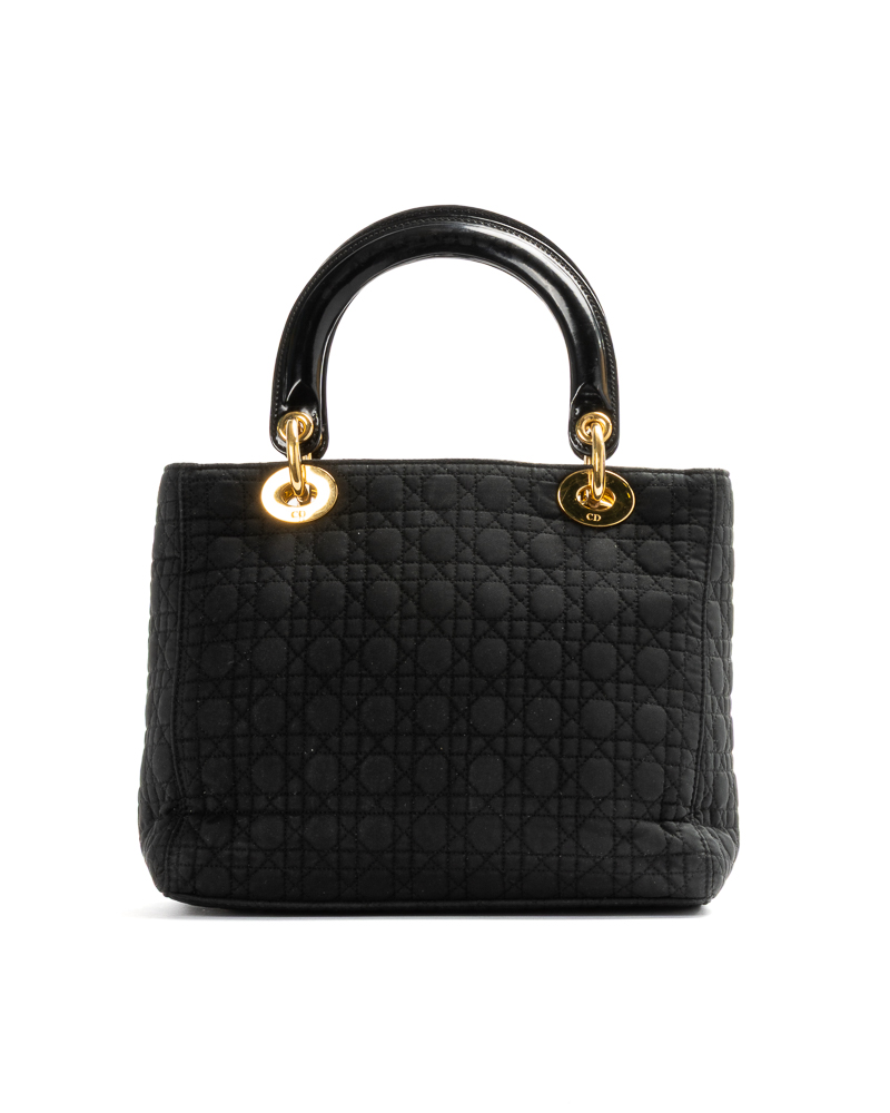 Borsa firmata Dior, linea Vintage, modello lady nella misura medium, realizzata in tessuto nero con hardware dorato. Dotata di una chiusura superiore a zip, internamente rivestita in tessuto rosso con comoda tasca, la borsa è abbastanza capiente. Munita di doppio manico in pelle, per una comoda portata a mano.  I ciondoli “D.I.O.R.” in metallo arricchiscono il design, conferendo un tocco distintivo. L’articolo si presenta in buone condizioni.