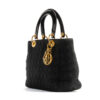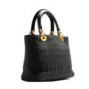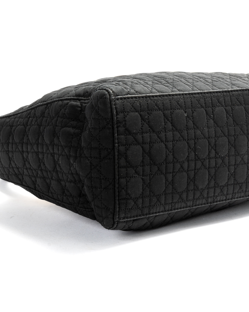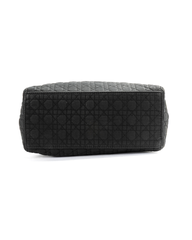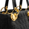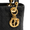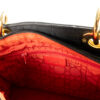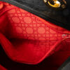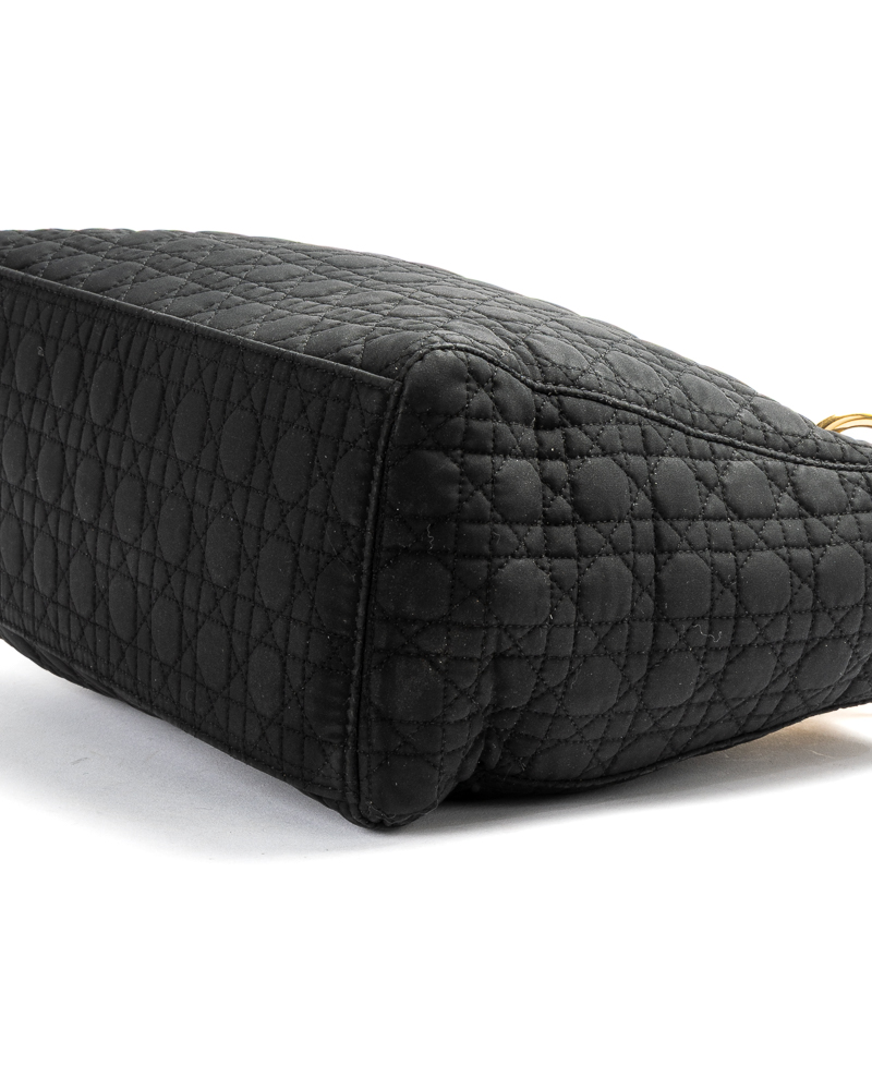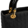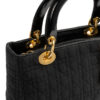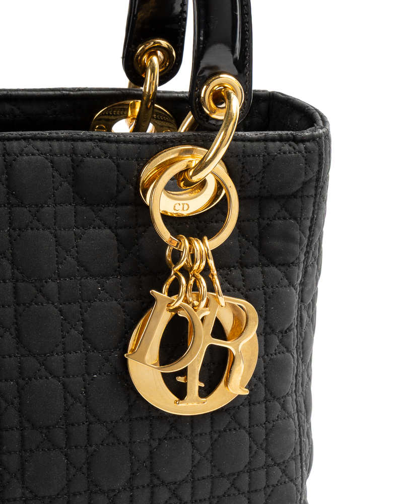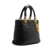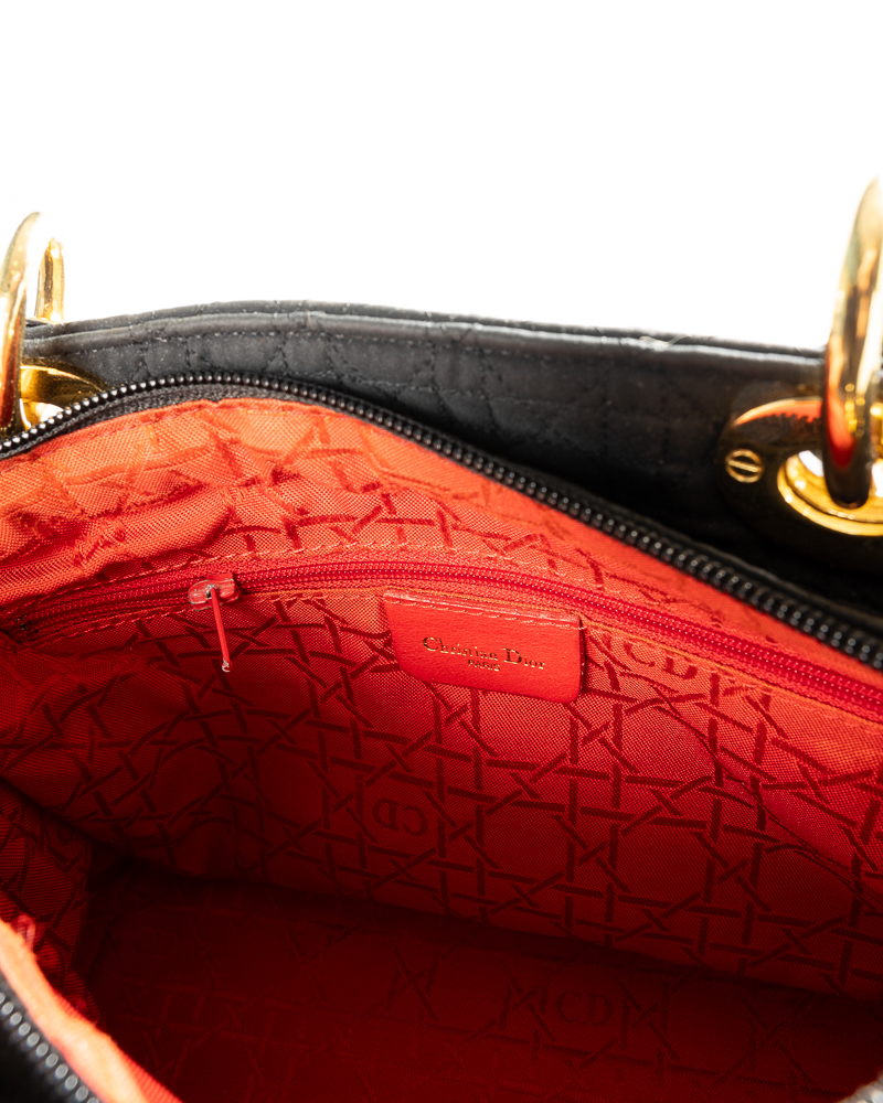 Borsa firmata Dior, linea Vintage, modello lady nella misura medium, realizzata in tessuto nero con hardware dorato. Dotata di una chiusura superiore a zip, internamente rivestita in tessuto rosso con comoda tasca, la borsa è abbastanza capiente. Munita di doppio manico in pelle, per una comoda portata a mano.  I ciondoli “D.I.O.R.” in metallo arricchiscono il design, conferendo un tocco distintivo. L’articolo si presenta in buone condizioni.