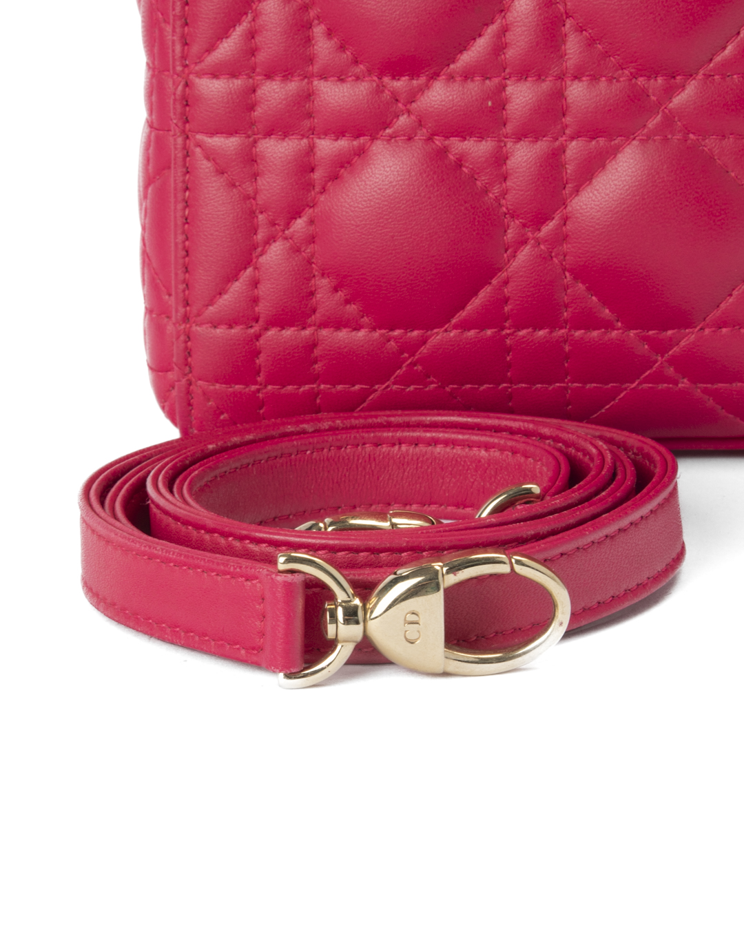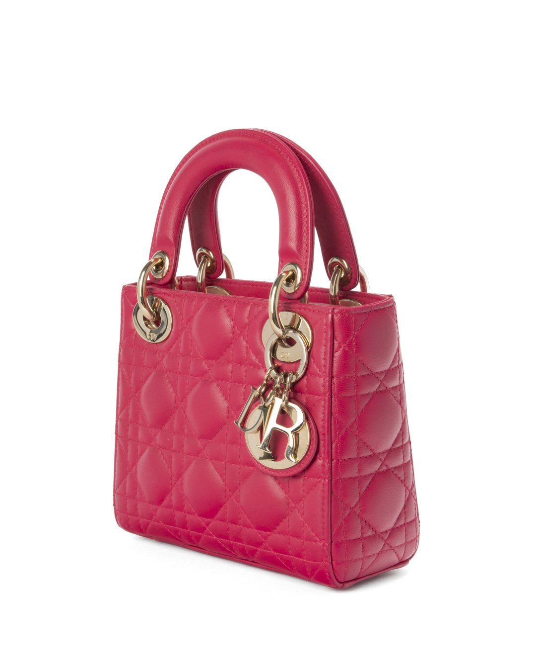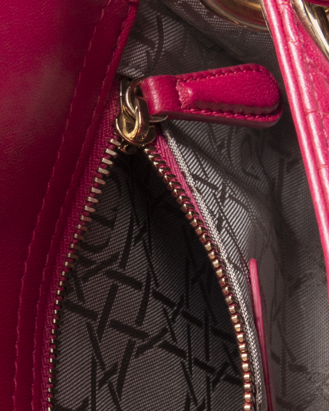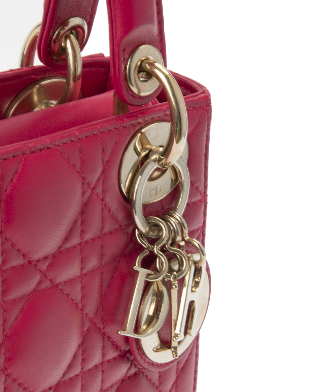 Borsa firmata Dior, modello Lady nella misura Mini, realizzata in pelle fucsia con hardware dorato. Dotata di una chiusura a patta, l’interno è rivestito in tela griga e offre una piccola tasca, la borsa è capiente per l'essenziale. La borsa presenta un doppio manico in pelle e una tracolla rimovibile, permettendo di indossarla sia a mano che a spalla. Arricchita dai ciondoli “D.I.O.R.” in metallo argentato , che aggiungono un tocco distintivo. L’articolo si presenta in ottime condizioni, con piccoli segni sulle parti metalliche.