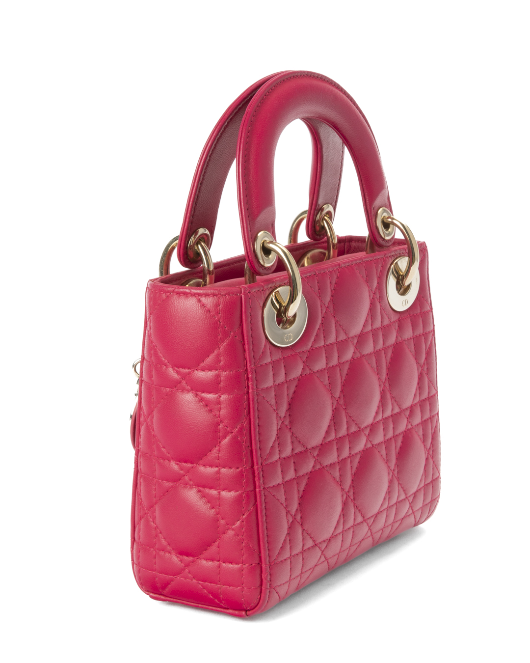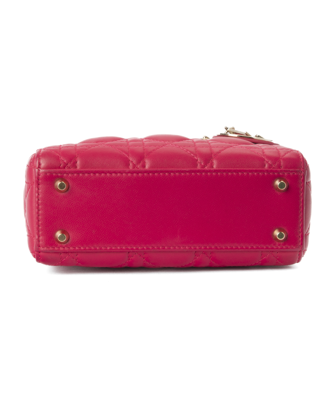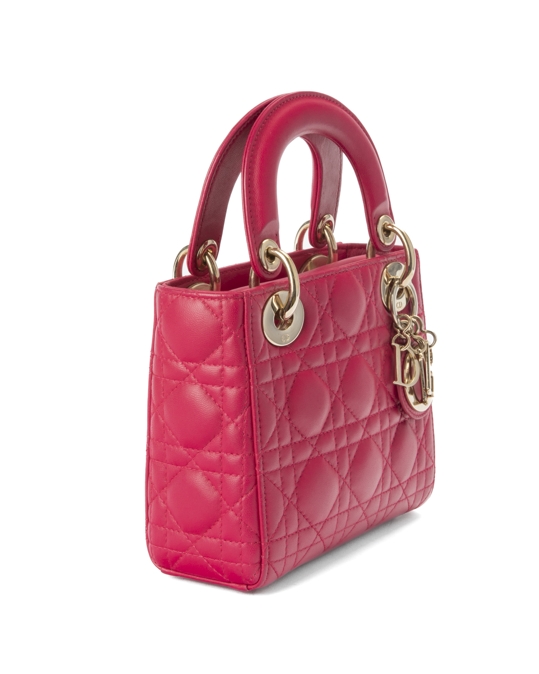 Borsa firmata Dior, modello Lady nella misura Mini, realizzata in pelle fucsia con hardware dorato. Dotata di una chiusura a patta, l’interno è rivestito in tela griga e offre una piccola tasca, la borsa è capiente per l'essenziale. La borsa presenta un doppio manico in pelle e una tracolla rimovibile, permettendo di indossarla sia a mano che a spalla. Arricchita dai ciondoli “D.I.O.R.” in metallo argentato , che aggiungono un tocco distintivo. L’articolo si presenta in ottime condizioni, con piccoli segni sulle parti metalliche.