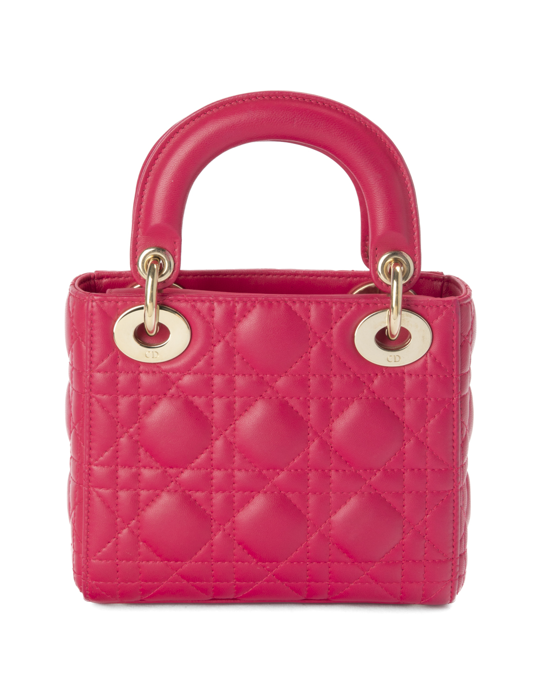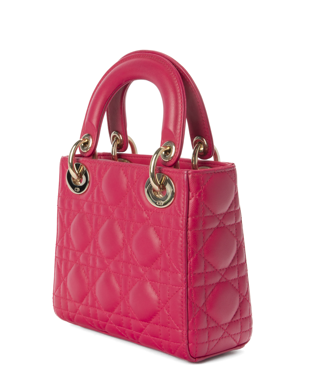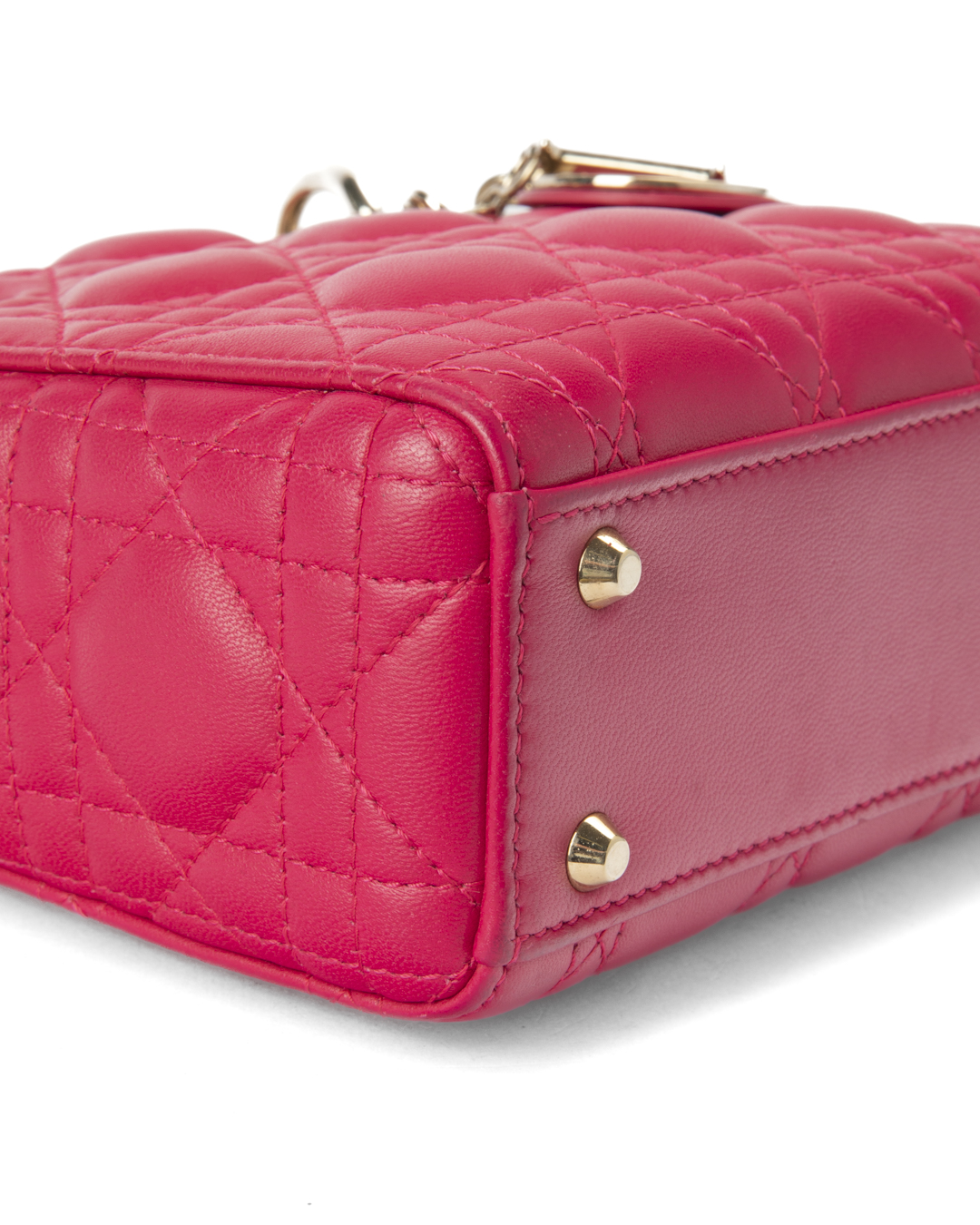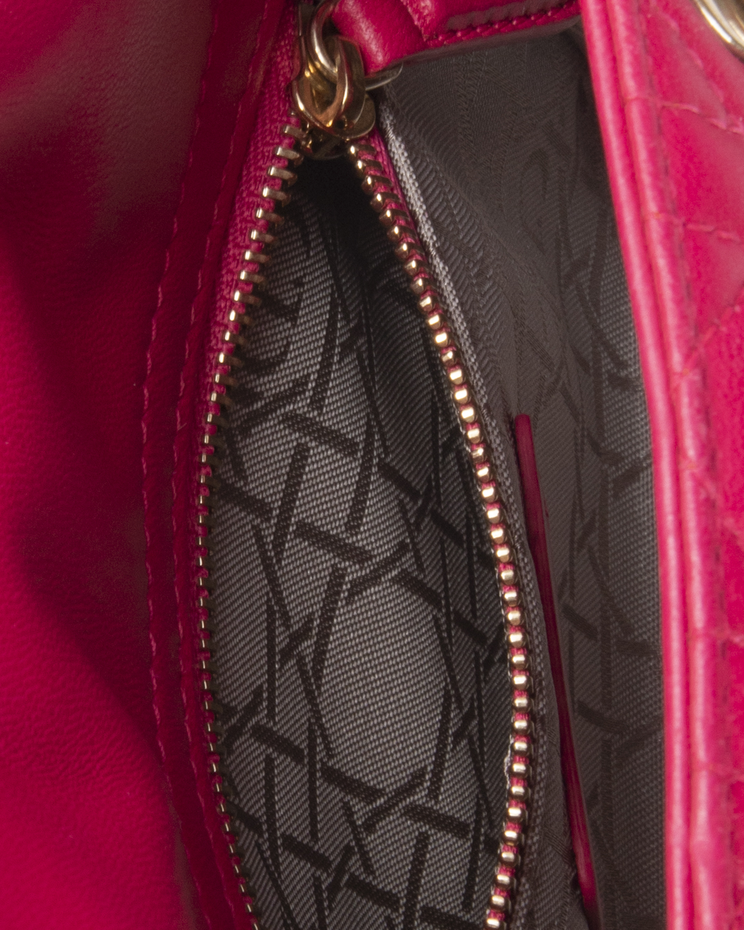 Borsa firmata Dior, modello Lady nella misura Mini, realizzata in pelle fucsia con hardware dorato. Dotata di una chiusura a patta, l’interno è rivestito in tela griga e offre una piccola tasca, la borsa è capiente per l'essenziale. La borsa presenta un doppio manico in pelle e una tracolla rimovibile, permettendo di indossarla sia a mano che a spalla. Arricchita dai ciondoli “D.I.O.R.” in metallo argentato , che aggiungono un tocco distintivo. L’articolo si presenta in ottime condizioni, con piccoli segni sulle parti metalliche.