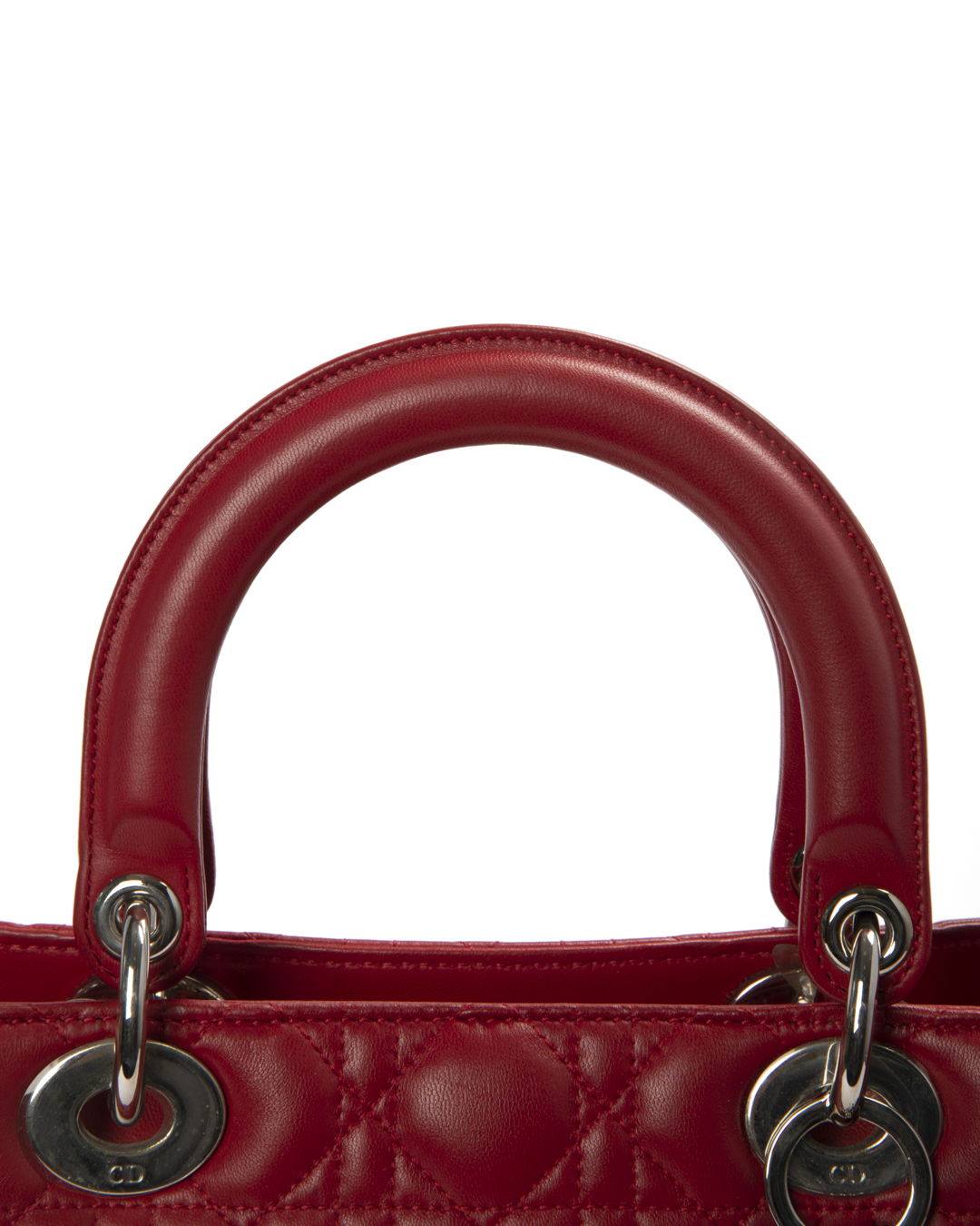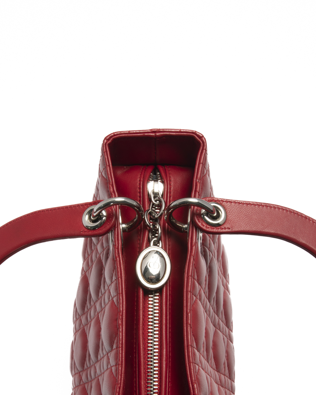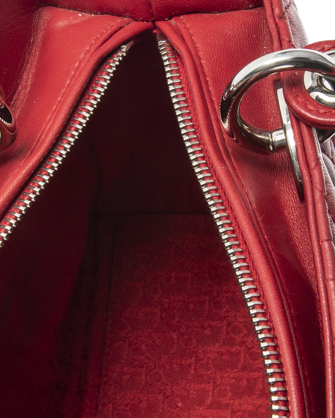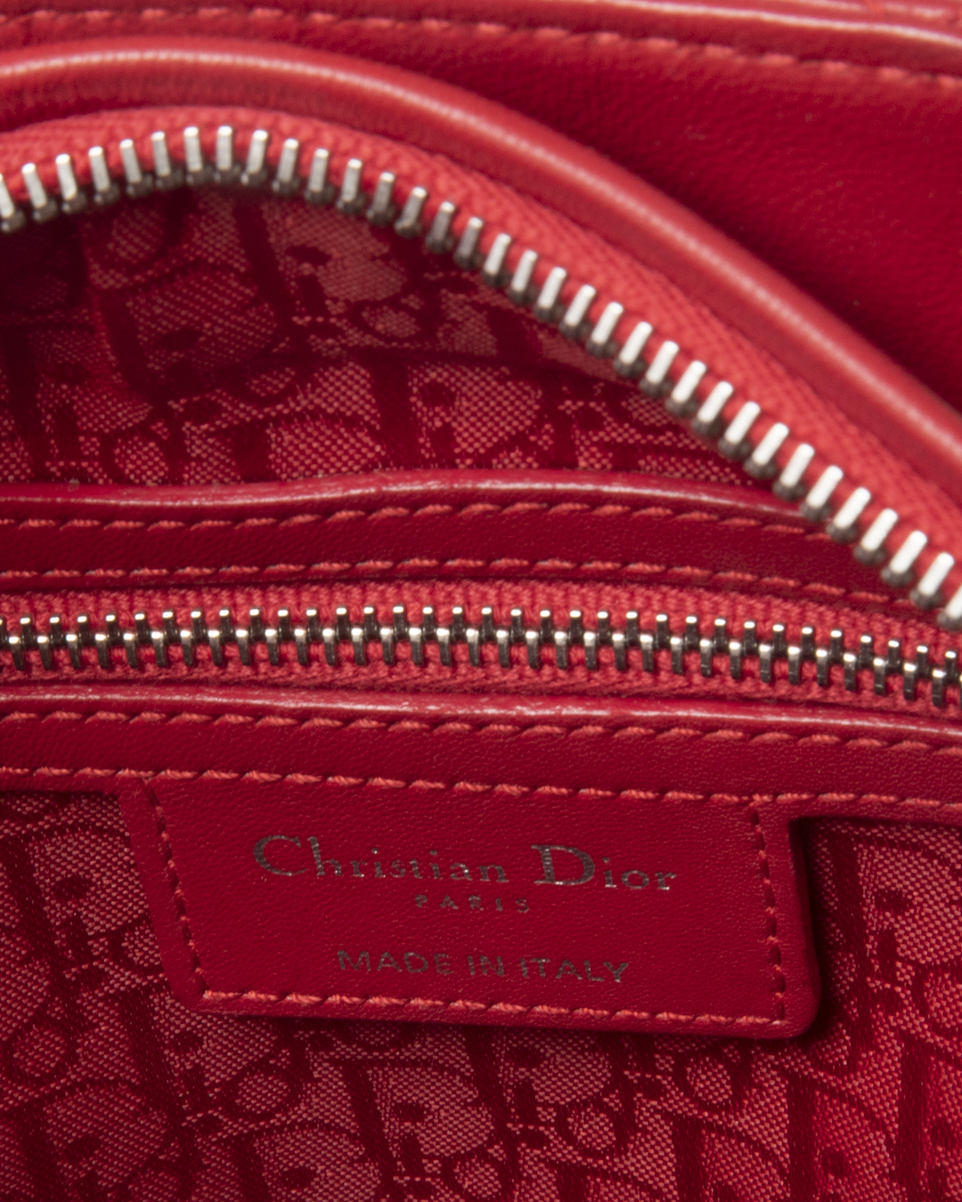 Borsa firmata Dior, modello Lady nella misura medium, realizzata in pelle rossa con motivo cannage e hardware argento. Dotata di una chiusura superiore a zip, internamente rivestita in tela rosa con comode tasche, la borsa è abbastanza capiente. Munita di doppio manico e di una tracolla rimovibile in pelle, per una comoda portata a spalla o a mano. I ciondoli “D.I.O.R.” in metallo arricchiscono il design, conferendo un tocco distintivo. L'articolo si presenta in ottime condizioni.