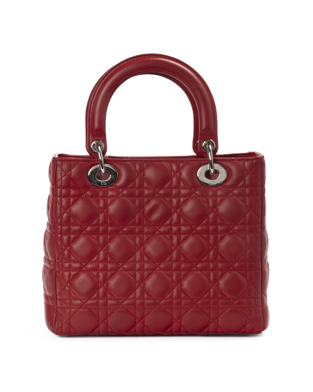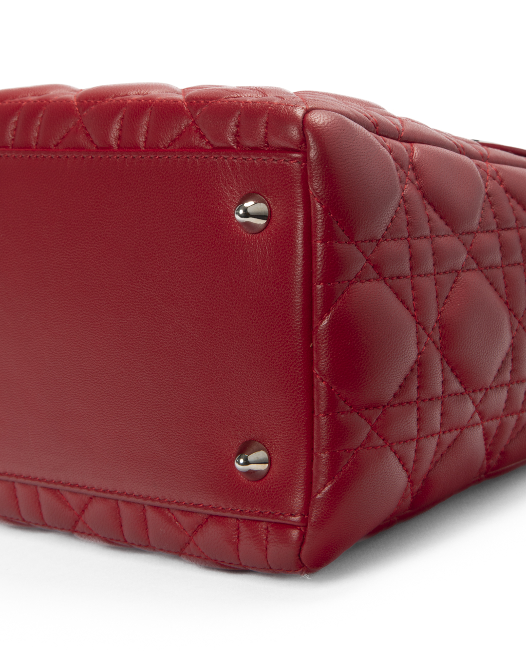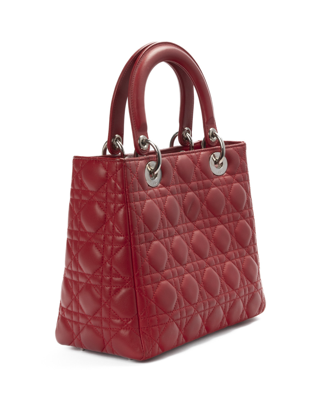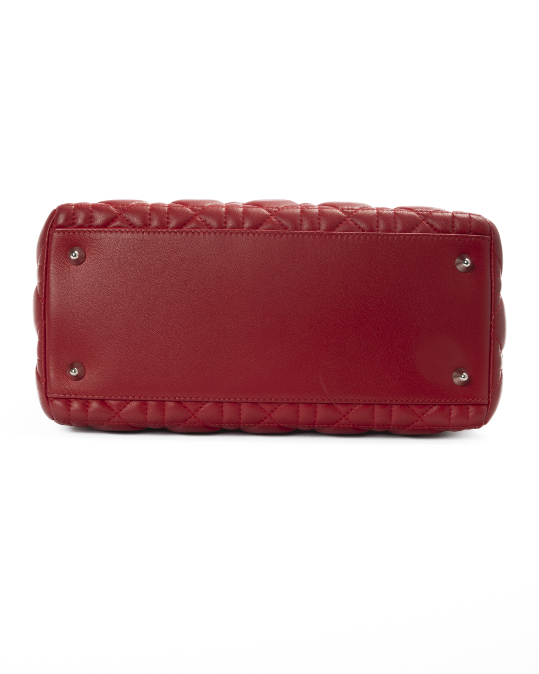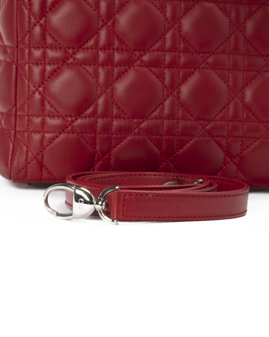 Borsa firmata Dior, modello Lady nella misura medium, realizzata in pelle rossa con motivo cannage e hardware argento. Dotata di una chiusura superiore a zip, internamente rivestita in tela rosa con comode tasche, la borsa è abbastanza capiente. Munita di doppio manico e di una tracolla rimovibile in pelle, per una comoda portata a spalla o a mano. I ciondoli “D.I.O.R.” in metallo arricchiscono il design, conferendo un tocco distintivo. L'articolo si presenta in ottime condizioni.