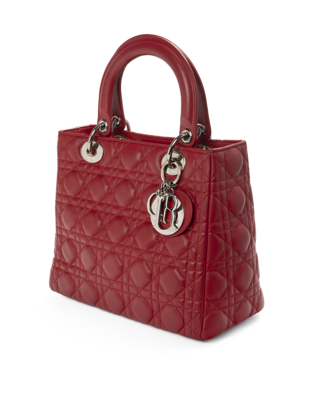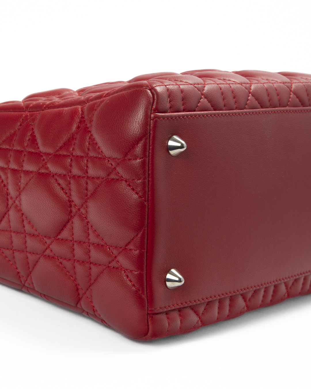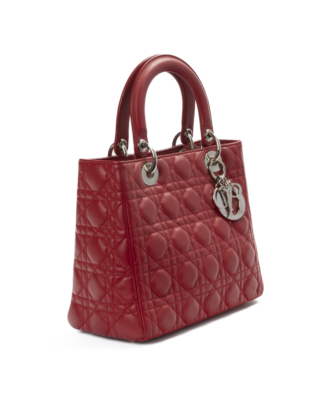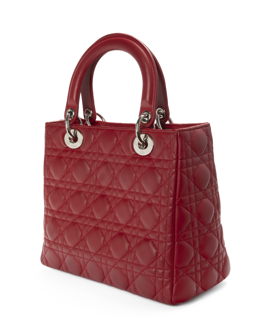 Borsa firmata Dior, modello Lady nella misura medium, realizzata in pelle rossa con motivo cannage e hardware argento. Dotata di una chiusura superiore a zip, internamente rivestita in tela rosa con comode tasche, la borsa è abbastanza capiente. Munita di doppio manico e di una tracolla rimovibile in pelle, per una comoda portata a spalla o a mano. I ciondoli “D.I.O.R.” in metallo arricchiscono il design, conferendo un tocco distintivo. L'articolo si presenta in ottime condizioni.