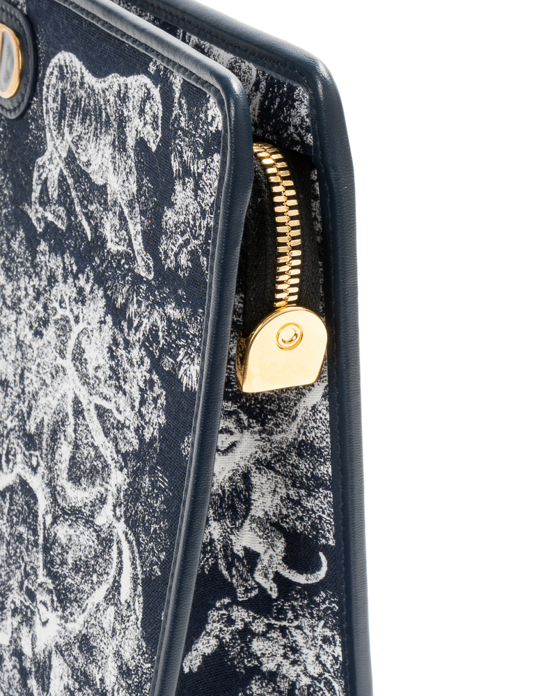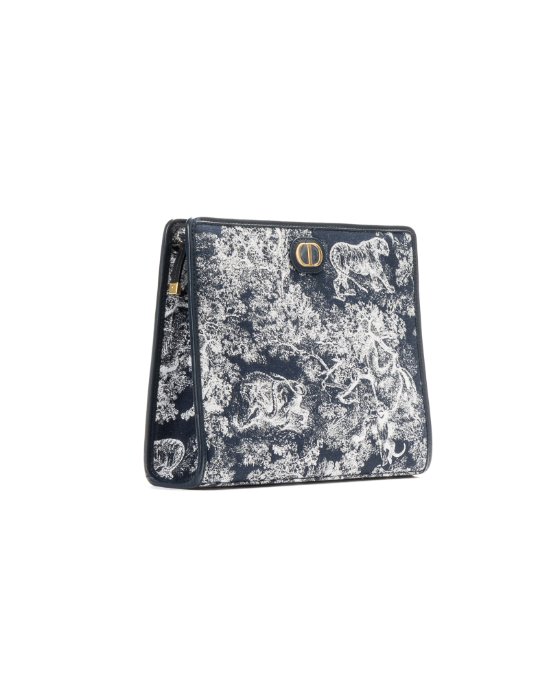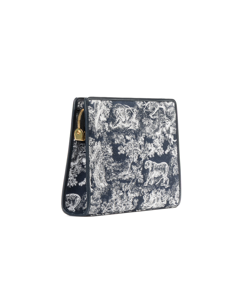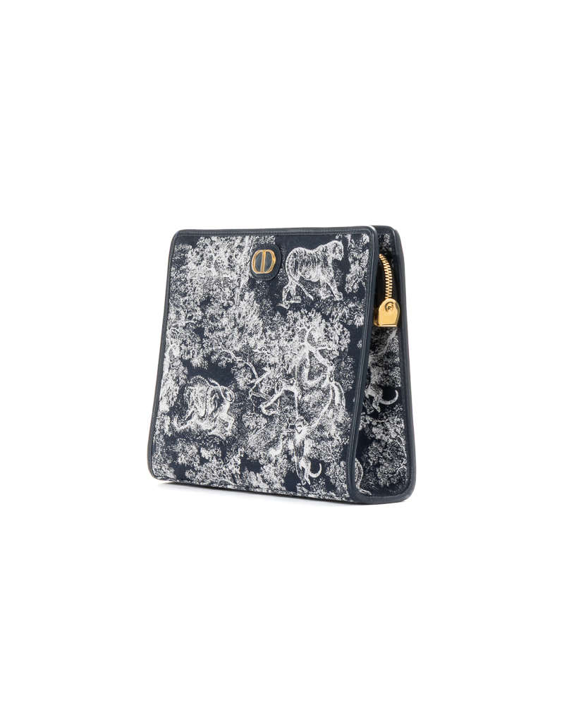 Pochette firmata Dior, modello Dea 30 Montaigne, realizzata in tela nella fantasia Toile con inserti in pelle blu e hardware dorato. Dotata di una chiusura superiore a zip, internamente rivestita in nylon tono su tono con comode fessure e tasca, la pochette è abbastanza capiente. Arricchita dal classico logo del brand “CD” in metallo oro. L’articolo si presenta in condizioni pari al nuovo.