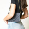 Pochette firmata Dior, linea Vintage, realizzata in tela grigia con motivo Honeycomb con rifiniture in pelle e hardware dorato. Dotata di una patta con classico logo del brand e chiusura a clip, internamente rivestita in pelle tono su tono con comoda tasca, la pochette è capiente per l’essenziale. Completa di una tracolla in catena dorata, per una comoda portata a spalla o a mano come clutch. L’articolo si presenta in buone condizioni.