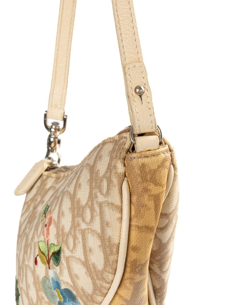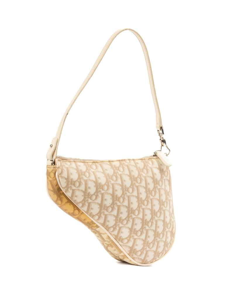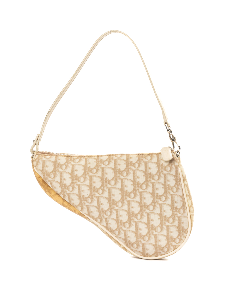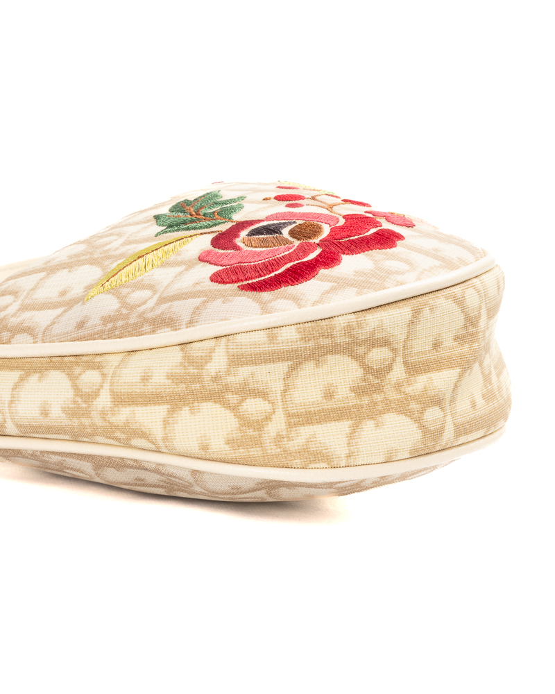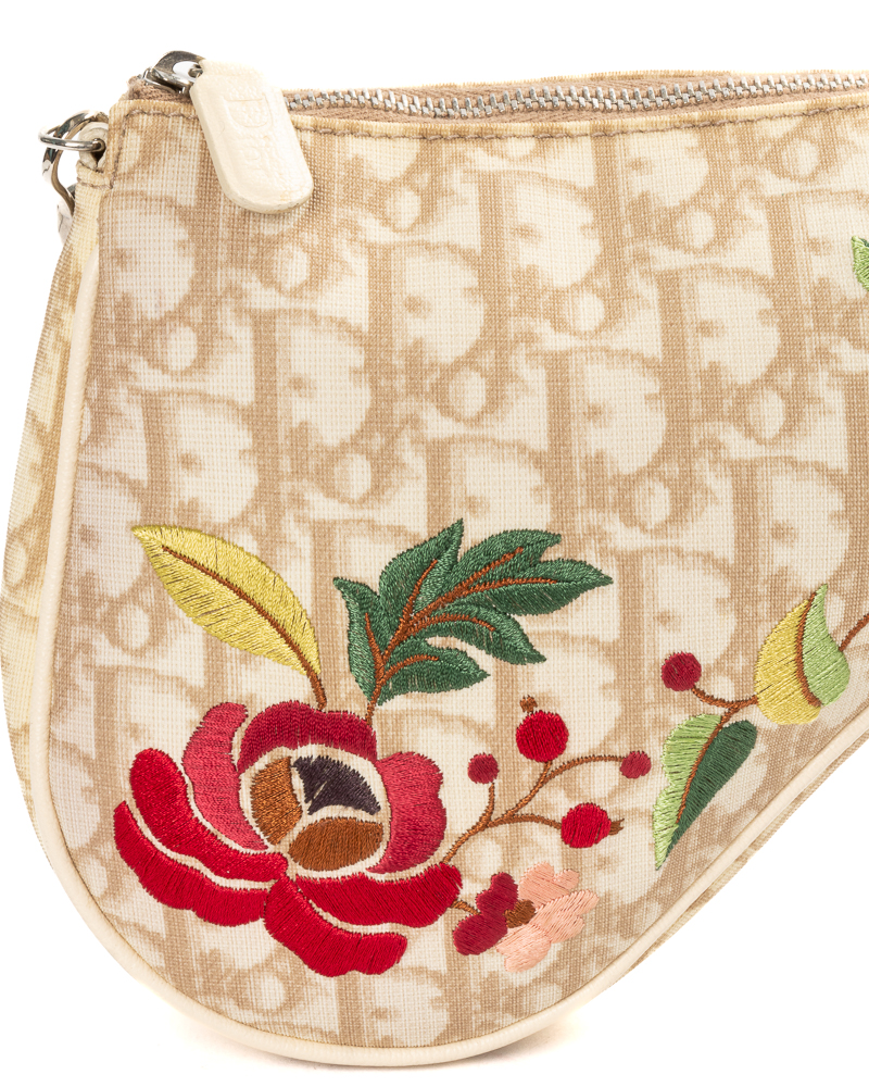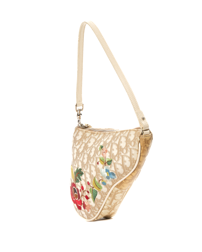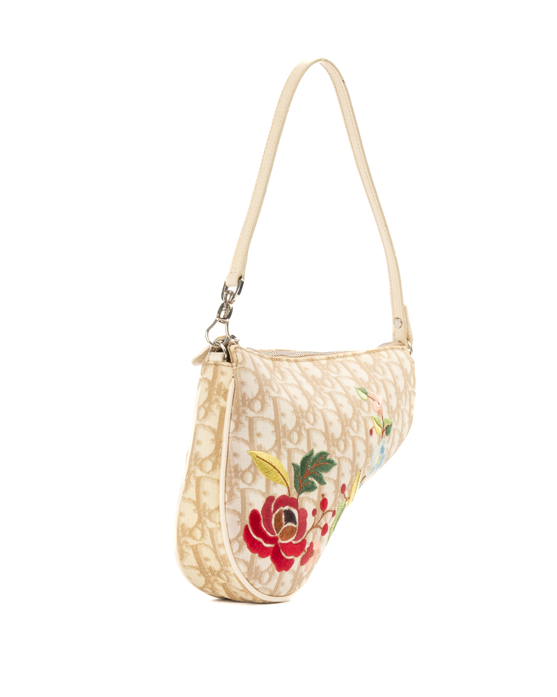 Borsa firmata Dior, modello saddle flora mini, realizzata in tela nella fantasia Jacquard beige con rifiniture in pelle e hardware argento. Dotata di una chiusura superiore a zip, internamente rivestita in tela beige, la borsa è capiente per l'essenziale. Munita di un manico sottile in pelle, per una comoda portata a spalla o a mano. Arricchita da un ricamo in rilievo sulla parte frontale. L'articolo si presenta in buone condizioni.