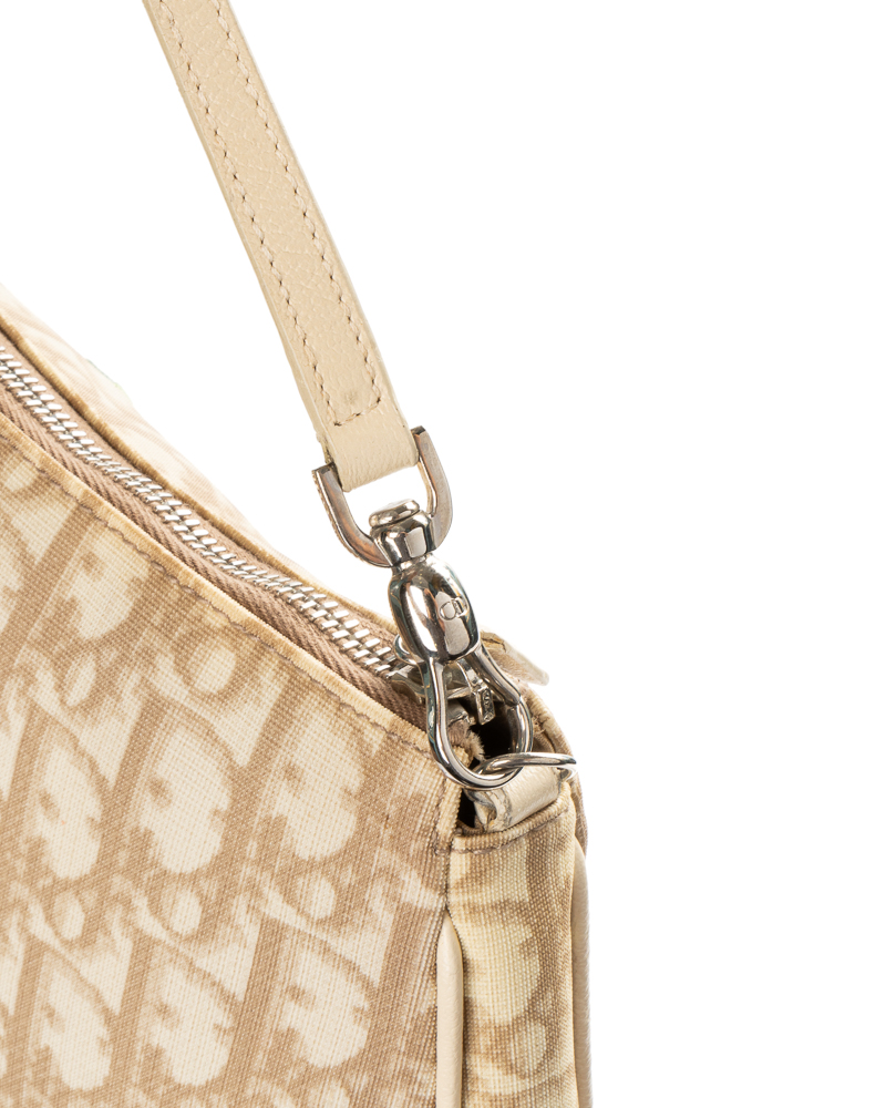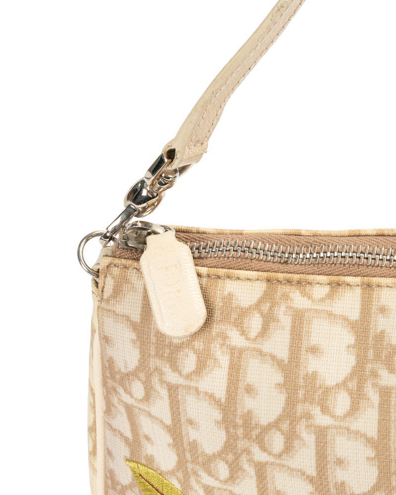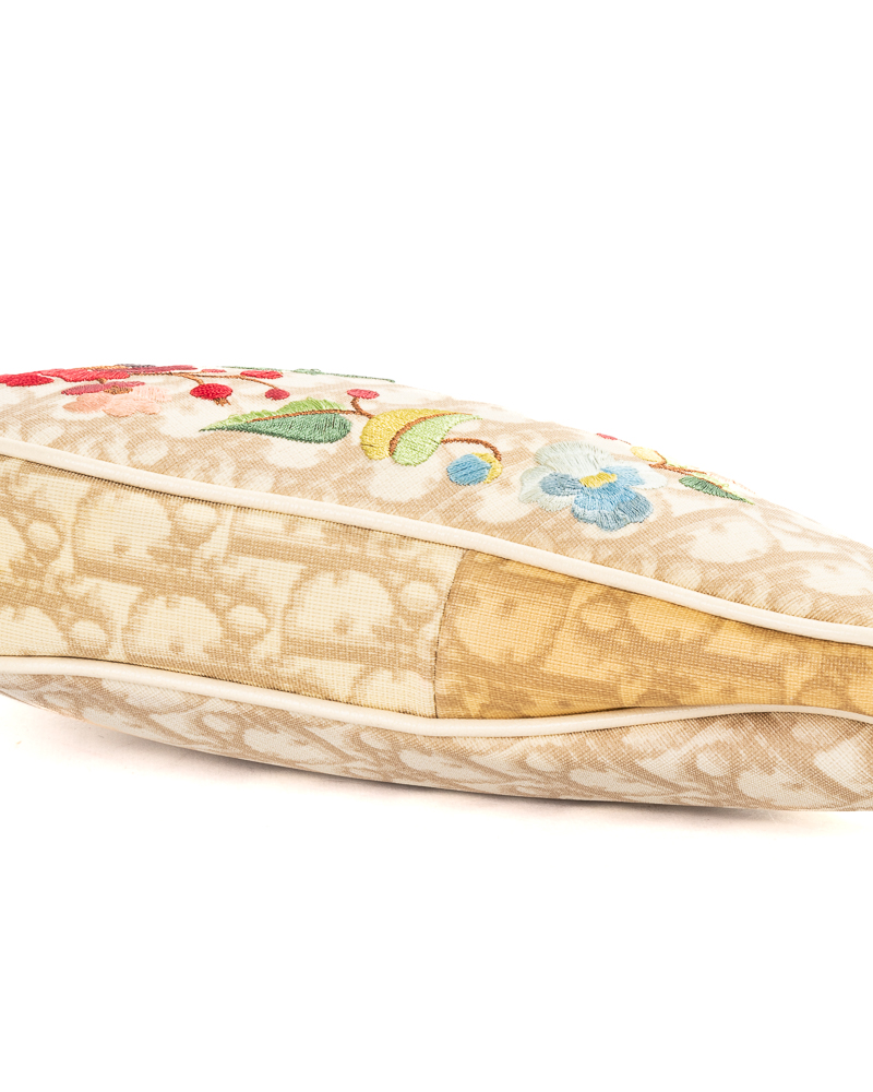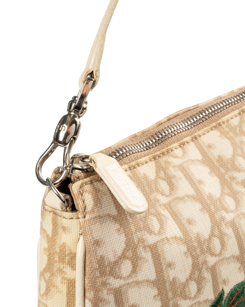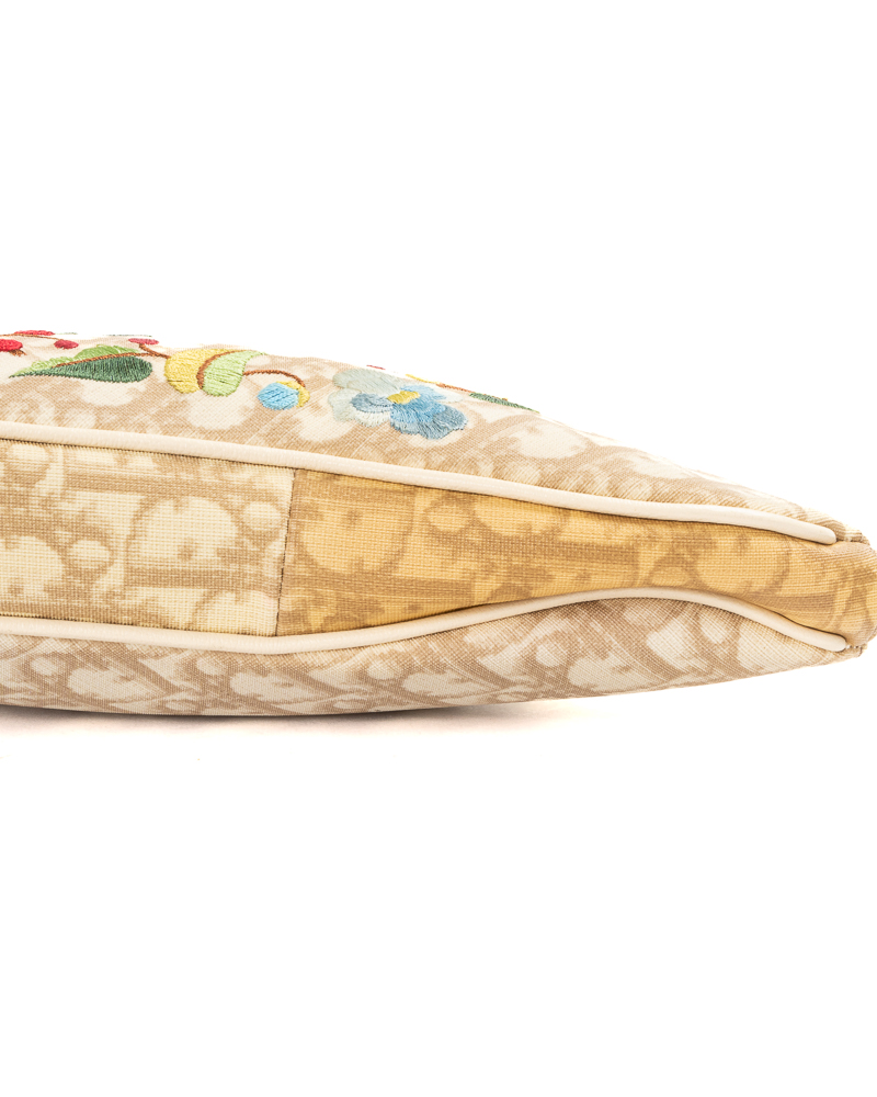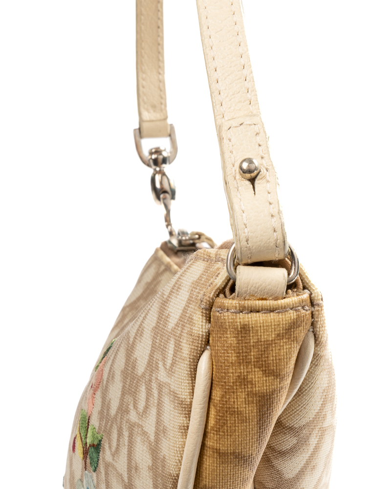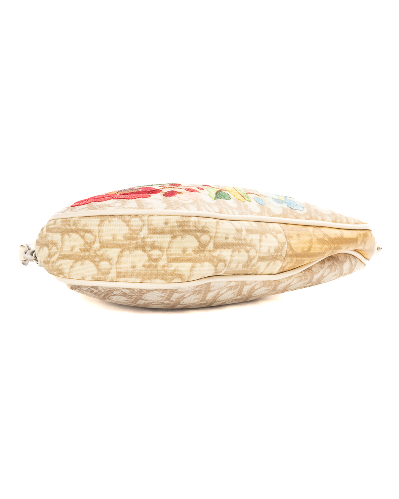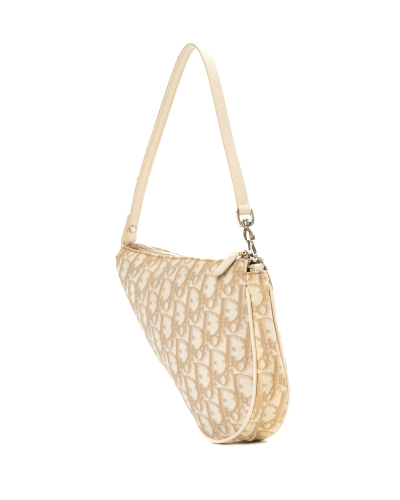 Borsa firmata Dior, modello saddle flora mini, realizzata in tela nella fantasia Jacquard beige con rifiniture in pelle e hardware argento. Dotata di una chiusura superiore a zip, internamente rivestita in tela beige, la borsa è capiente per l'essenziale. Munita di un manico sottile in pelle, per una comoda portata a spalla o a mano. Arricchita da un ricamo in rilievo sulla parte frontale. L'articolo si presenta in buone condizioni.
