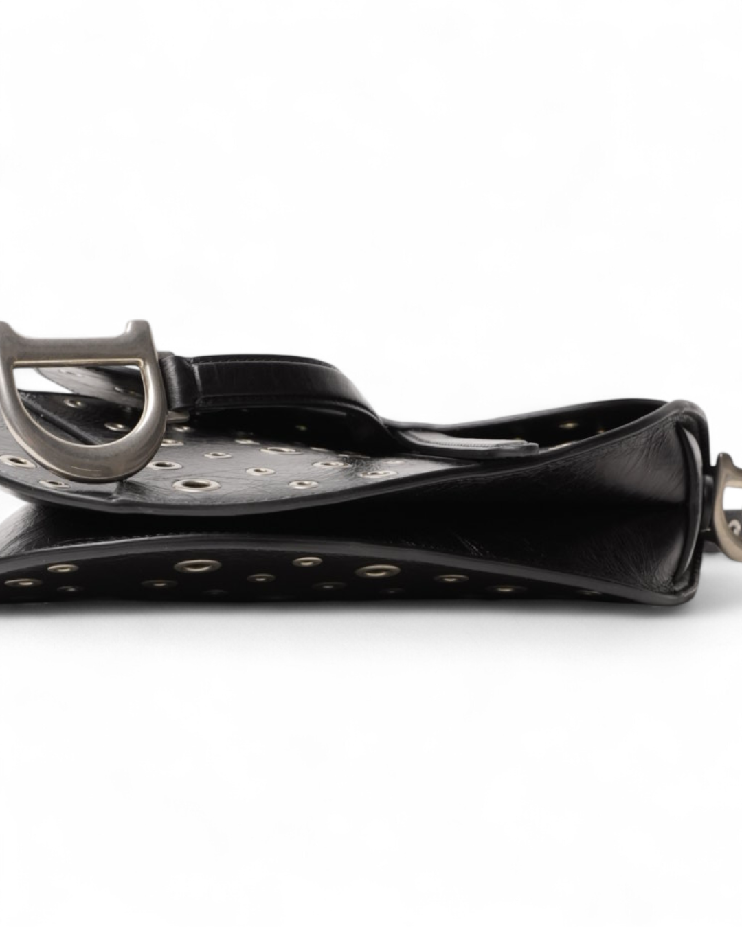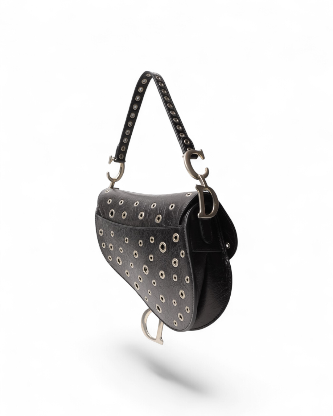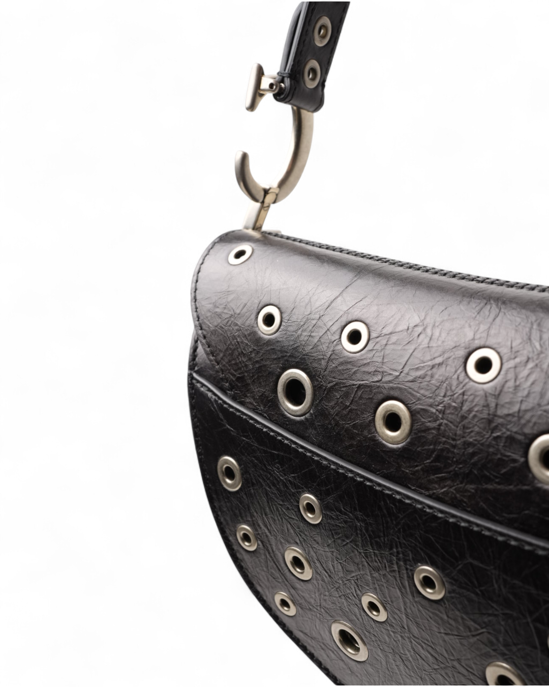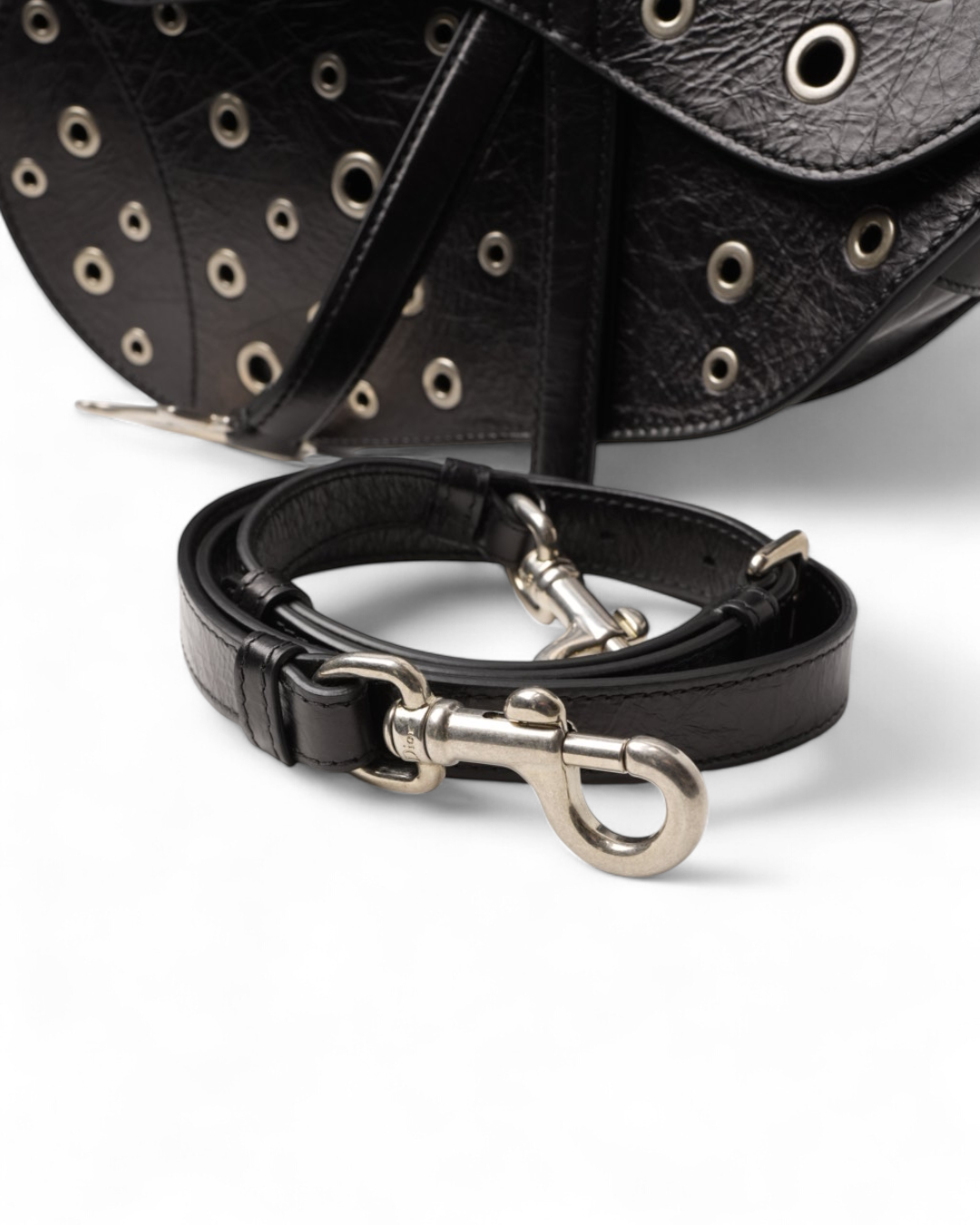 Borsa firmata Dior, modello Saddel Strap nella misura medium, realizzata in pelle nera arricchita da borchie e hardware argento. La patta frontale è dotata di una fascetta con chiusura magnetica a forma di “D”, internamente rivestita in pelle tono su tono, la borsa è abbastanza capiente. Il manico in pelle è accentuato dalle iniziali “CD” in metallo su entrambi i lati, munita di una tracolla rimovibile e regolabile, per una comoda portata a mano o a spalla. L’articolo si presenta in condizioni pari al nuovo.
