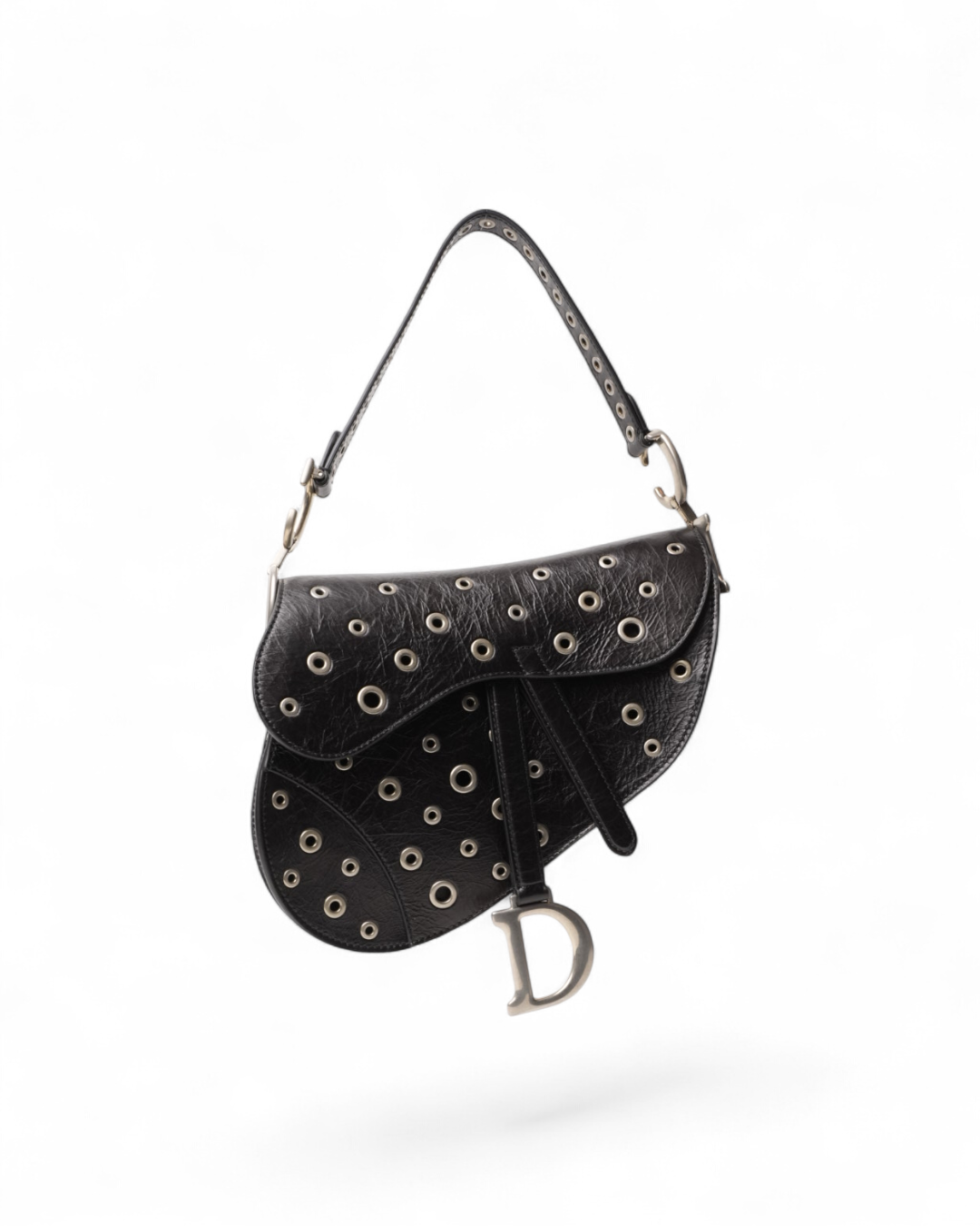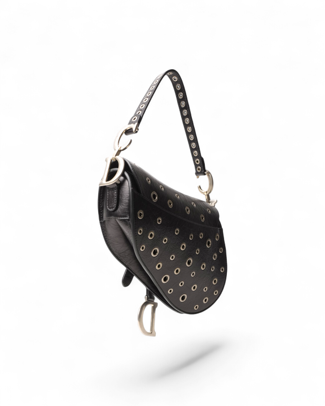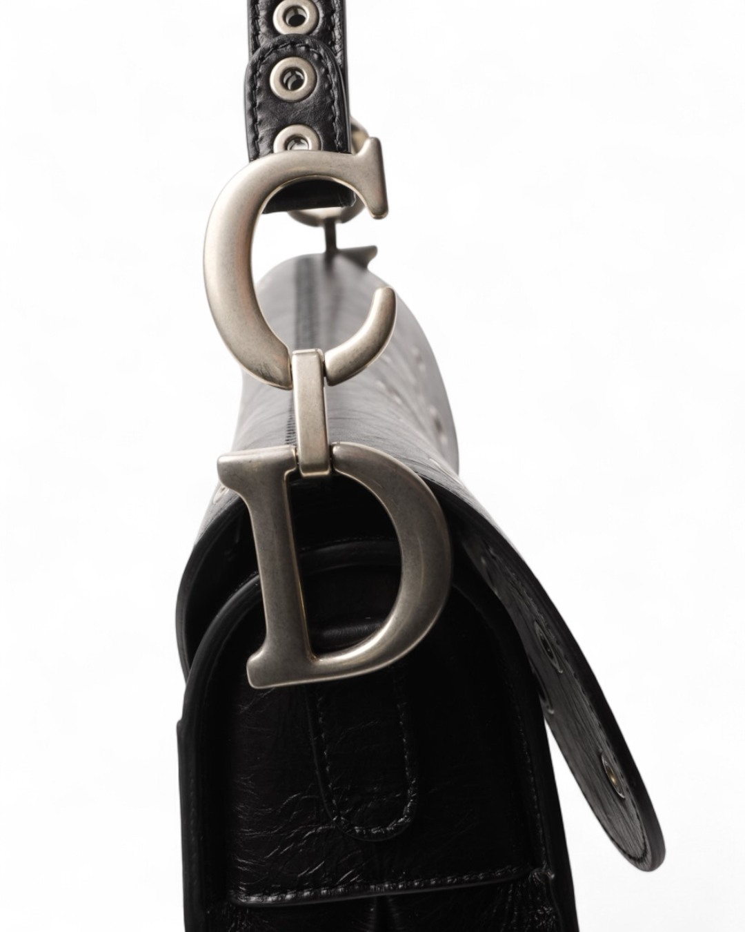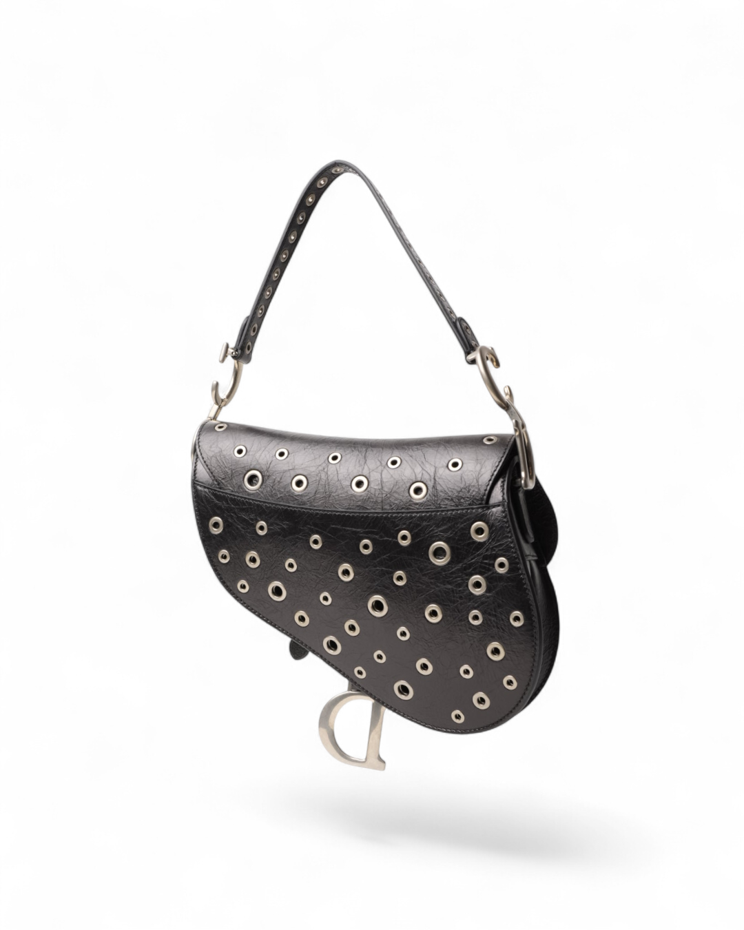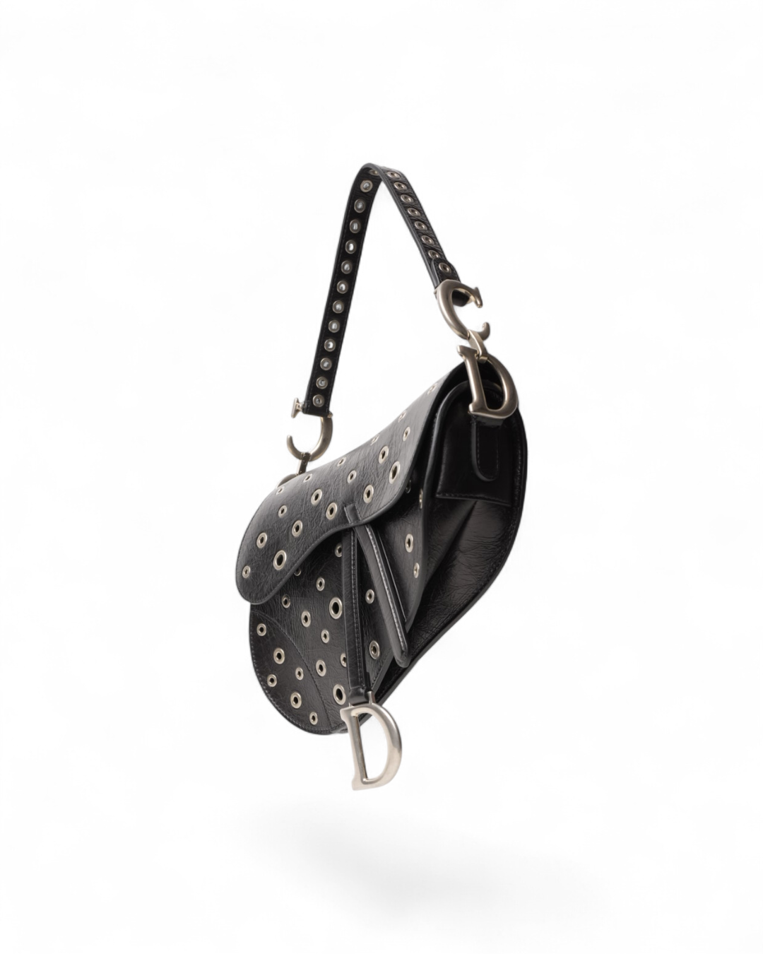 Borsa firmata Dior, modello Saddel Strap nella misura medium, realizzata in pelle nera arricchita da borchie e hardware argento. La patta frontale è dotata di una fascetta con chiusura magnetica a forma di “D”, internamente rivestita in pelle tono su tono, la borsa è abbastanza capiente. Il manico in pelle è accentuato dalle iniziali “CD” in metallo su entrambi i lati, munita di una tracolla rimovibile e regolabile, per una comoda portata a mano o a spalla. L’articolo si presenta in condizioni pari al nuovo.