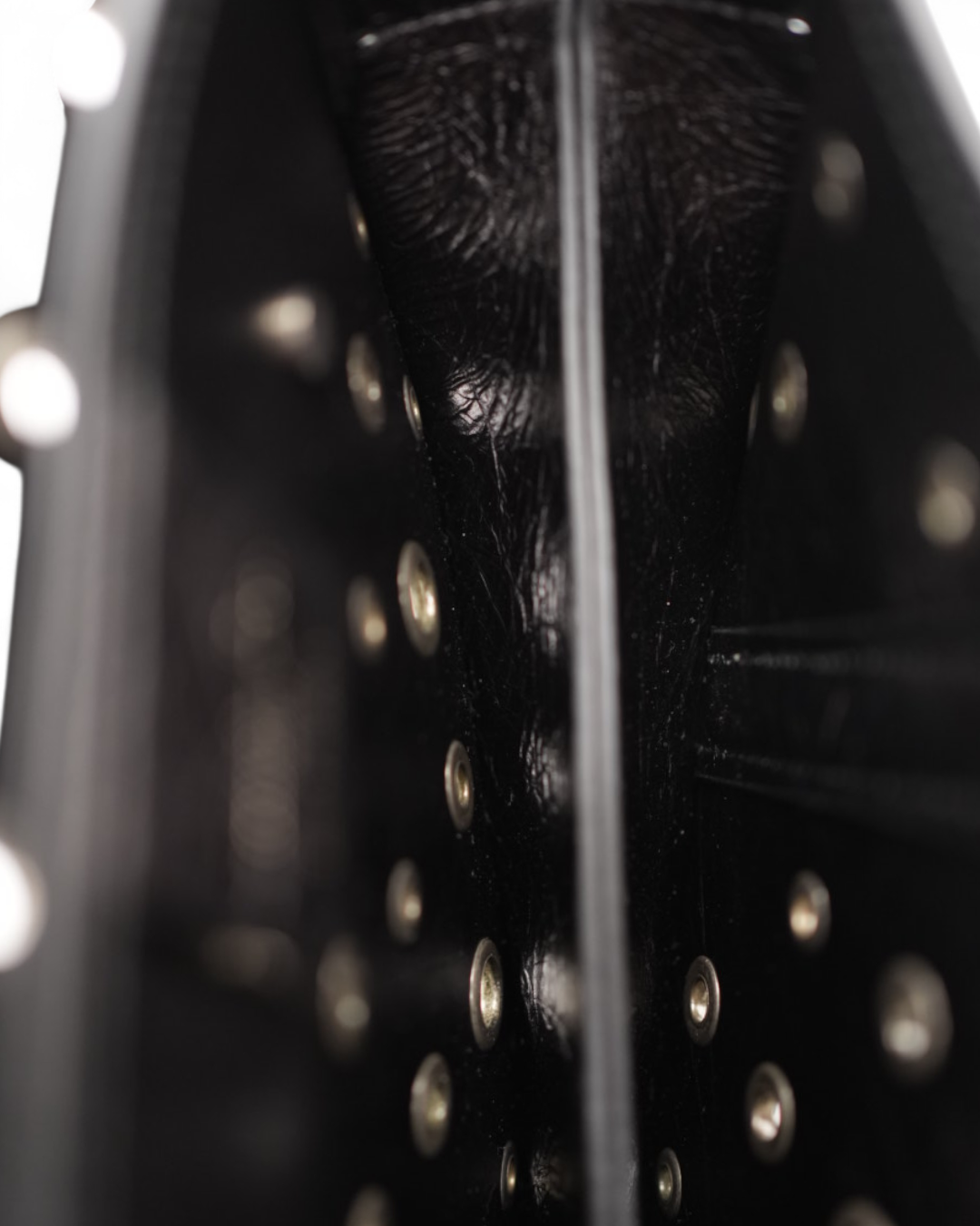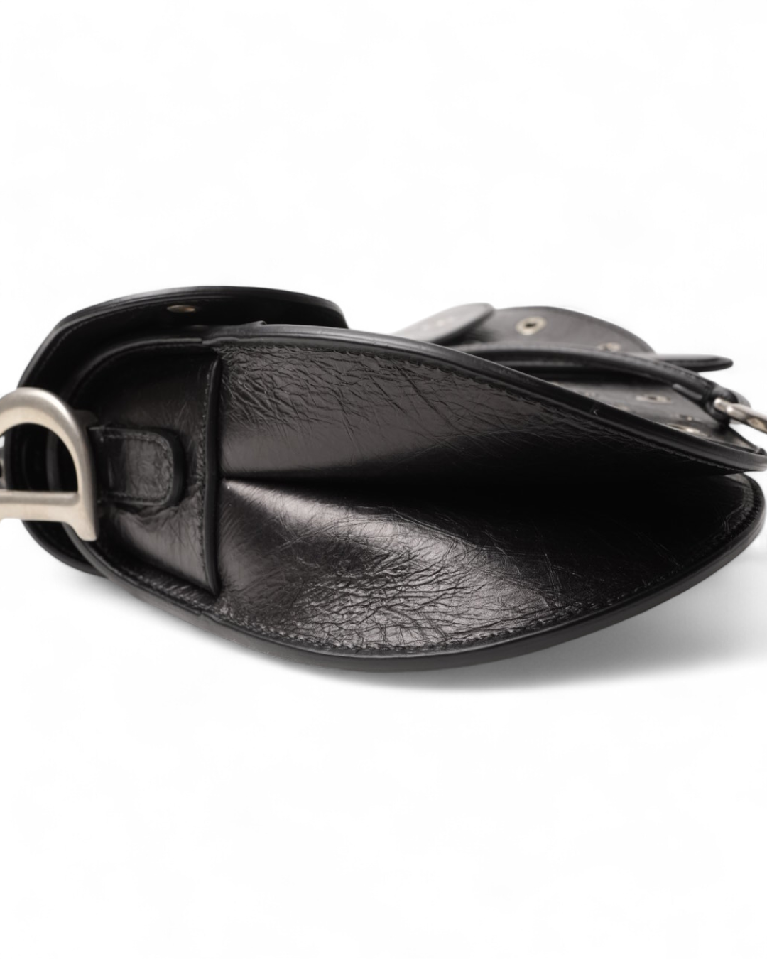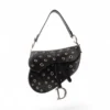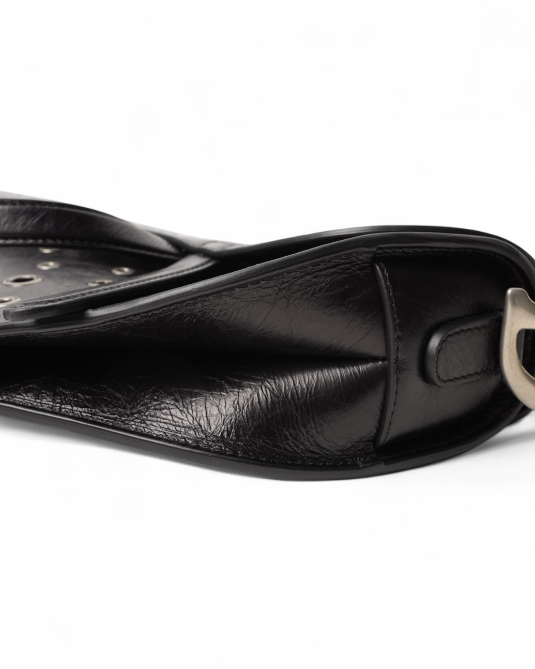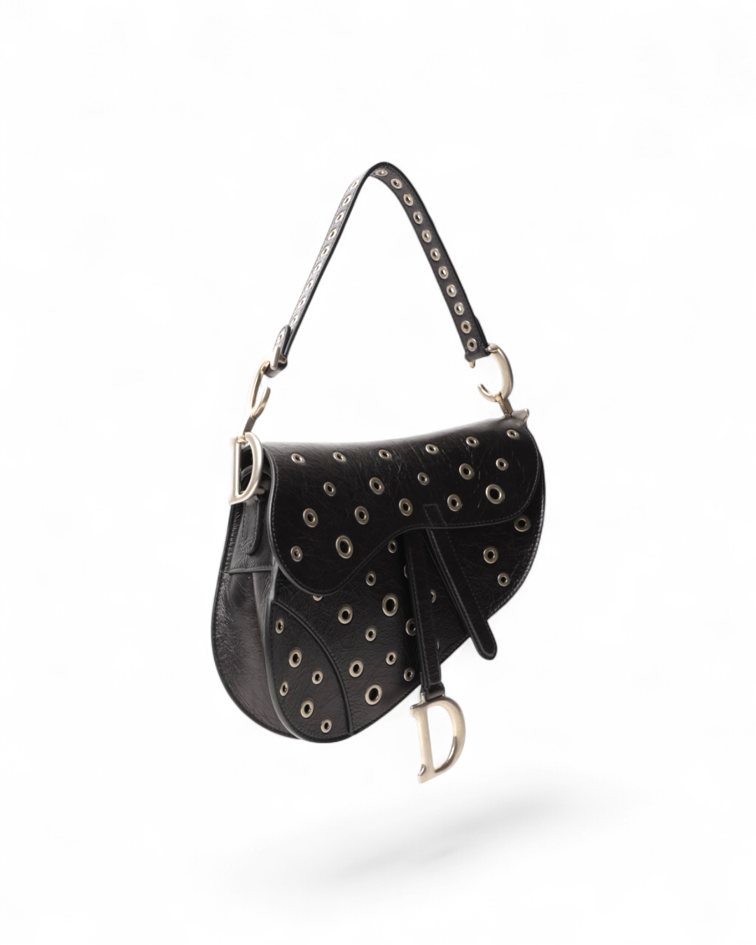 Borsa firmata Dior, modello Saddel Strap nella misura medium, realizzata in pelle nera arricchita da borchie e hardware argento. La patta frontale è dotata di una fascetta con chiusura magnetica a forma di “D”, internamente rivestita in pelle tono su tono, la borsa è abbastanza capiente. Il manico in pelle è accentuato dalle iniziali “CD” in metallo su entrambi i lati, munita di una tracolla rimovibile e regolabile, per una comoda portata a mano o a spalla. L’articolo si presenta in condizioni pari al nuovo.