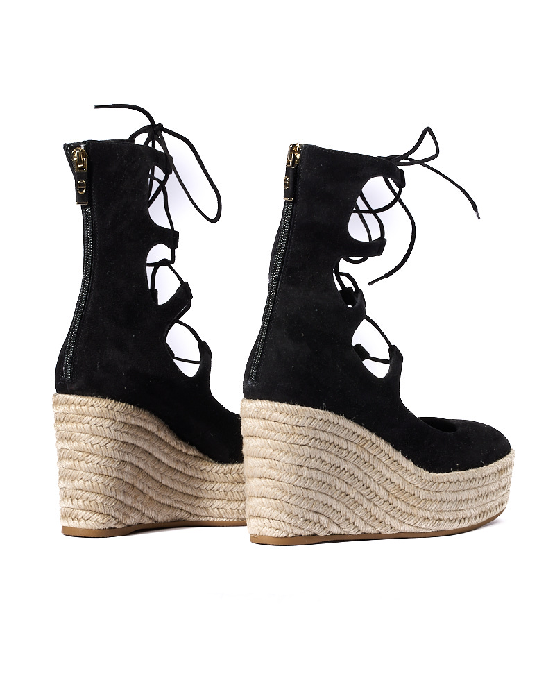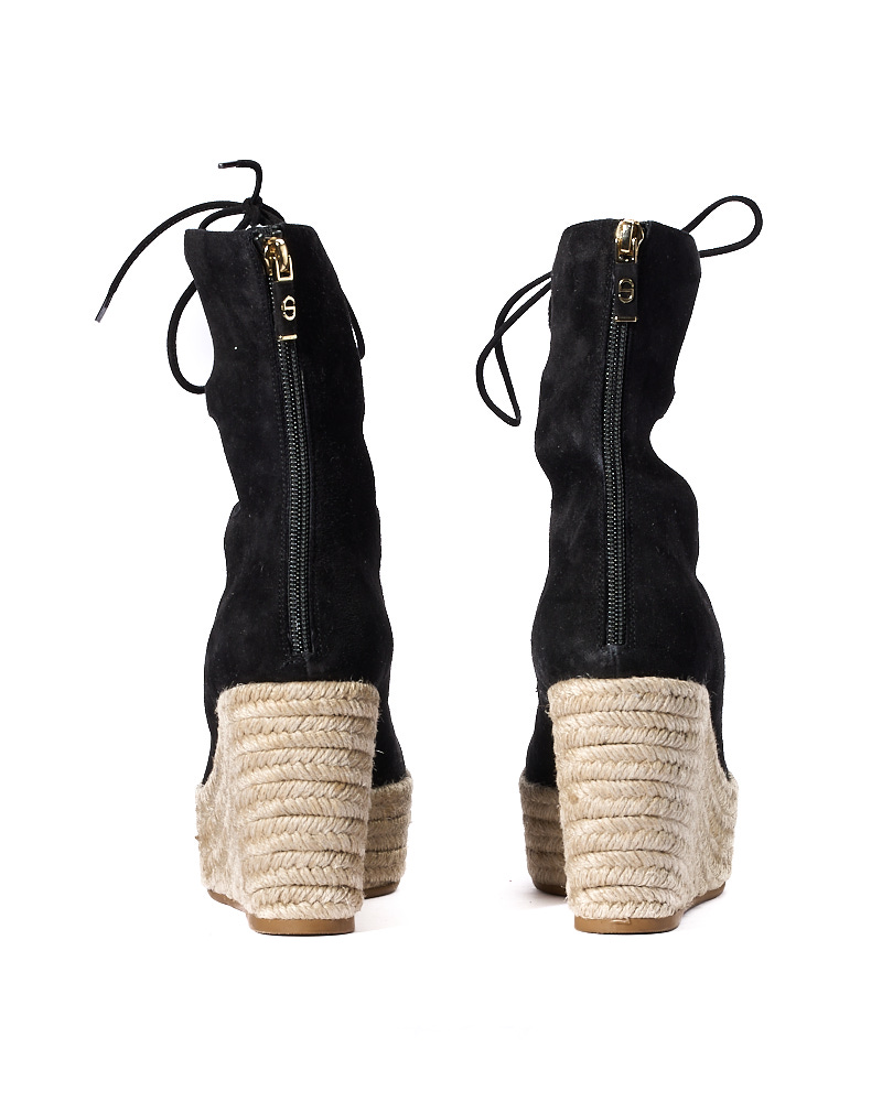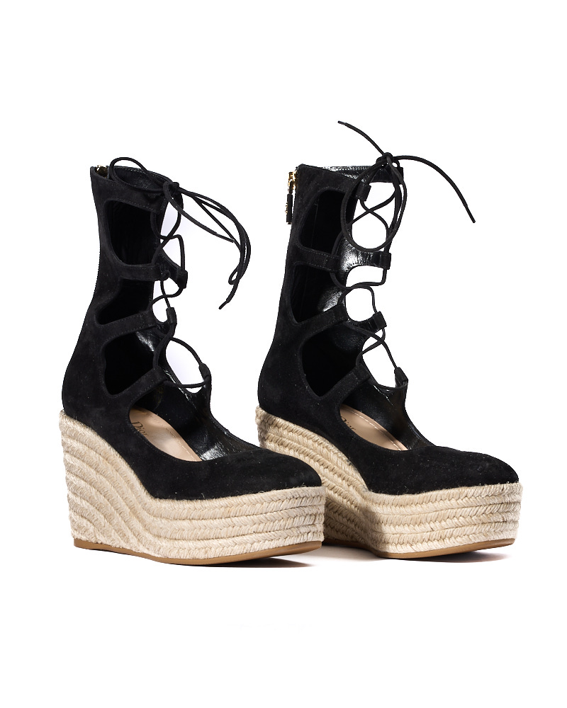 Sandalo firmato Dior, modello espadrillas alta, realizzato in rafia e tessuto scamosciato nero. Dotato di doppia chiusura a zip sul retro e intreccio regolabile sul davanti. Munito di tacco alto da 9,5 cm. Misura 36,5 IT. L’articolo si presenta in ottime condizioni.